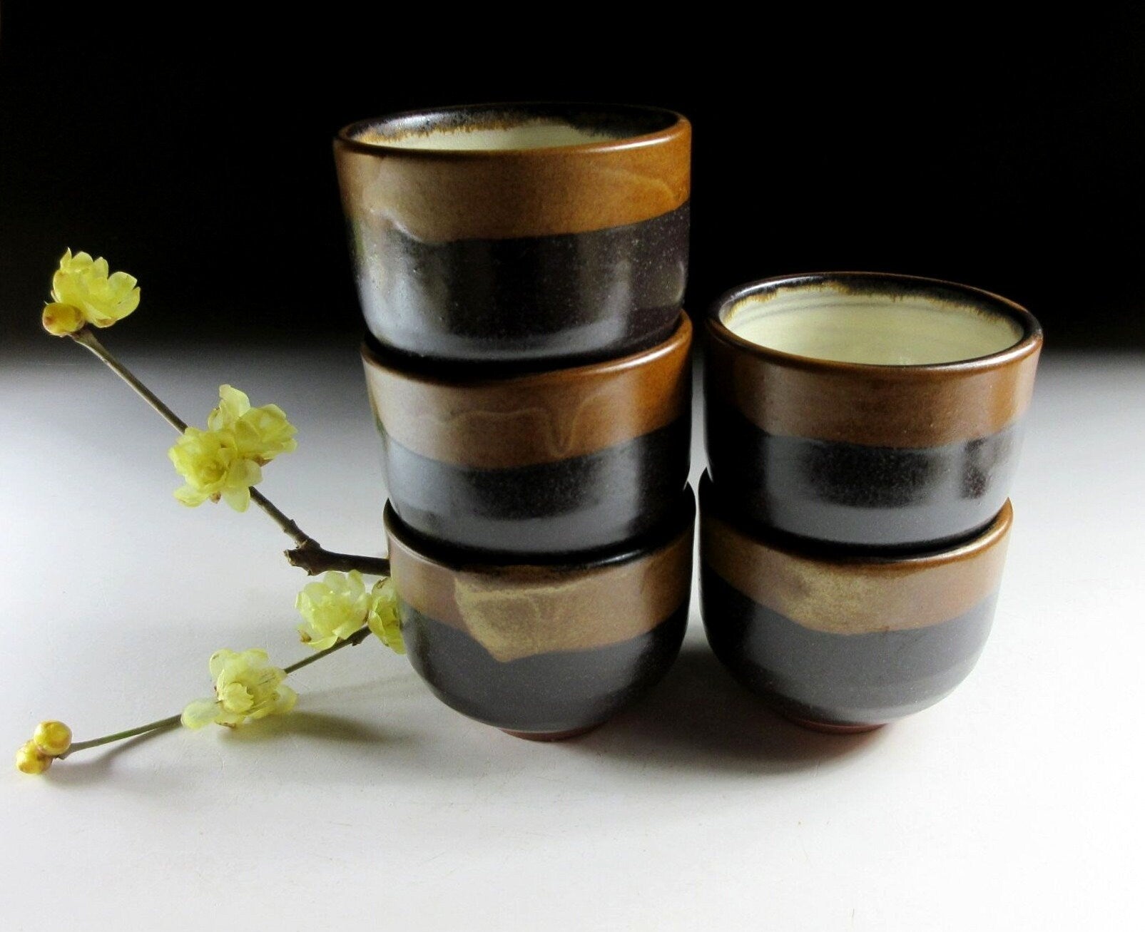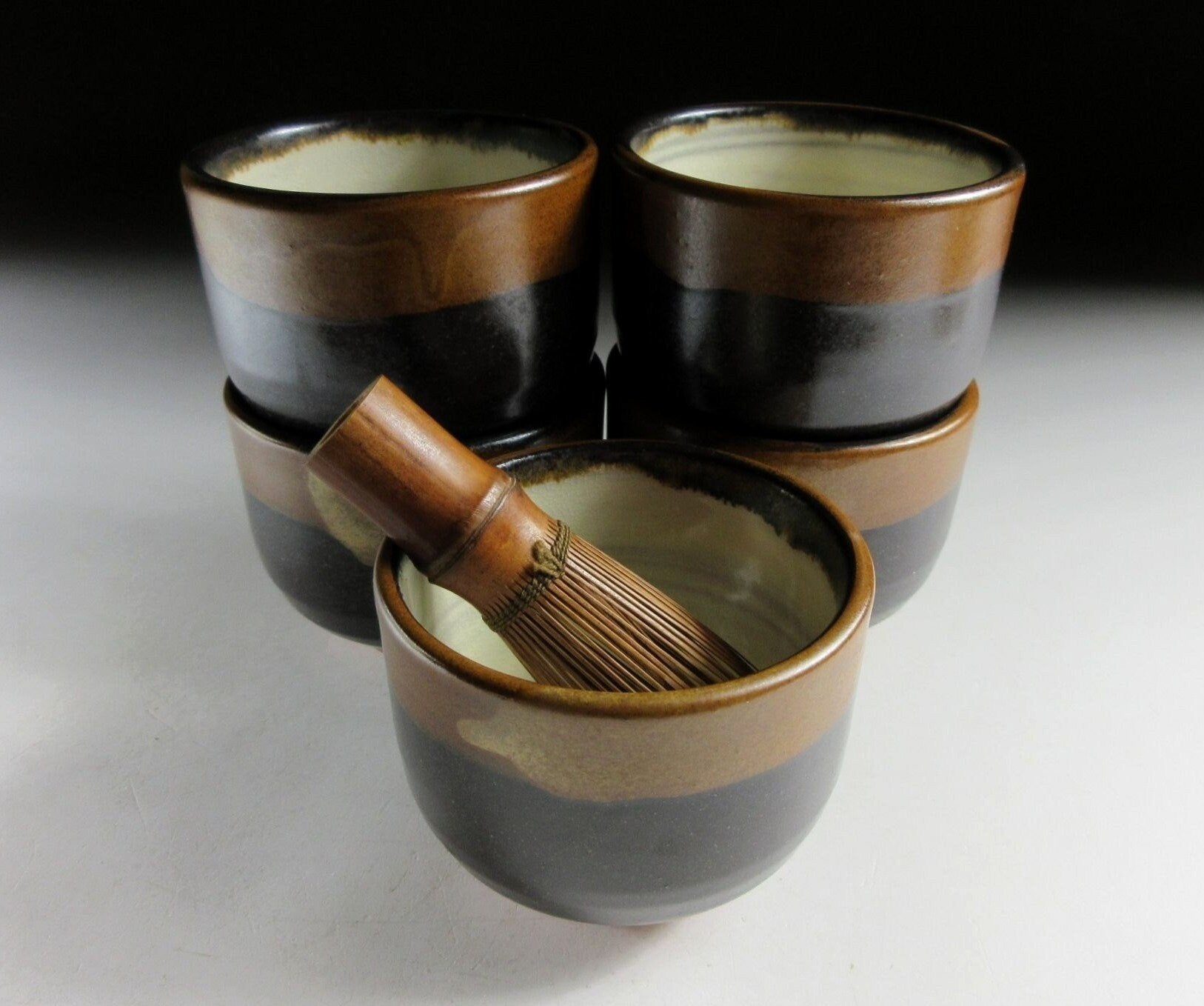 This listing is for a set of five Satsuma-ware tea cups made around 20 years ago by Nagata Gama. They are wheel-thrown and made from reddish coloured stoneware clay. Each cup is coated in dark coloured glaze with a ring of bring around the top. The interior of the cups feature white slip, and the set is fired at a high temperature making them durable enough for daily use. The stamp of the potter can be found on the bottom of each cup, and they come with their original signed wooden storage box. *PLEASE NOTE THAT THE CHASEN TEA WHISK IS NOT INCLUDED.