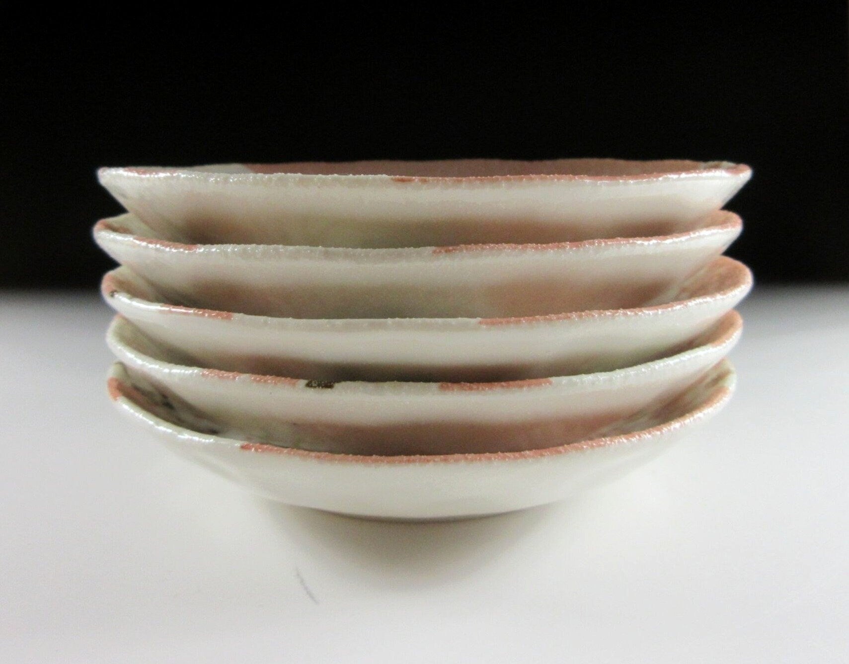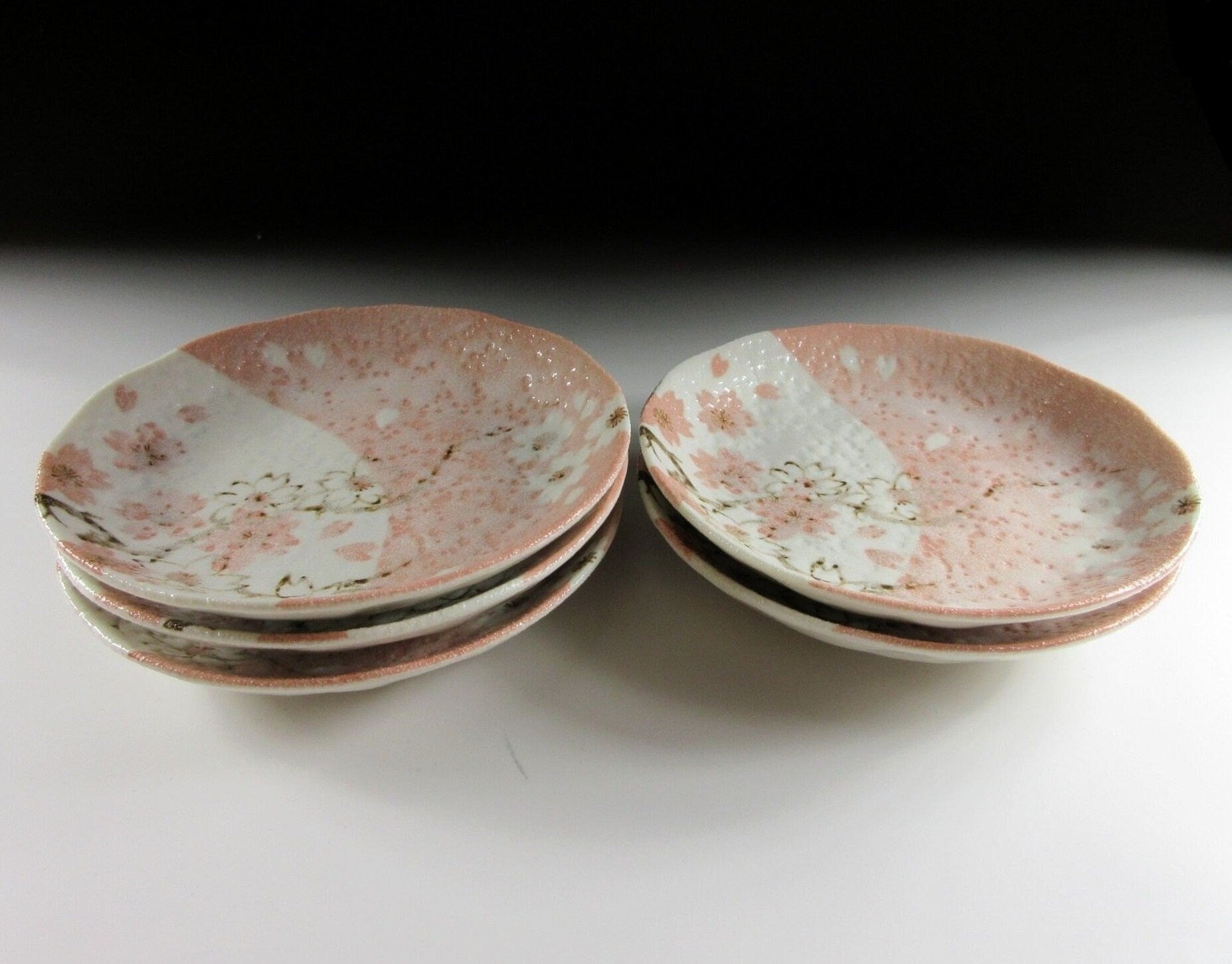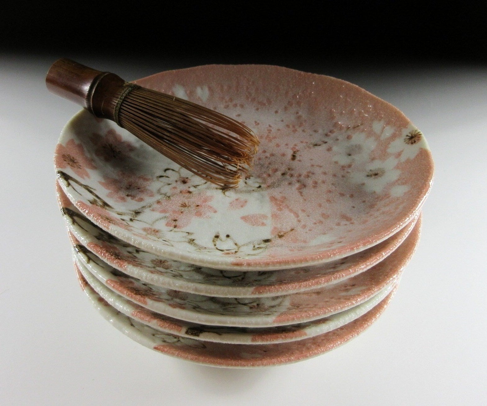This listing is for a set of five small Shino glaze plates made for Tachikichi in Kyoto. They are made from slip moulds and each plate is decorated with pink and white cherry blossoms. This set is ideal for serving sweets and small side dishes such as tofu. The Tachikichi mark can be found on the bottom of each plate. *PLEASE NOTE THAT THE CHASEN TEA WHISK IS NOT INCLUDED.
