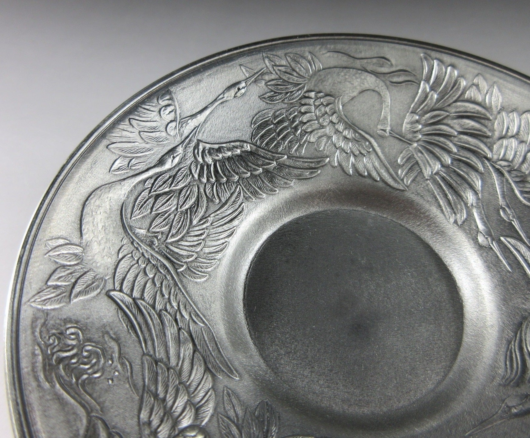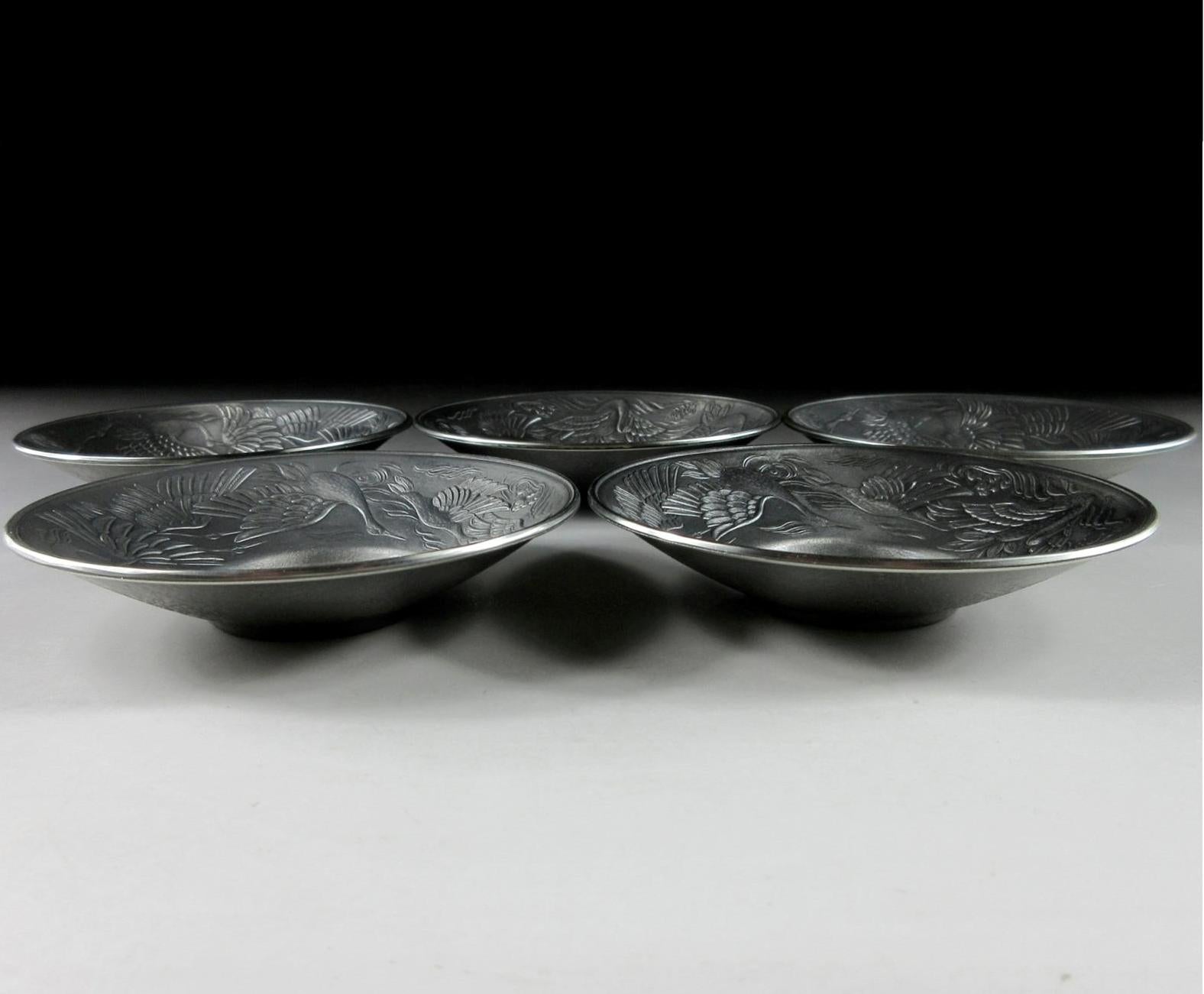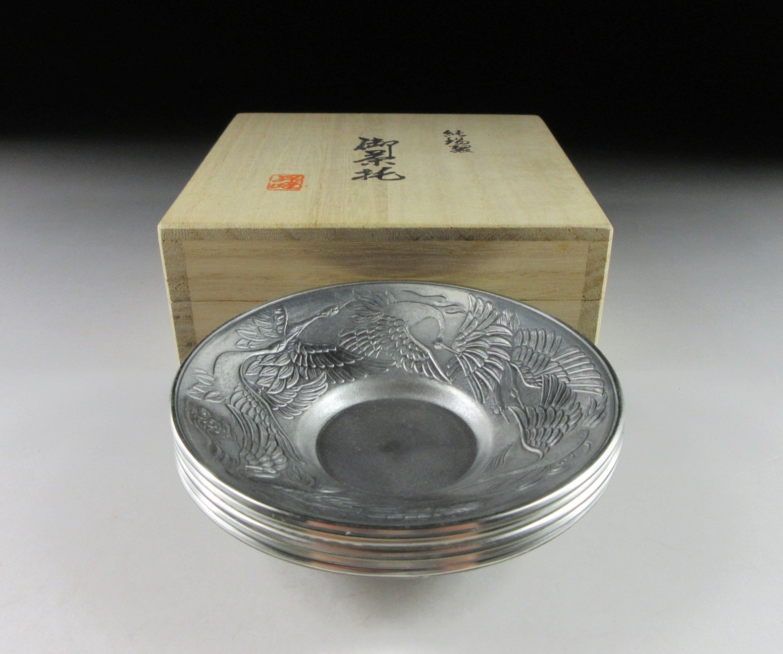 This listing is for a set of five chataku made around 10-20 years ago by Takaoka artisan ‘Shoho’. They are made of pure tin and each piece features a beautiful crane pattern. The stamp of the artisan (left side) and pure tin mark (right side) can be found on the back of each piece, and they come with their original signed wooden storage box.