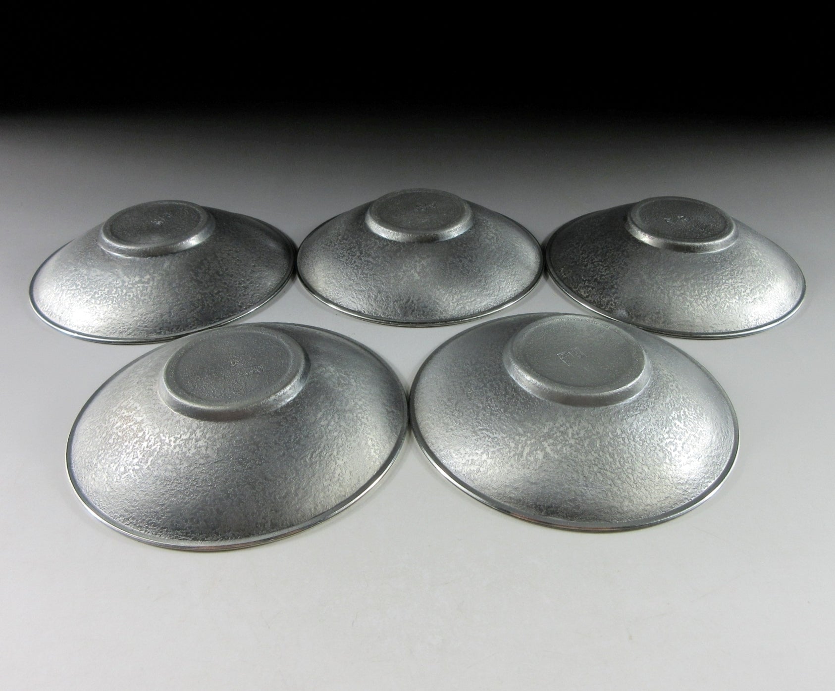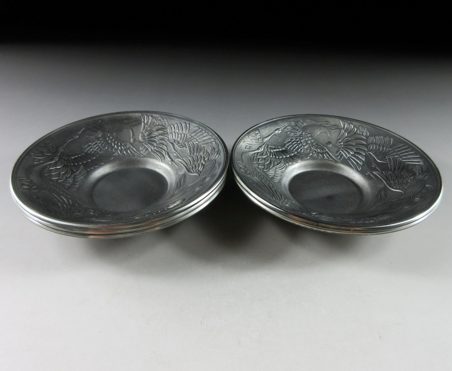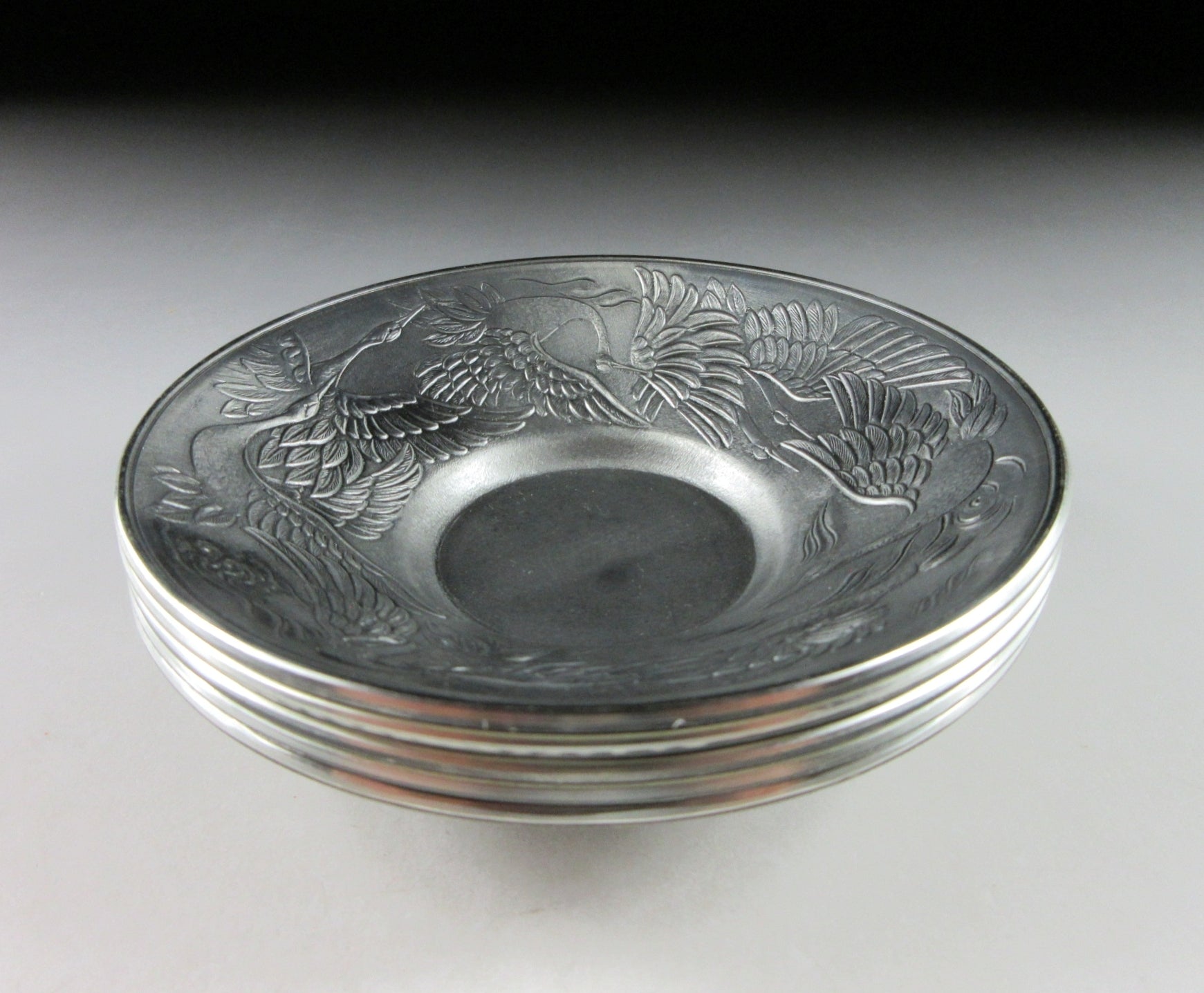 This listing is for a set of five chataku made around 10-20 years ago by Takaoka artisan ‘Shoho’. They are made of pure tin and each piece features a beautiful crane pattern. The stamp of the artisan (left side) and pure tin mark (right side) can be found on the back of each piece, and they come with their original signed wooden storage box.