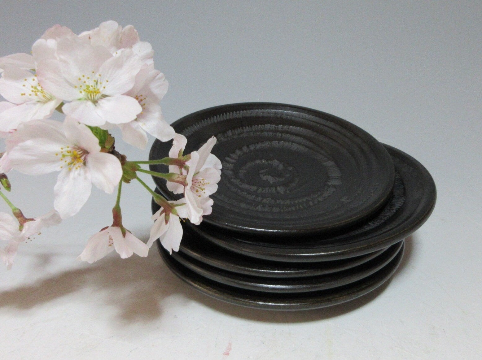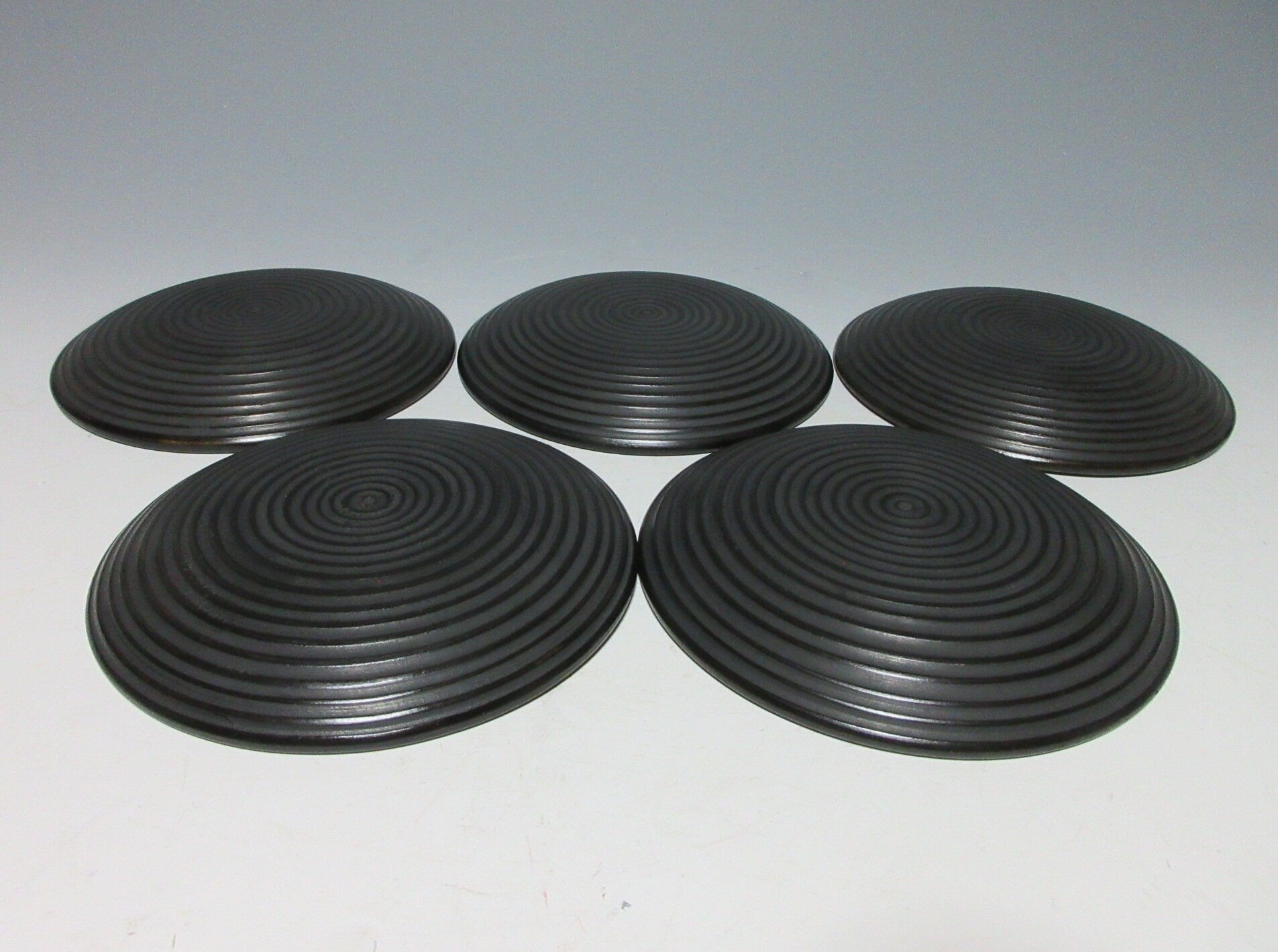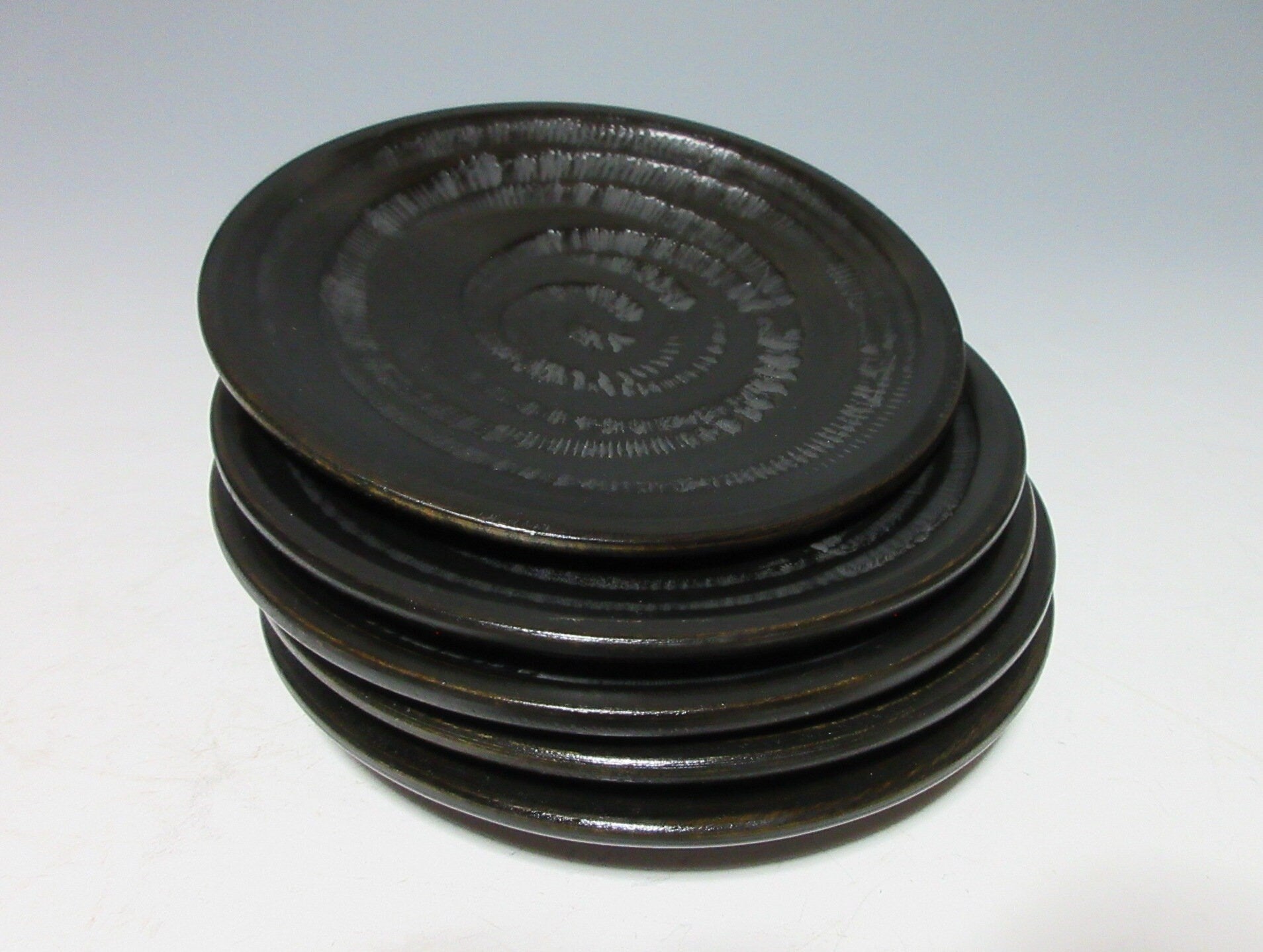 This listing is for a set of five Zokoku-nuri chataku made around 40 years ago. They are made of wood and they are decorated with a tobikanna chattering tool spiral pattern. The back features a series of grooves and their matte finish gives them a subtle and somewhat timeless appearance. Zokoku chataku these days are much thinner, older sets like the one in this listing and much thicker and more durable.