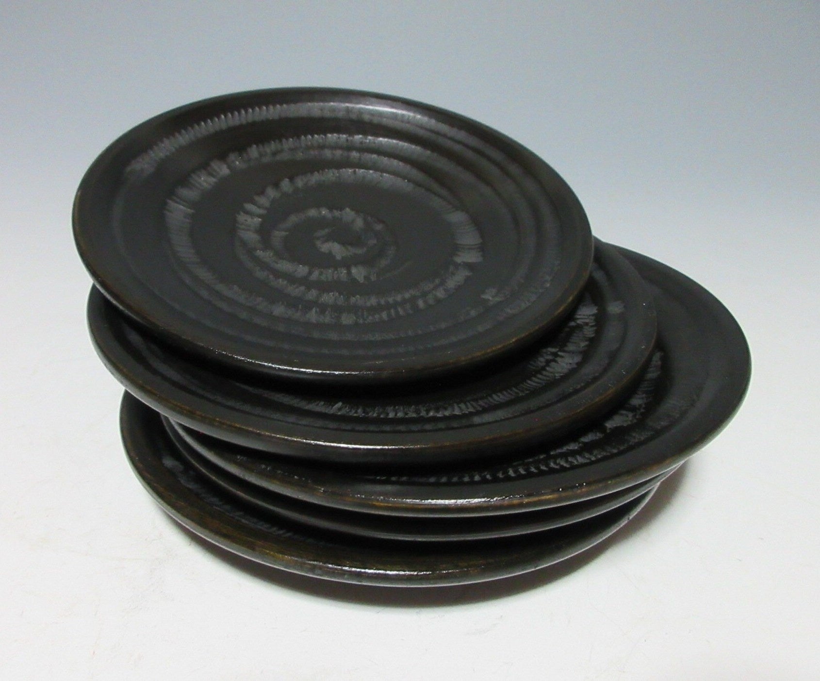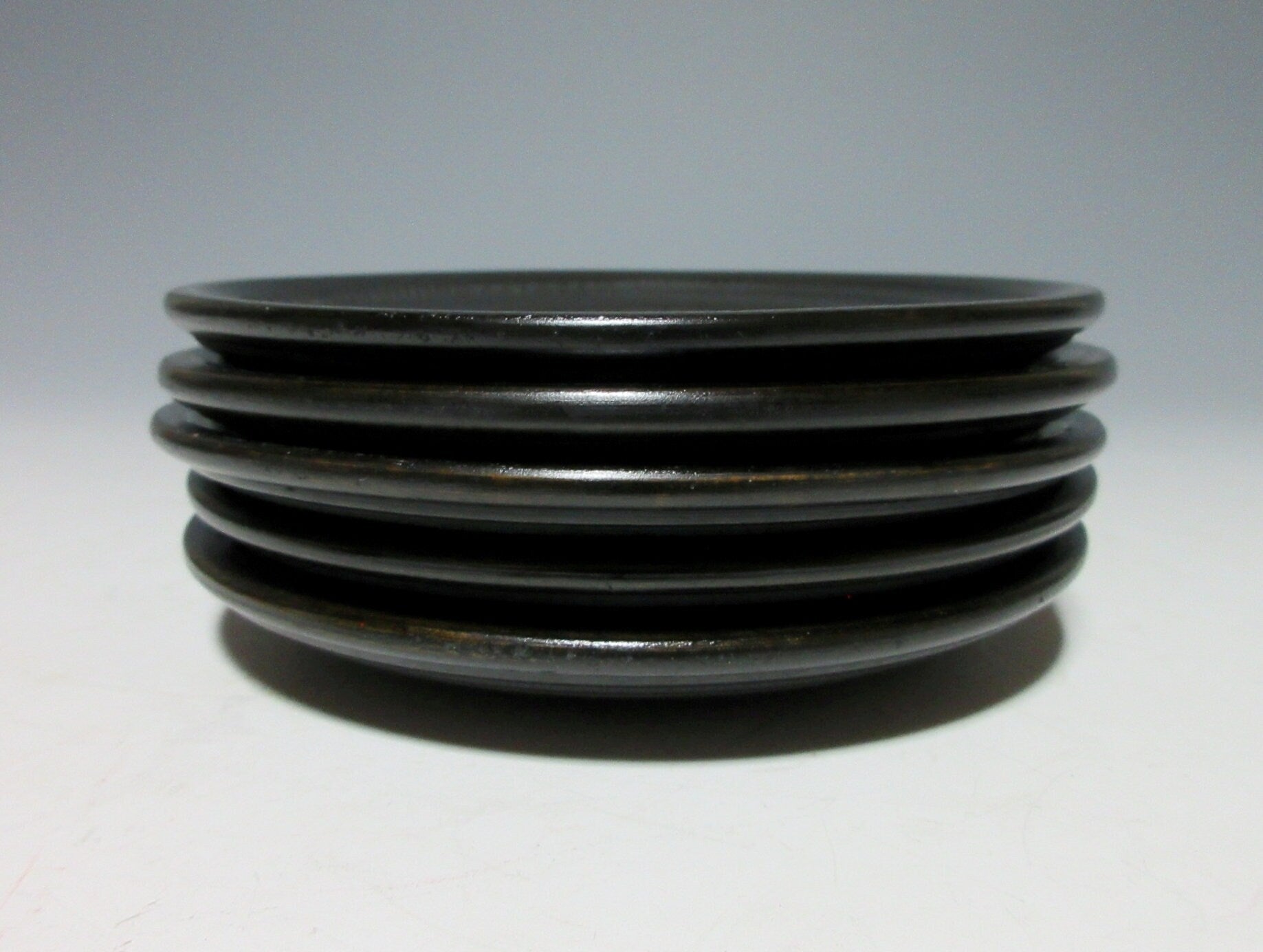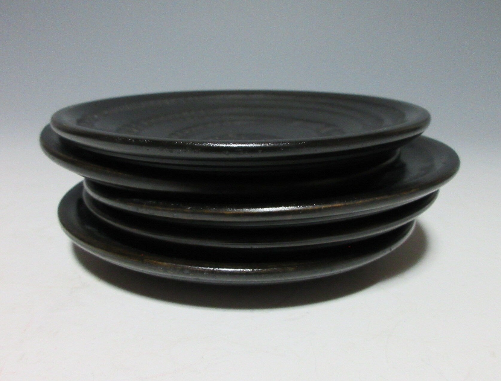 This listing is for a set of five Zokoku-nuri chataku made around 40 years ago. They are made of wood and they are decorated with a tobikanna chattering tool spiral pattern. The back features a series of grooves and their matte finish gives them a subtle and somewhat timeless appearance. Zokoku chataku these days are much thinner, older sets like the one in this listing and much thicker and more durable.