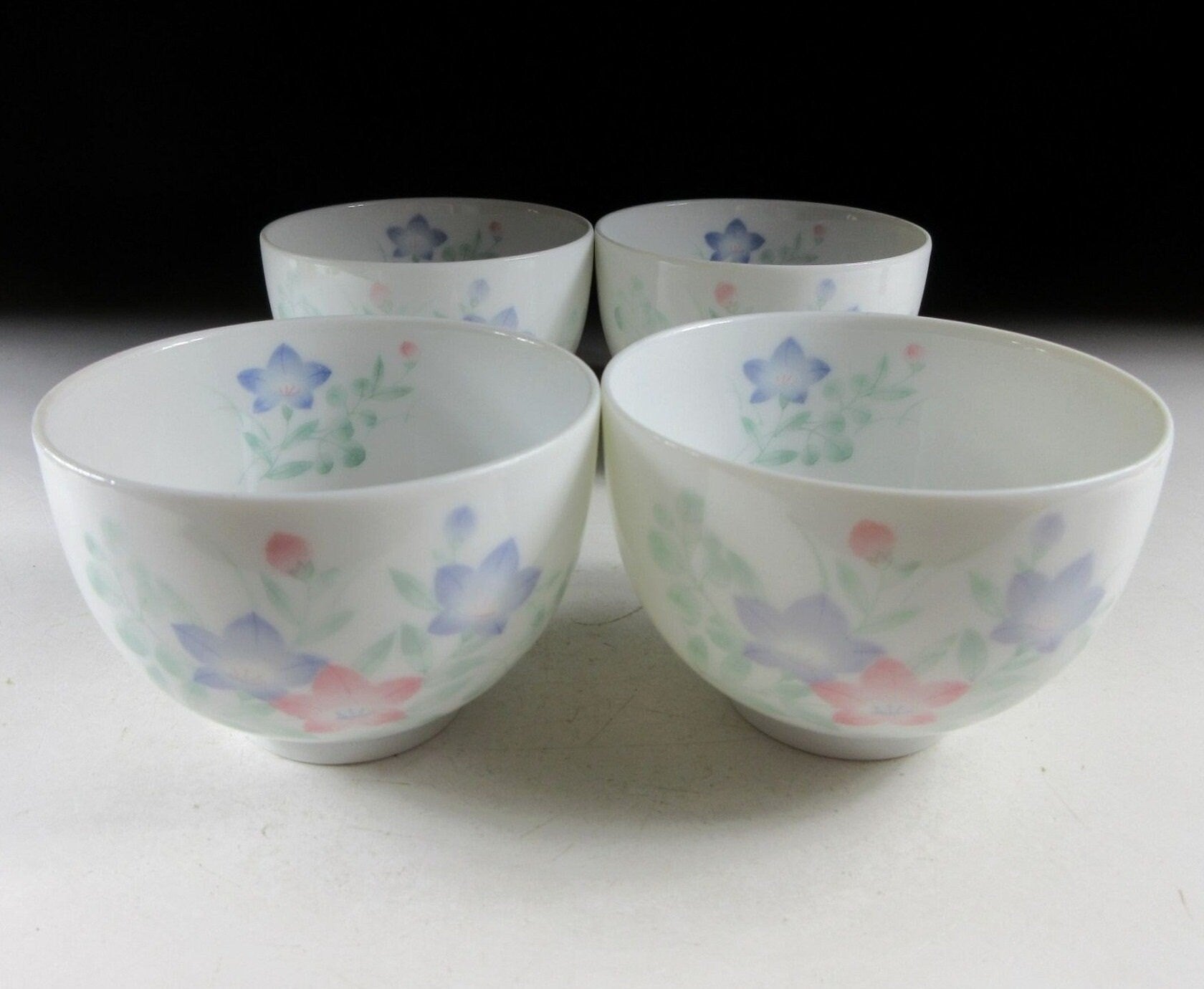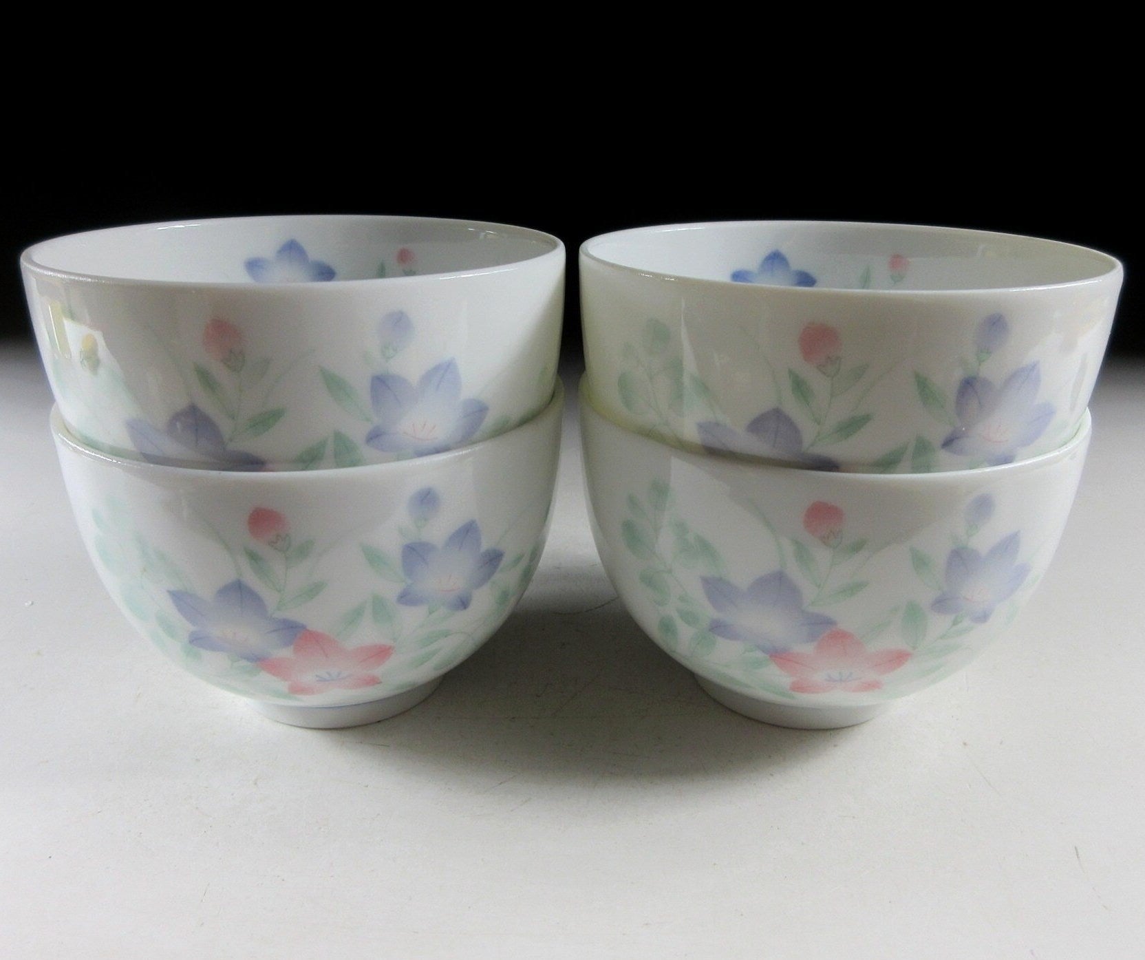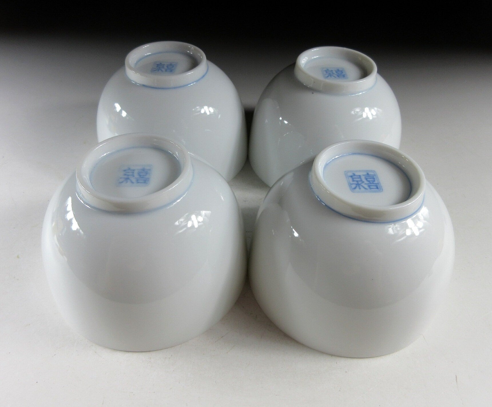 This listing is for a set of four Mino-ware tea cups made around 5 years ago. They are made of porcelain and the front of each cup is decorated with pale blue and pink bellflowers over a white porcelain background. Bellflowers are one of the seven flowers of autumn, and are often used to decorate textiles, scrolls and tableware. These cups are ideally suited to serving sencha and are suitable for daily use. The stamp of the kiln can be found on the bottom of each cup.