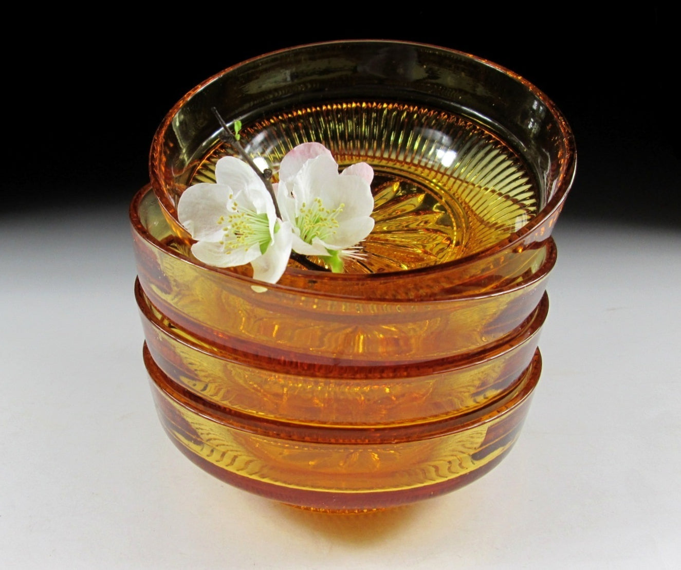 This listing is for a set of four Showa glass bowls made around 30-40 years ago. Each bowl is golden yellow and features a stylized flower on the base, and the sides are trimmed with a band of vertical lines. Excellent for serving fruit, sweets, or salad.