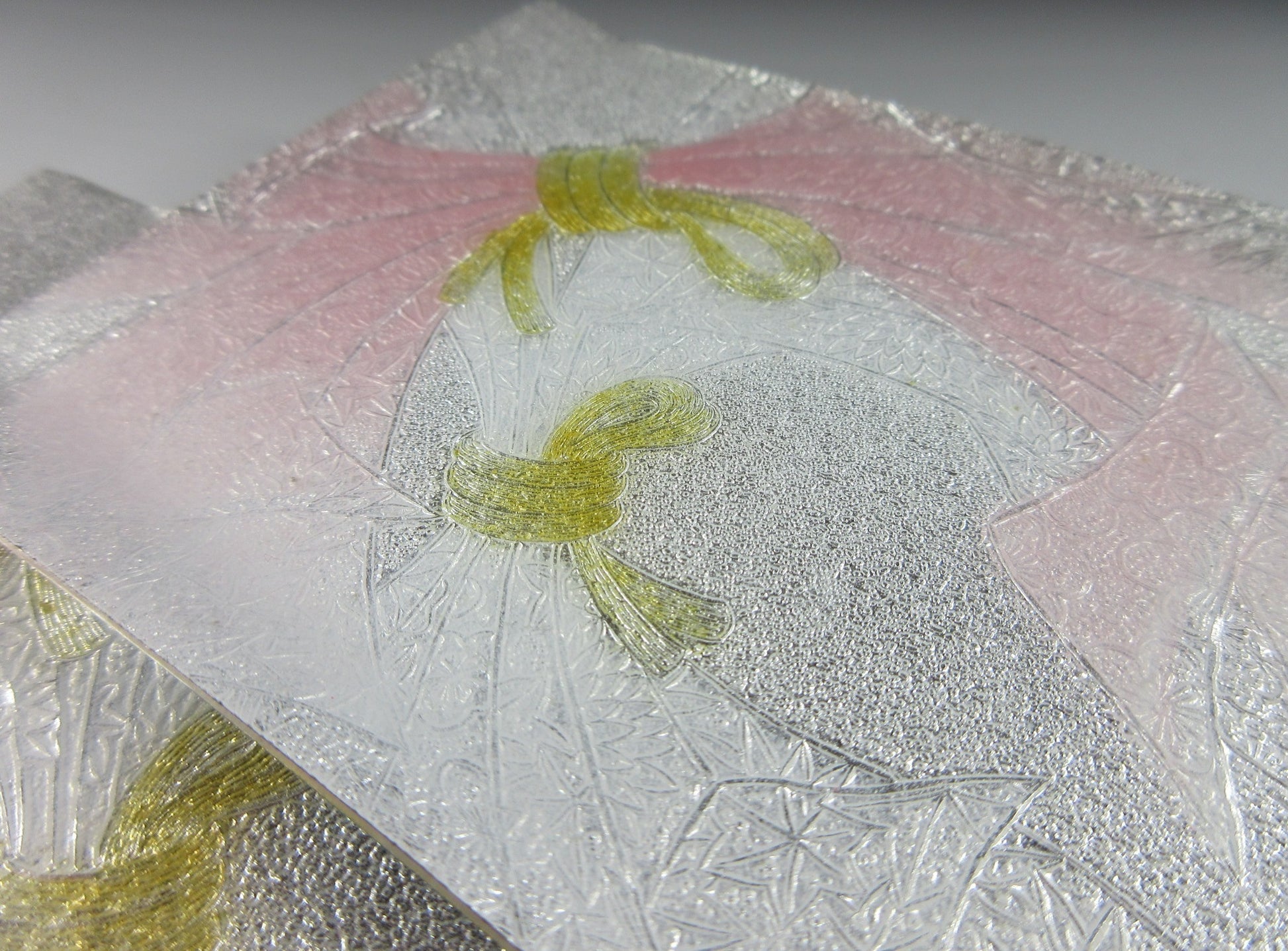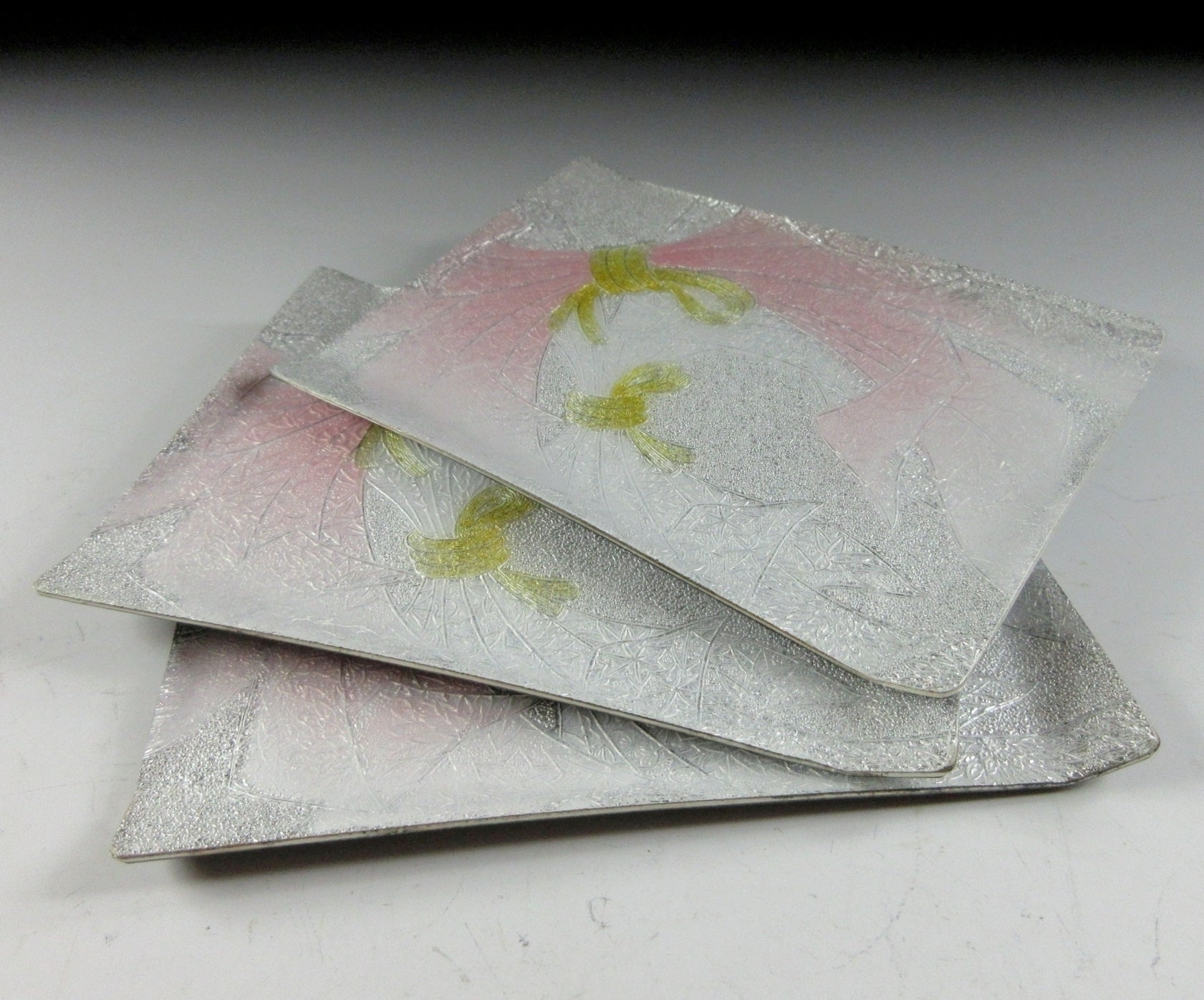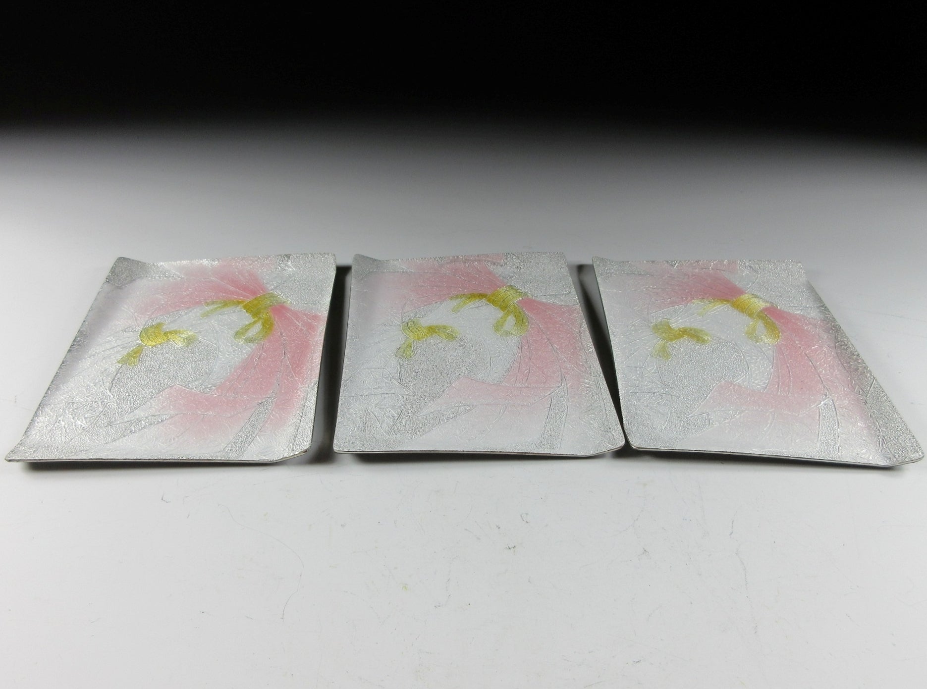 This listing is for a set of three cloisonné tea plates made around 20 years ago by Hinode Japan. They consist of enamel on copper, and are classified as the ‘musen’ wireless type. The back of each plate features black glossy enamel, and the front is decorated with a tabane-noshi pattern. Tabane means bundled and noshi is a folded ornament attached to gifts. The noshi pattern is considered auspicious and symbolises strong bonds and connections between people. It is also a symbol of longevity. This is a lovely set to welcome the new year, and they’re easy to clean. The three plates come with their original paper storage box.