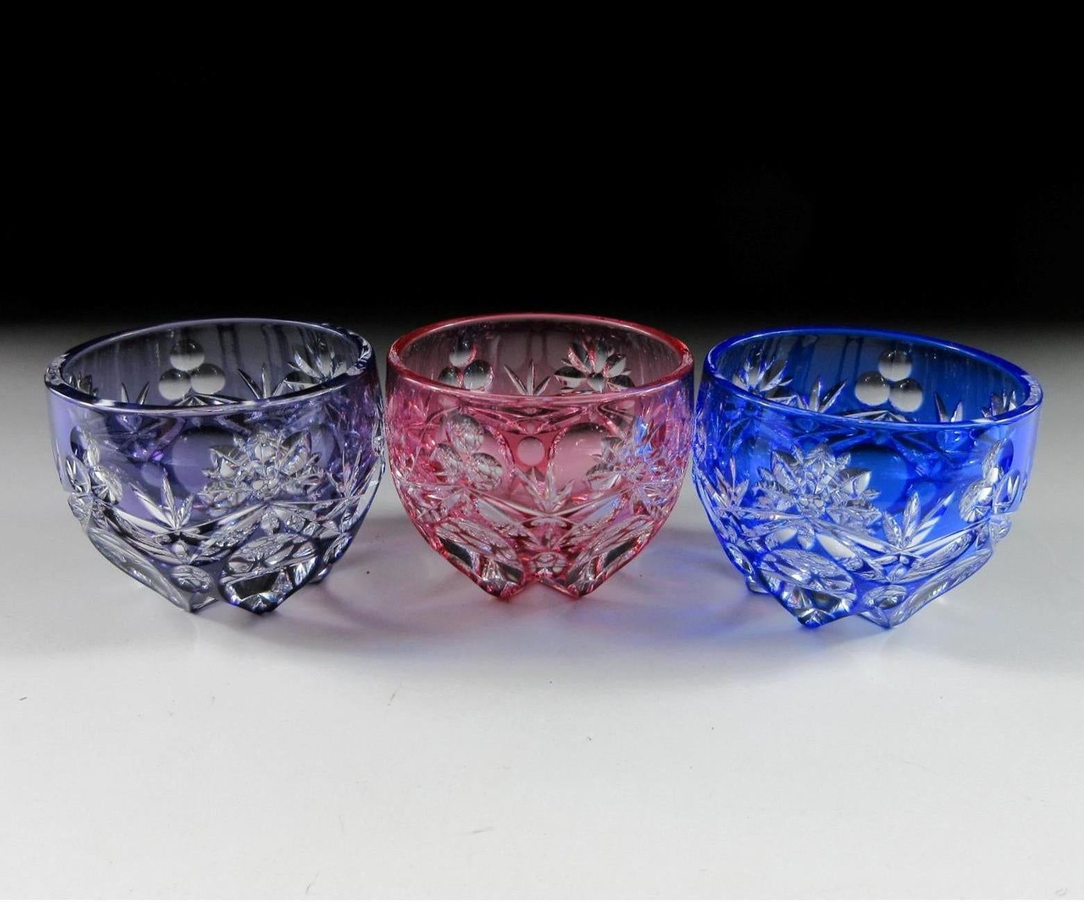 This listing is a set of three small Edo Kiriko sake glasses made around 20 years ago. They feature various geometric floral patterns and the base is decorated with a six pointed star. Each cup is a different colour, this set consists of purple, blue and pink. Kiriko glass is often gifted for weddings and anniversaries in Japan because of its high quality.