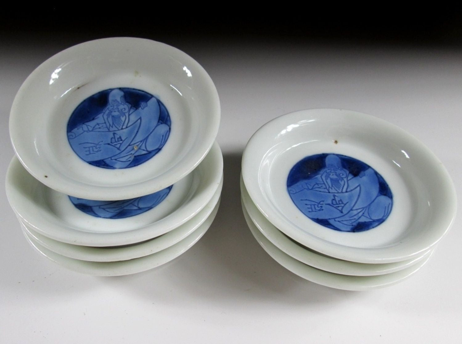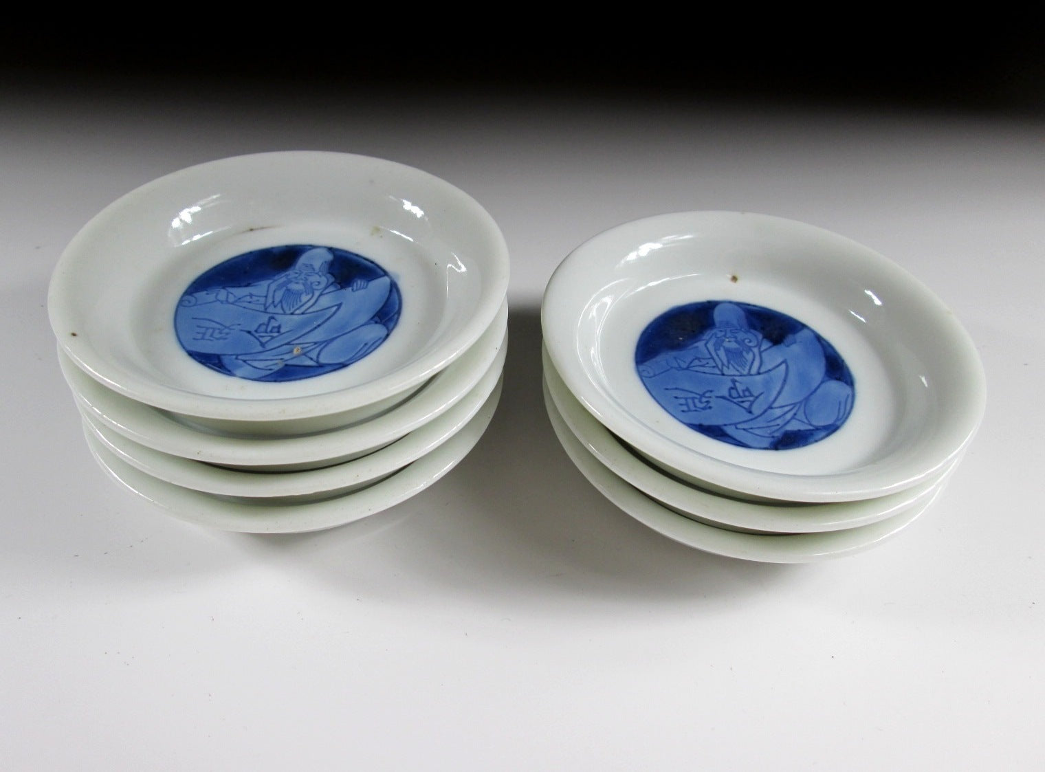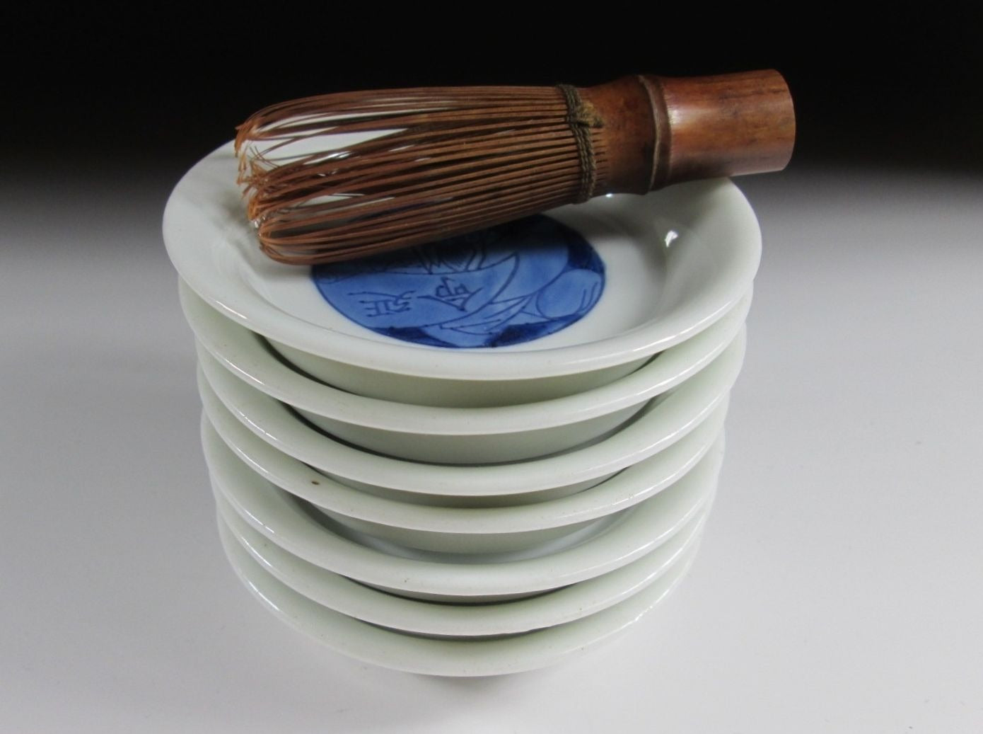 This listing is for a set of seven very small sized sometsuke plates made around 70-80 years ago. They are made of porcelain and decorated with Fukurokuju, one of the Seven Gods of Fortune. Fukurokuju is the god of wisdom and longevity. He is commonly depicted as having a long white beard as well as a very long bald head, and he walks with a staff and has a fan in his hand. Attached to this staff is a scroll with the lifespan of all living things written on it. The plates in this listing feature Fukurokuju in a seated position opening a scroll, and the kanji on the scroll translates as ‘long life’. This is a handsome little set for New Year, they are perfect for serving condiments or to use as small dipping plates. *PLEASE NOTE THAT THE CHASEN TEA WHISK IS NOT INCLUDED.