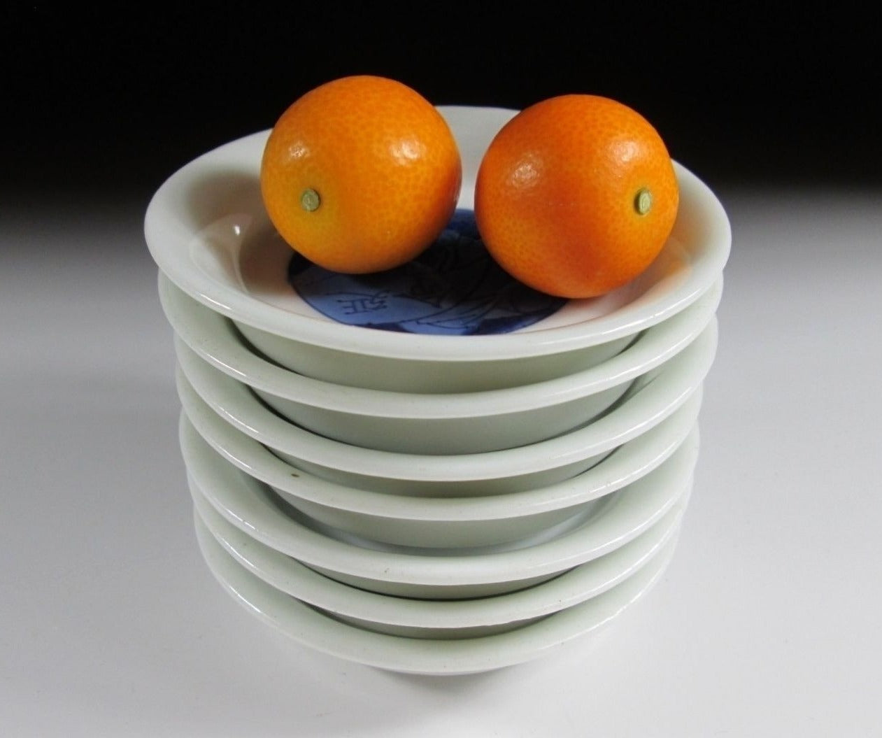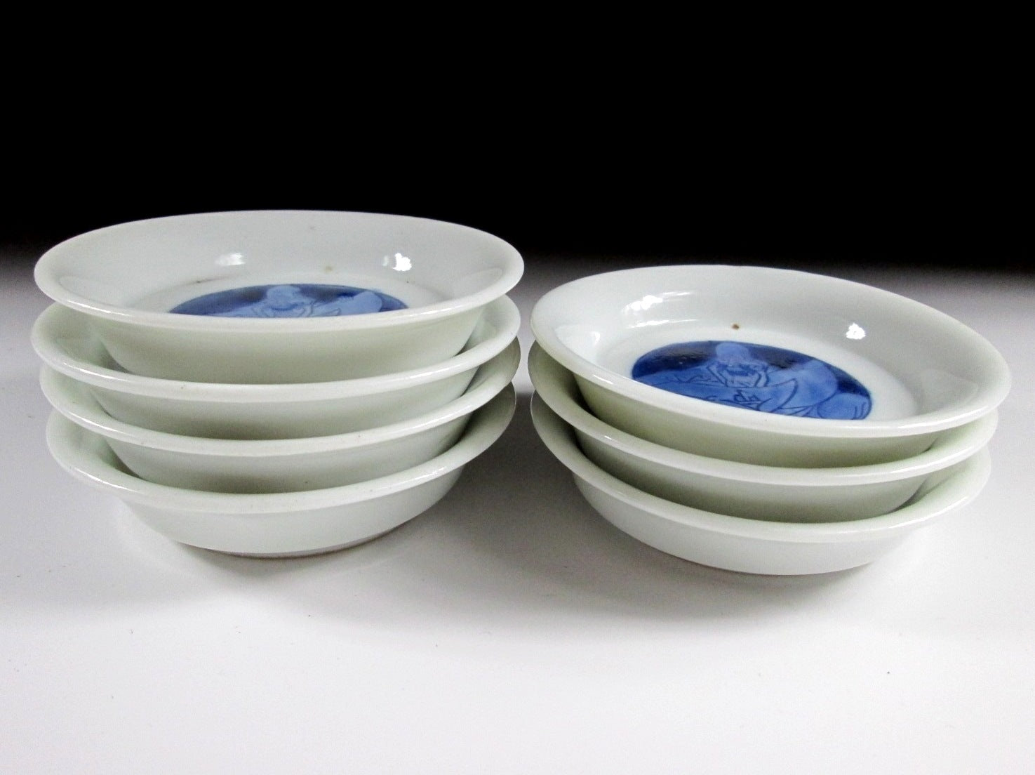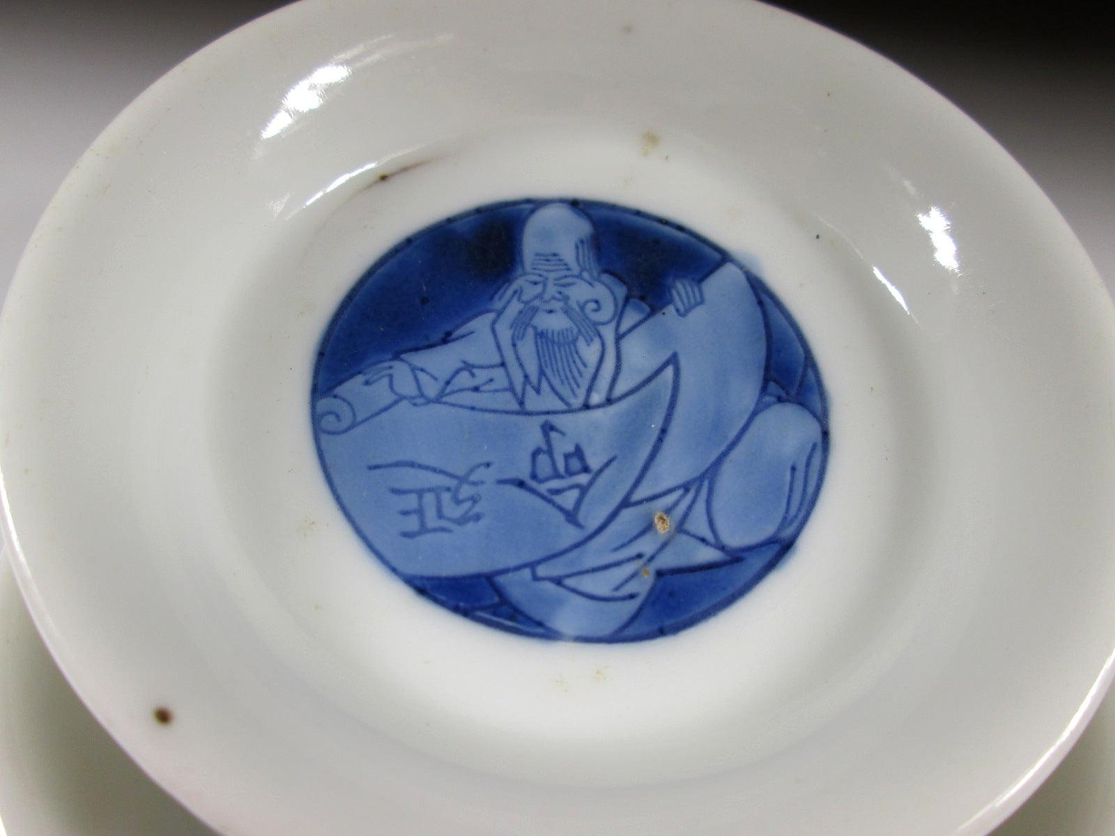 This listing is for a set of seven very small sized sometsuke plates made around 70-80 years ago. They are made of porcelain and decorated with Fukurokuju, one of the Seven Gods of Fortune. Fukurokuju is the god of wisdom and longevity. He is commonly depicted as having a long white beard as well as a very long bald head, and he walks with a staff and has a fan in his hand. Attached to this staff is a scroll with the lifespan of all living things written on it. The plates in this listing feature Fukurokuju in a seated position opening a scroll, and the kanji on the scroll translates as ‘long life’. This is a handsome little set for New Year, they are perfect for serving condiments or to use as small dipping plates. *PLEASE NOTE THAT THE CHASEN TEA WHISK IS NOT INCLUDED.