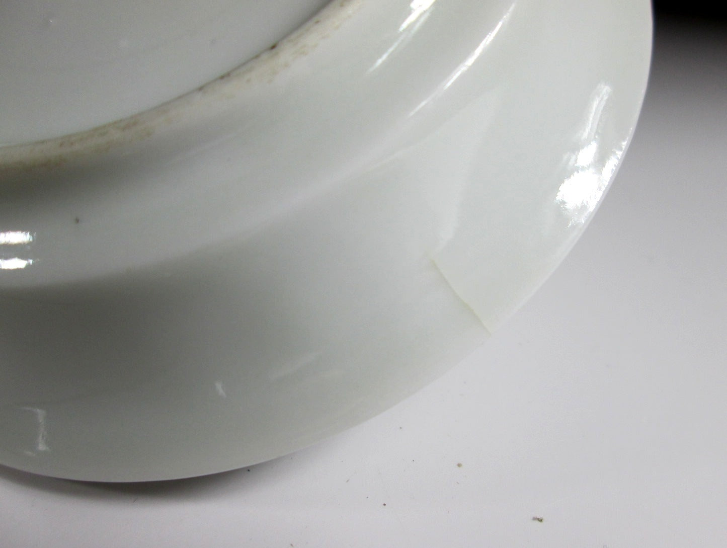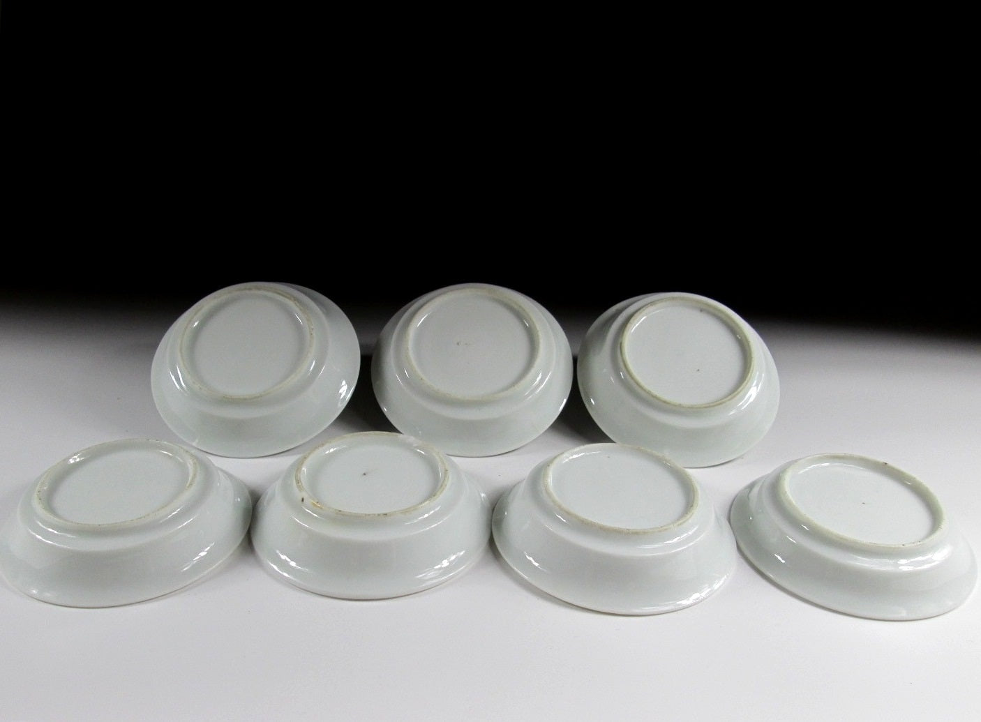 One plate has a chipped foot and rim (one chip is glazed over), another has a small/short crack, and another has a tiny chip on the foot. All of the plates have light surface wear such as light scratches/scuffing, as well as minor surface imperfections.