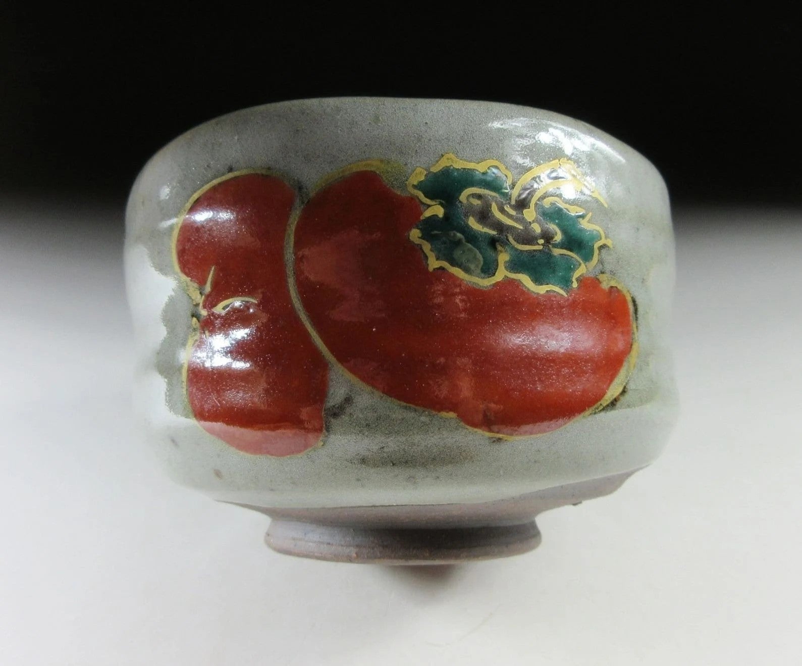 This listing is for a Shibakusa-ware chawan made around 20 years ago by highly regarded Shibakusa Ryuzo Gama. It is wheel-thrown and the front is depicted with hand-painted depictions of ripe persimmons over a light grey background. It has nice thick walls and is made of high-fired stoneware. The signature of the kiln can be found on the bottom, and it comes with its original signed wooden storage box. It also comes with a signed yellow wrapping cloth for when the item is not in use. *PLEASE NOTE THAT THE CHASHAKU IS NOT INCLUDED.