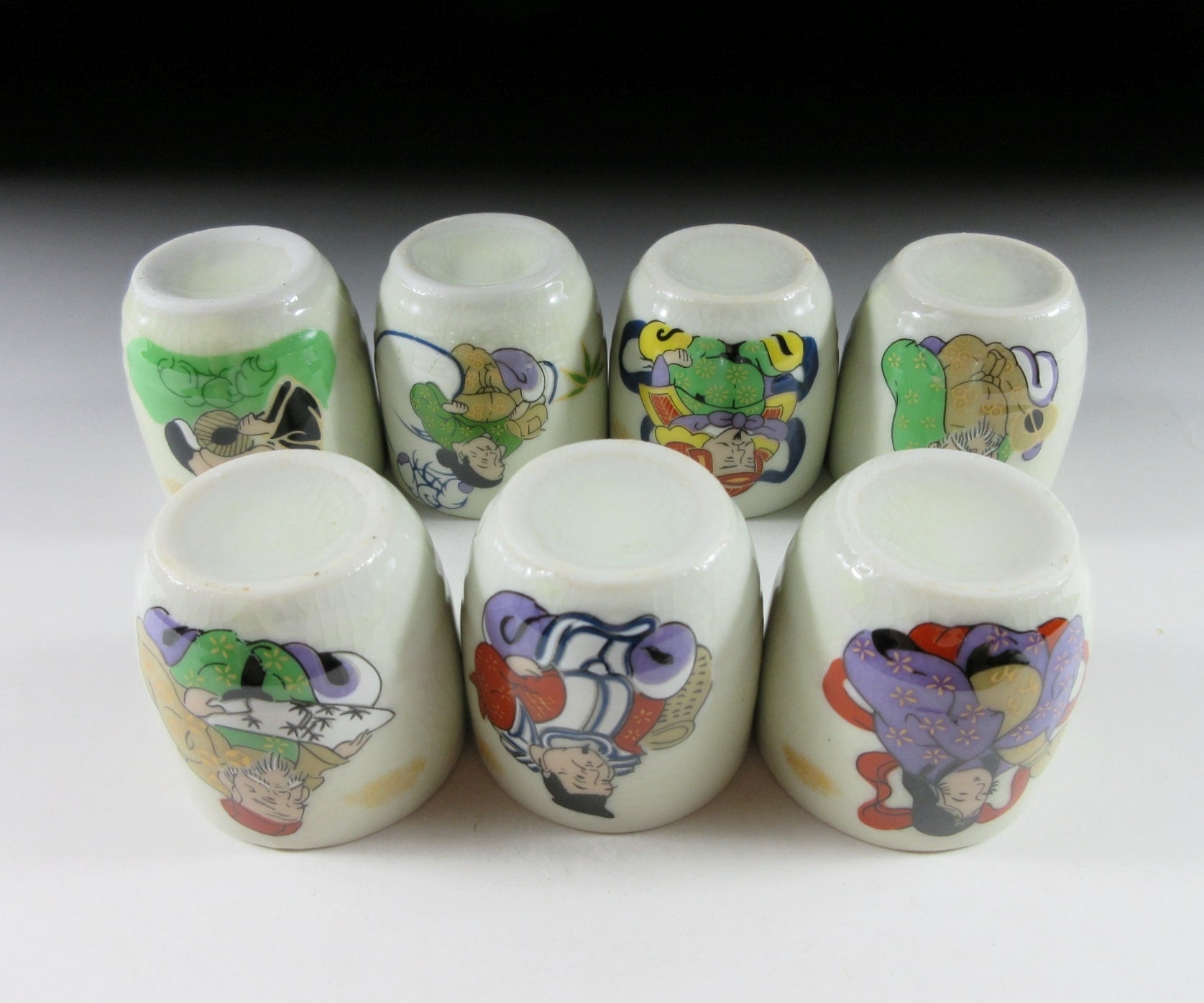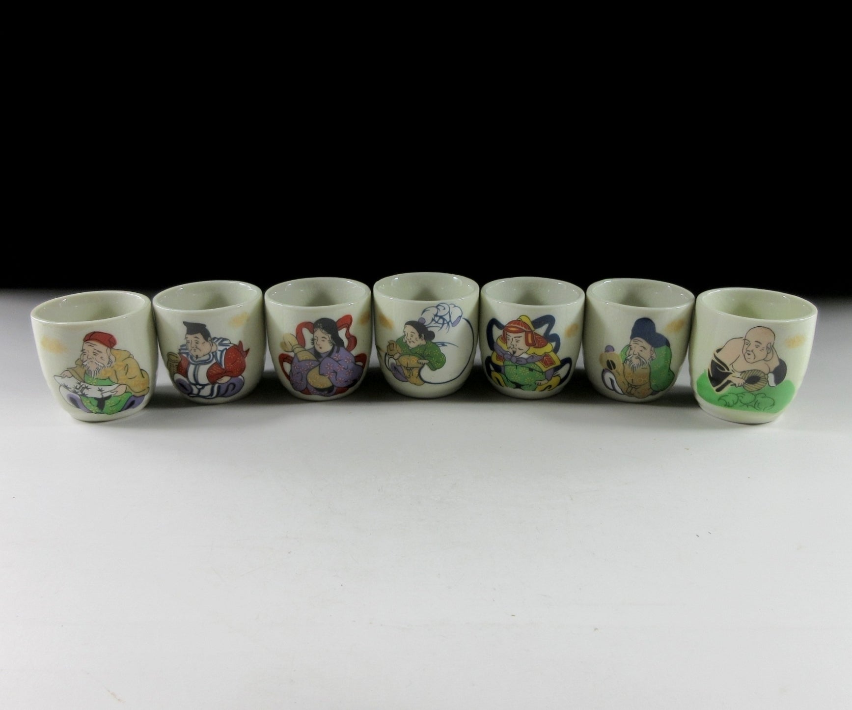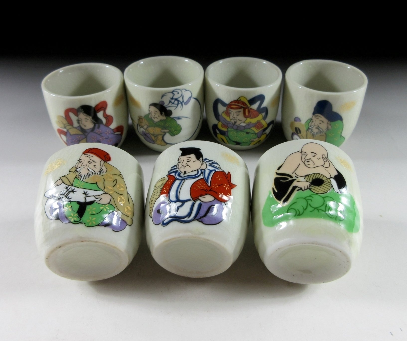 This listing is for a set of seven Mino-ware sake cups made around 20 years ago. They are made of stoneware slip and feature the seven gods of fortune. The lucky seven gods of fortune are collectively known as Shichifukujin in Japanese. They are Benzaiten, Jurojin, Fukurokuju, Hotei, Daikokuten, Ebisu, and Bishamonten. Each god is responsible for bringing a specific type of fortune or protection against something such as ill health or natural disasters, and there are specific shrines and temples dedicated to each one. These cups are shot sized and great for ushering in the New Year!