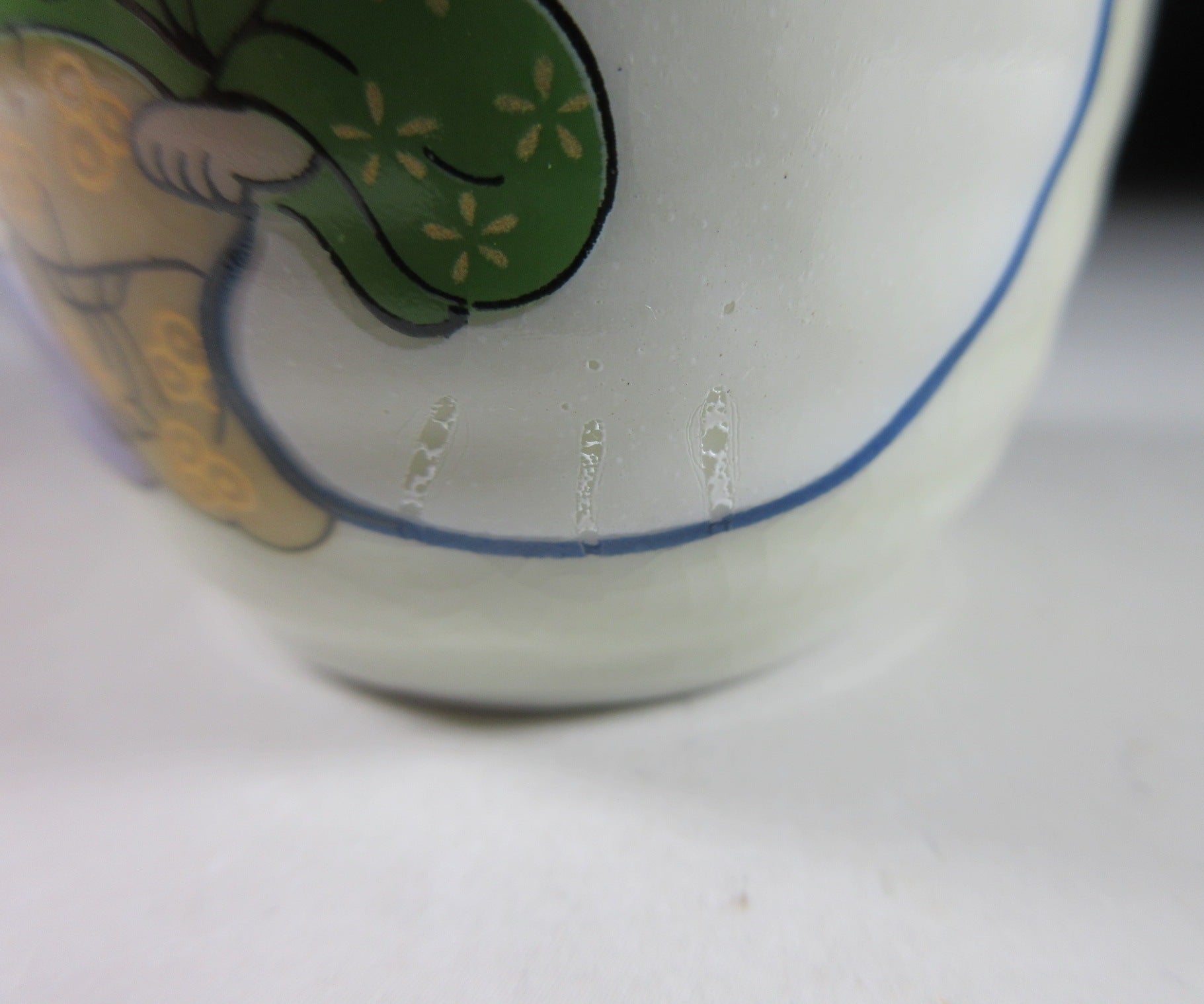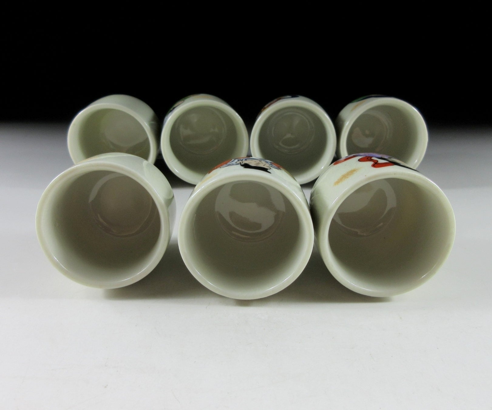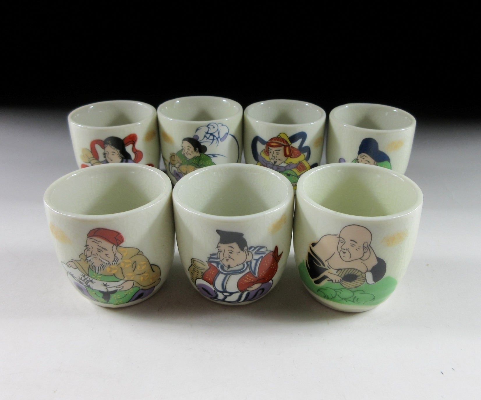 This listing is for a set of seven Mino-ware sake cups made around 20 years ago. They are made of stoneware slip and feature the seven gods of fortune. The lucky seven gods of fortune are collectively known as Shichifukujin in Japanese. They are Benzaiten, Jurojin, Fukurokuju, Hotei, Daikokuten, Ebisu, and Bishamonten. Each god is responsible for bringing a specific type of fortune or protection against something such as ill health or natural disasters, and there are specific shrines and temples dedicated to each one. These cups are shot sized and great for ushering in the New Year!