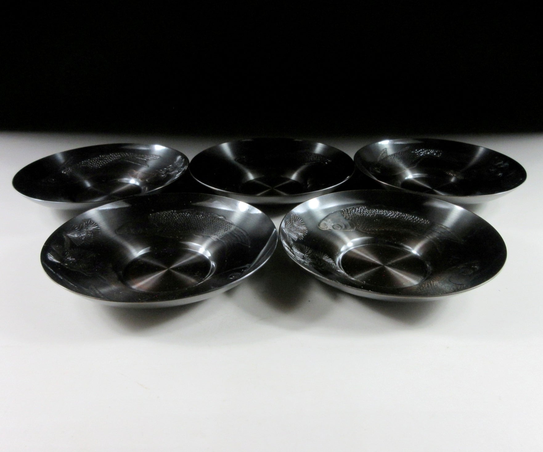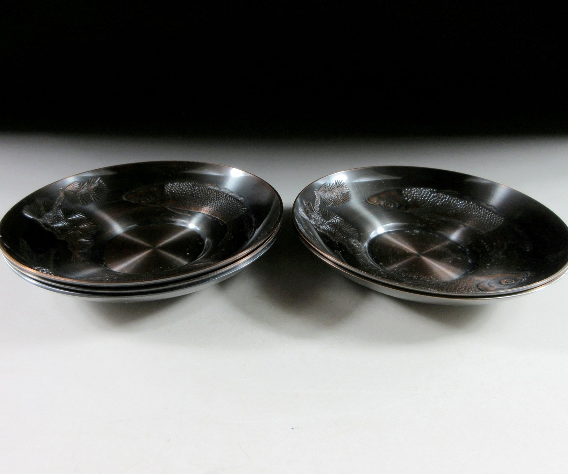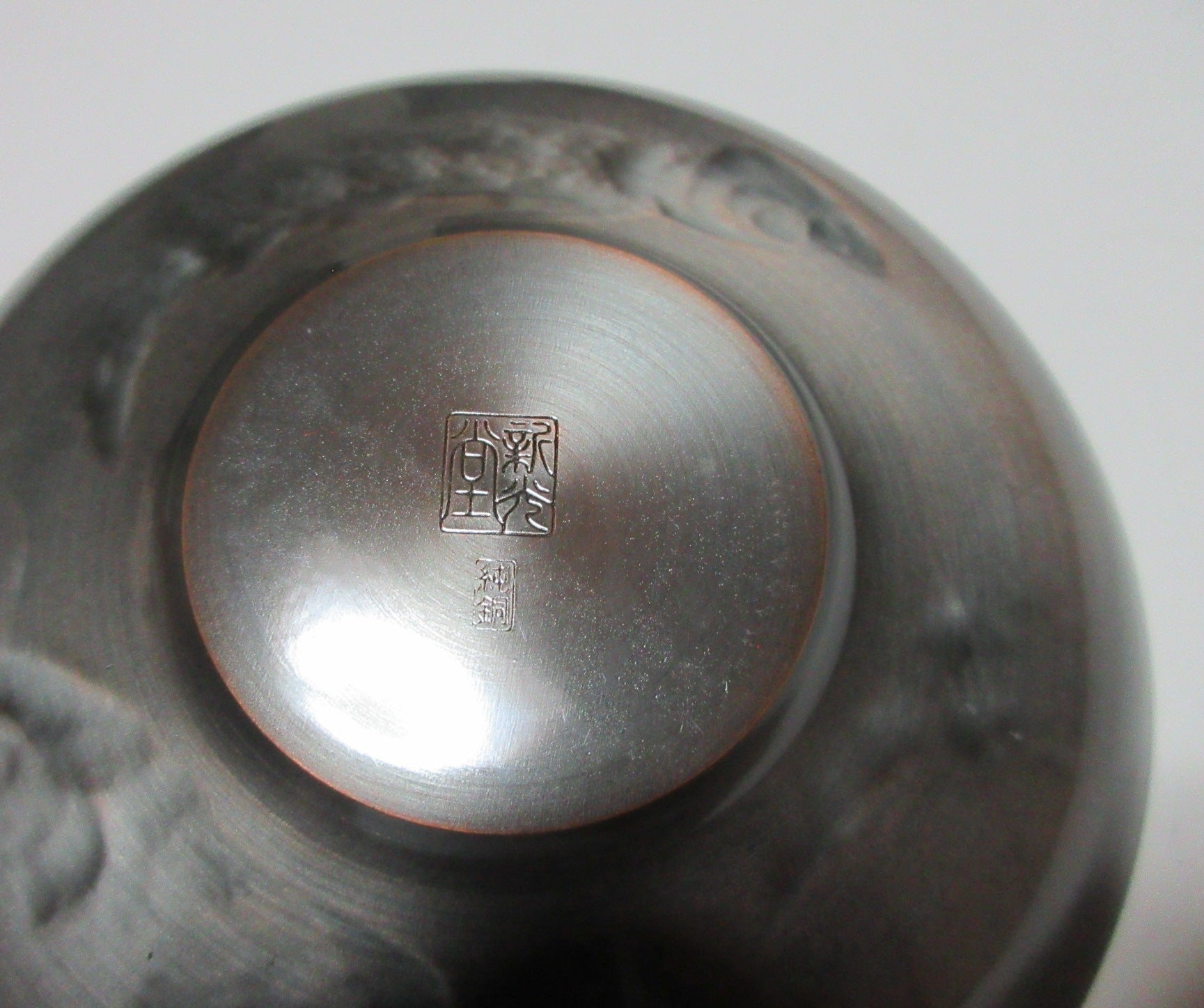 This listing is for a set of five copper chataku made around 5-10 years ago by Shinkoukinzoku. Copper chataku are popular because of their rich burnished tone as they age. They’re also suitable for daily use, and their simple appearance makes them ideal for pottery, glass or metal cups. The chataku in this listing have been hammered from a single piece of copper and are decorated with a ‘matsukoi’ design. Matsu pine have a lifespan of 1000 years, and have long been regarded as sacred gifts. Koi on the other hand are known for their graceful movement, and are often associated with success and advancement in life. According to their official website this particular set retails for 16,500 yen brand new.