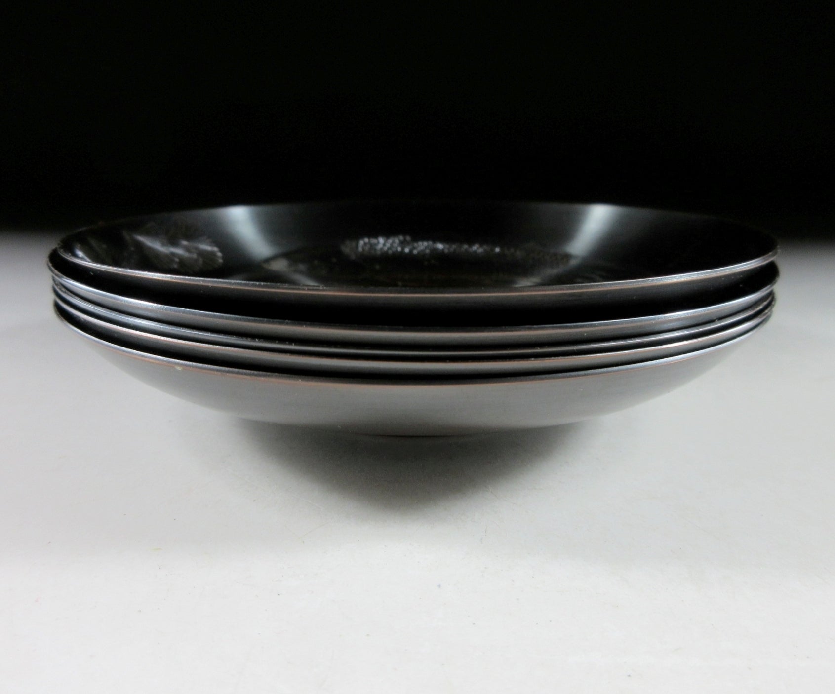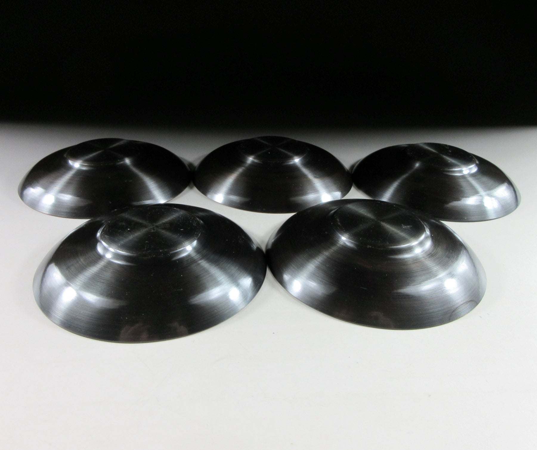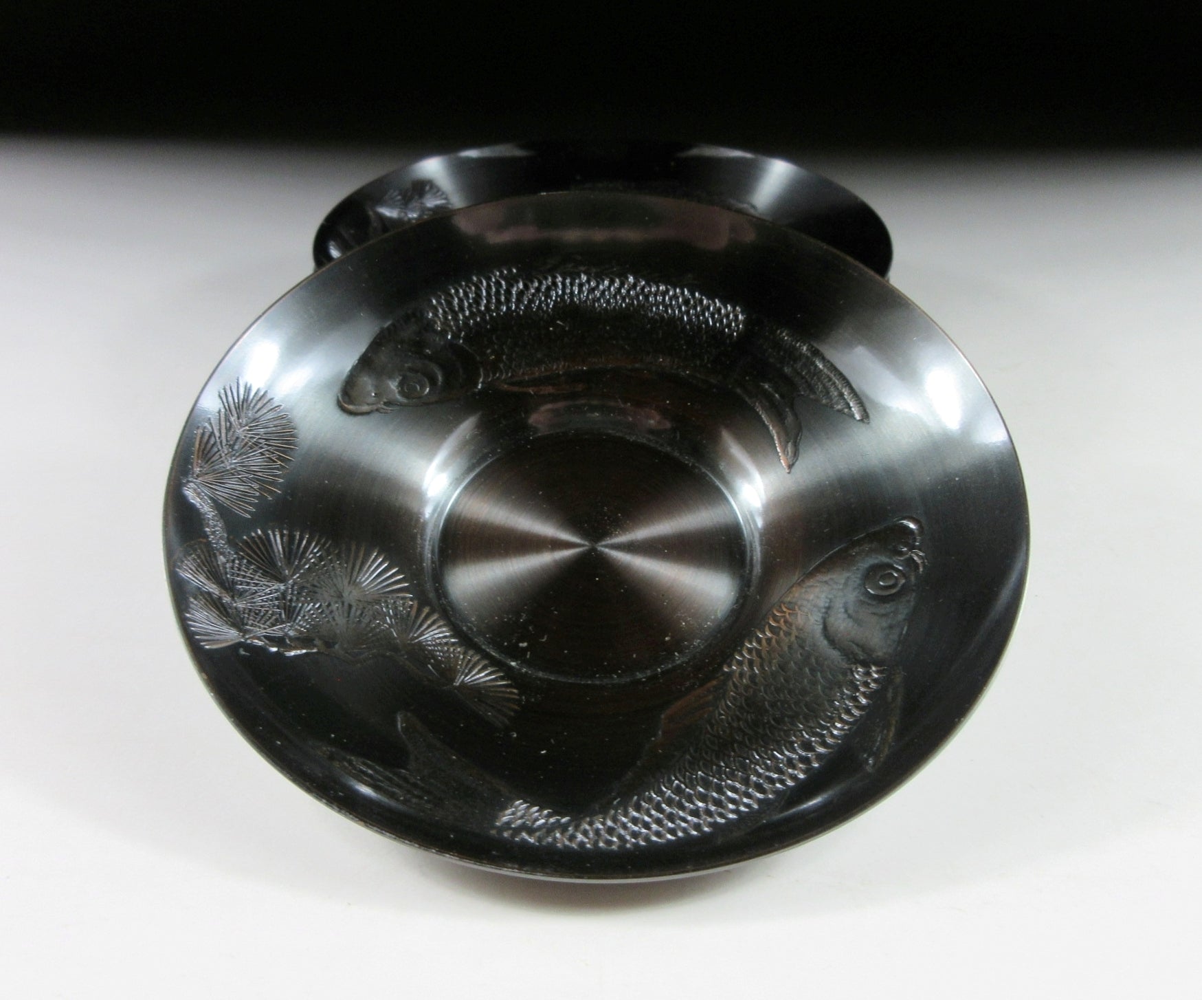 This listing is for a set of five copper chataku made around 5-10 years ago by Shinkoukinzoku. Copper chataku are popular because of their rich burnished tone as they age. They’re also suitable for daily use, and their simple appearance makes them ideal for pottery, glass or metal cups. The chataku in this listing have been hammered from a single piece of copper and are decorated with a ‘matsukoi’ design. Matsu pine have a lifespan of 1000 years, and have long been regarded as sacred gifts. Koi on the other hand are known for their graceful movement, and are often associated with success and advancement in life. According to their official website this particular set retails for 16,500 yen brand new.