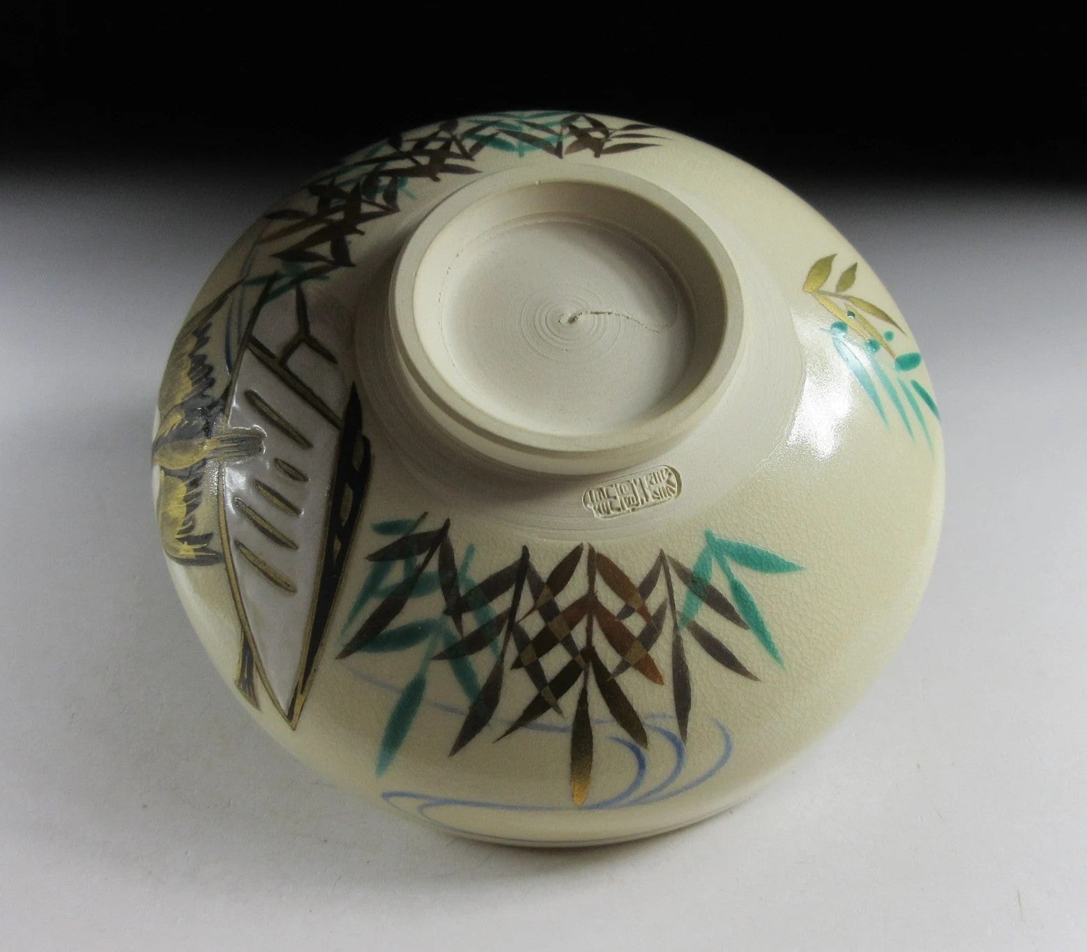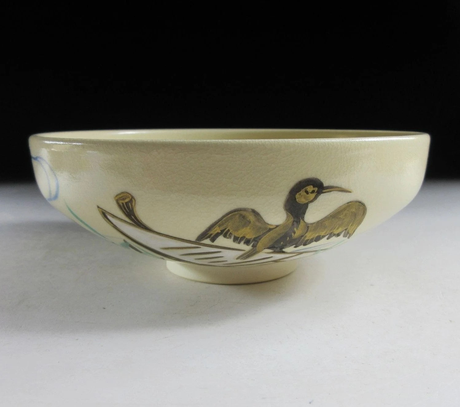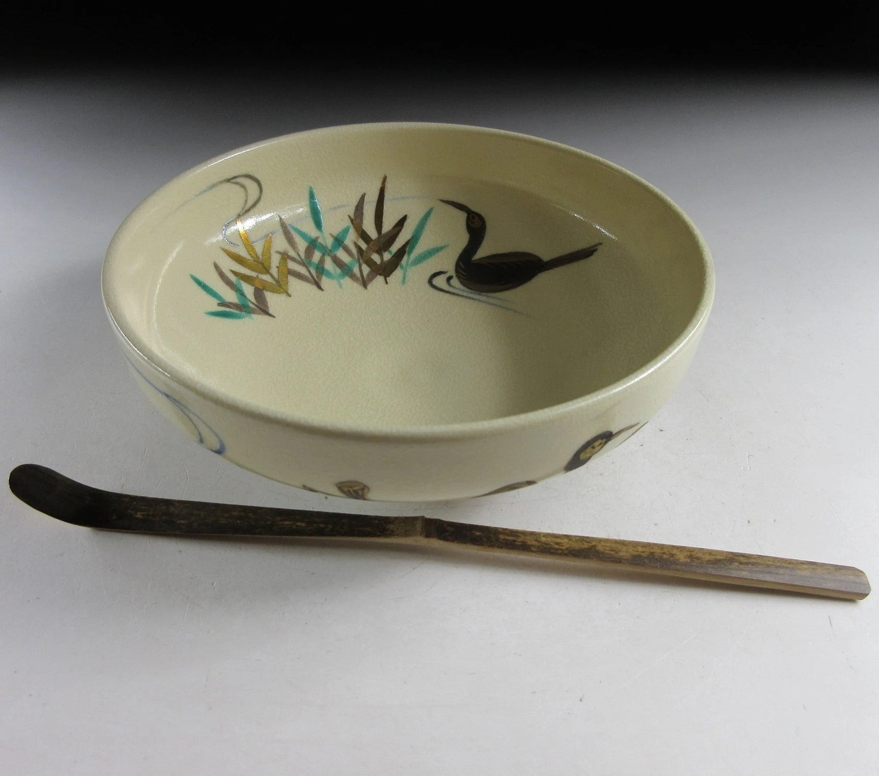 This listing is for a splendid Kyo-ware hira chawan made around 20 years ago by Shinonome Gama. It is wheel-thrown and the flat hira type used during the summer season. Hira chawan are shallow bowls with low sides designed to cool tea down faster. The bowl in this listing is decorated with cormorants and a small fishing boat. Cormorant fishing, or ukai as its known in Japanese, is a 1300 year old tradition that takes place during summer. Fishermen in long wooden boats lead cormorants that swim alongside the boat to catching fish. The event attracts many visitors during the summer season, and master fishermen have official patronage from the emperor. This is a splendid lightweight piece perfect for drinking thin or iced tea. The stamp of the kiln can be found on the bottom, sorry no box. *PLEASE NOTE THAT THE CHASHAKU IS NOT INCLUDED.