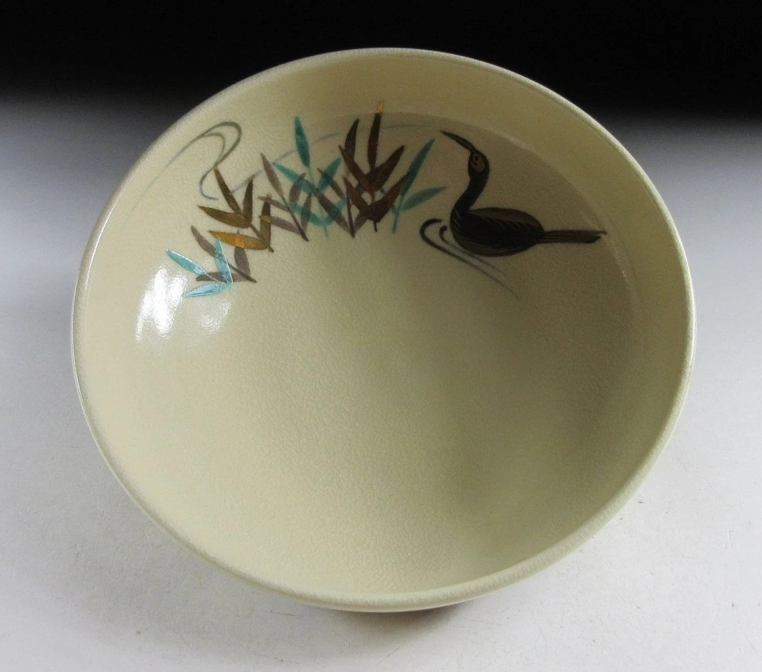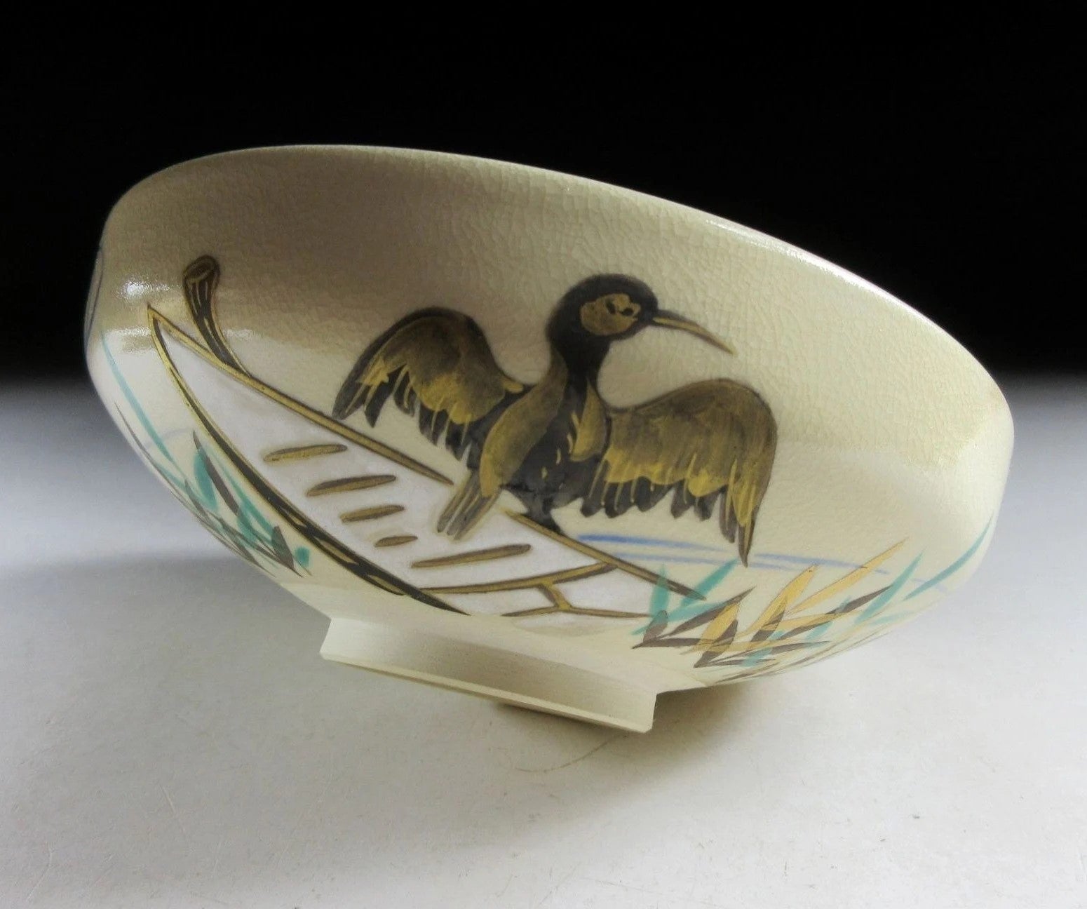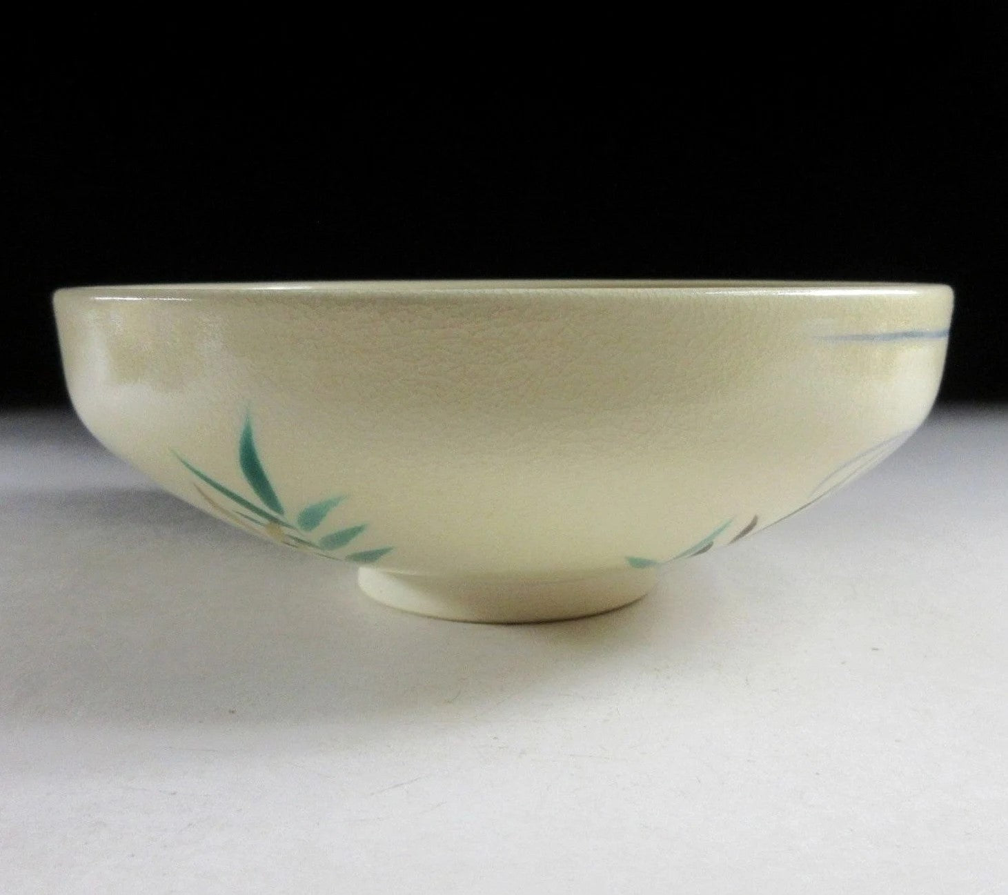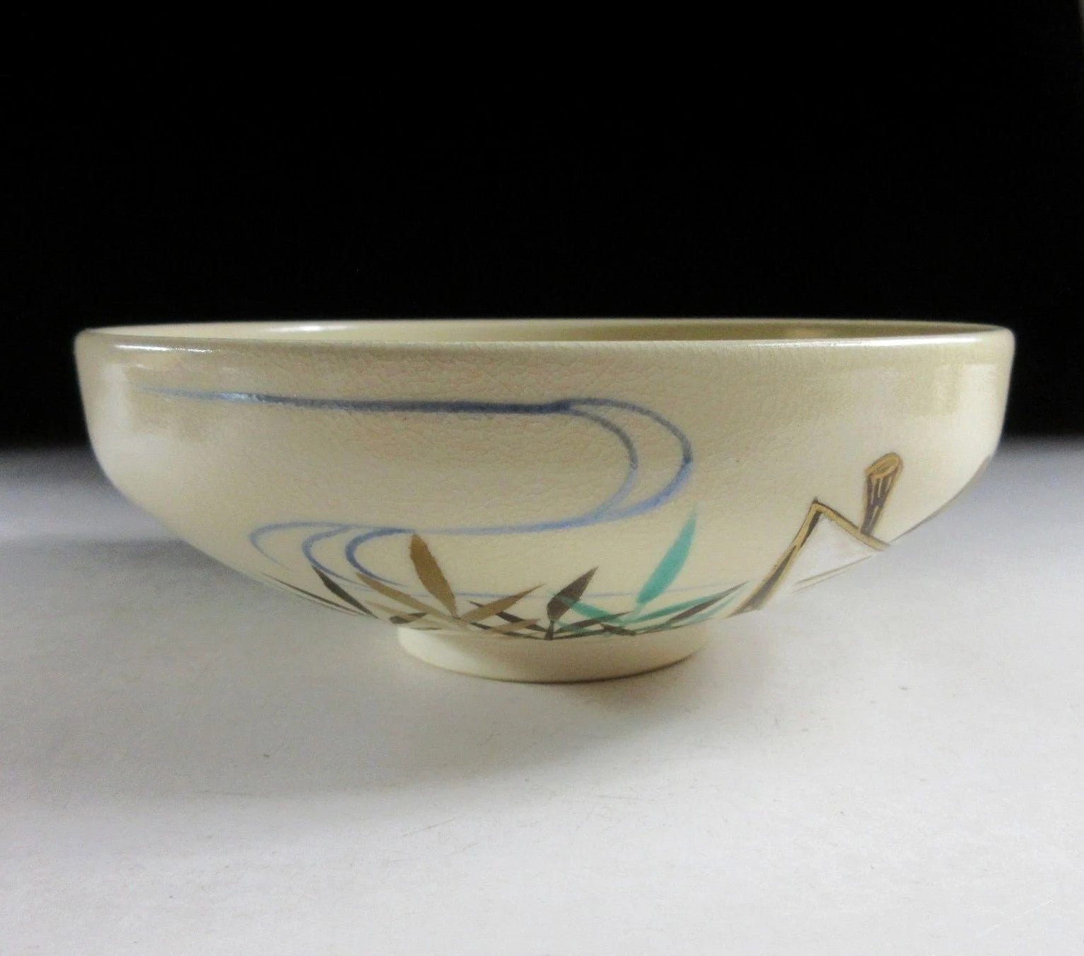 This listing is for a splendid Kyo-ware hira chawan made around 20 years ago by Shinonome Gama. It is wheel-thrown and the flat hira type used during the summer season. Hira chawan are shallow bowls with low sides designed to cool tea down faster. The bowl in this listing is decorated with cormorants and a small fishing boat. Cormorant fishing, or ukai as its known in Japanese, is a 1300 year old tradition that takes place during summer. Fishermen in long wooden boats lead cormorants that swim alongside the boat to catching fish. The event attracts many visitors during the summer season, and master fishermen have official patronage from the emperor. This is a splendid lightweight piece perfect for drinking thin or iced tea. The stamp of the kiln can be found on the bottom, sorry no box. *PLEASE NOTE THAT THE CHASHAKU IS NOT INCLUDED.