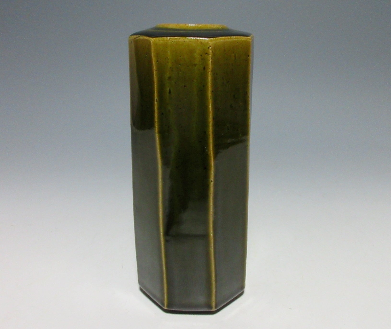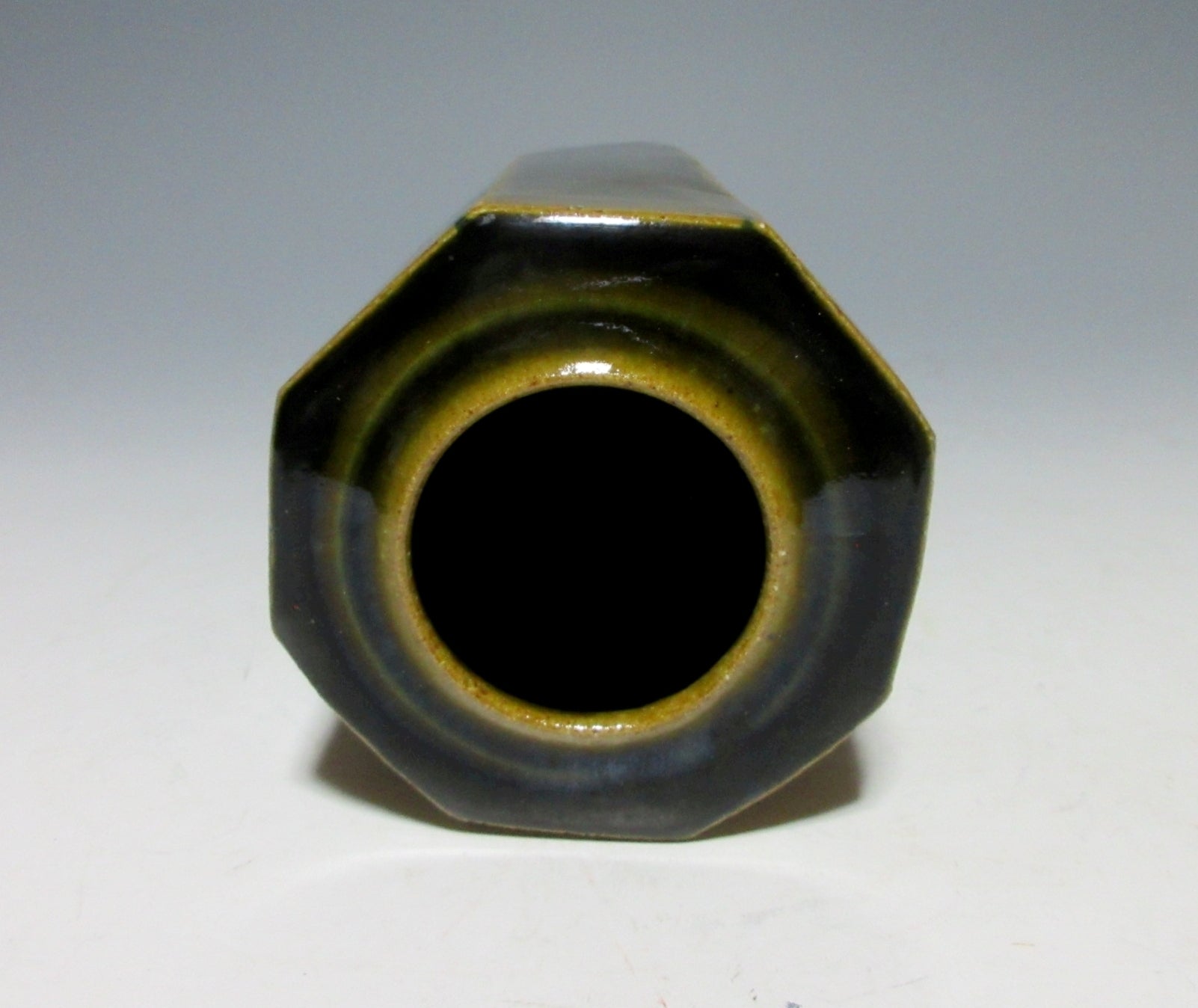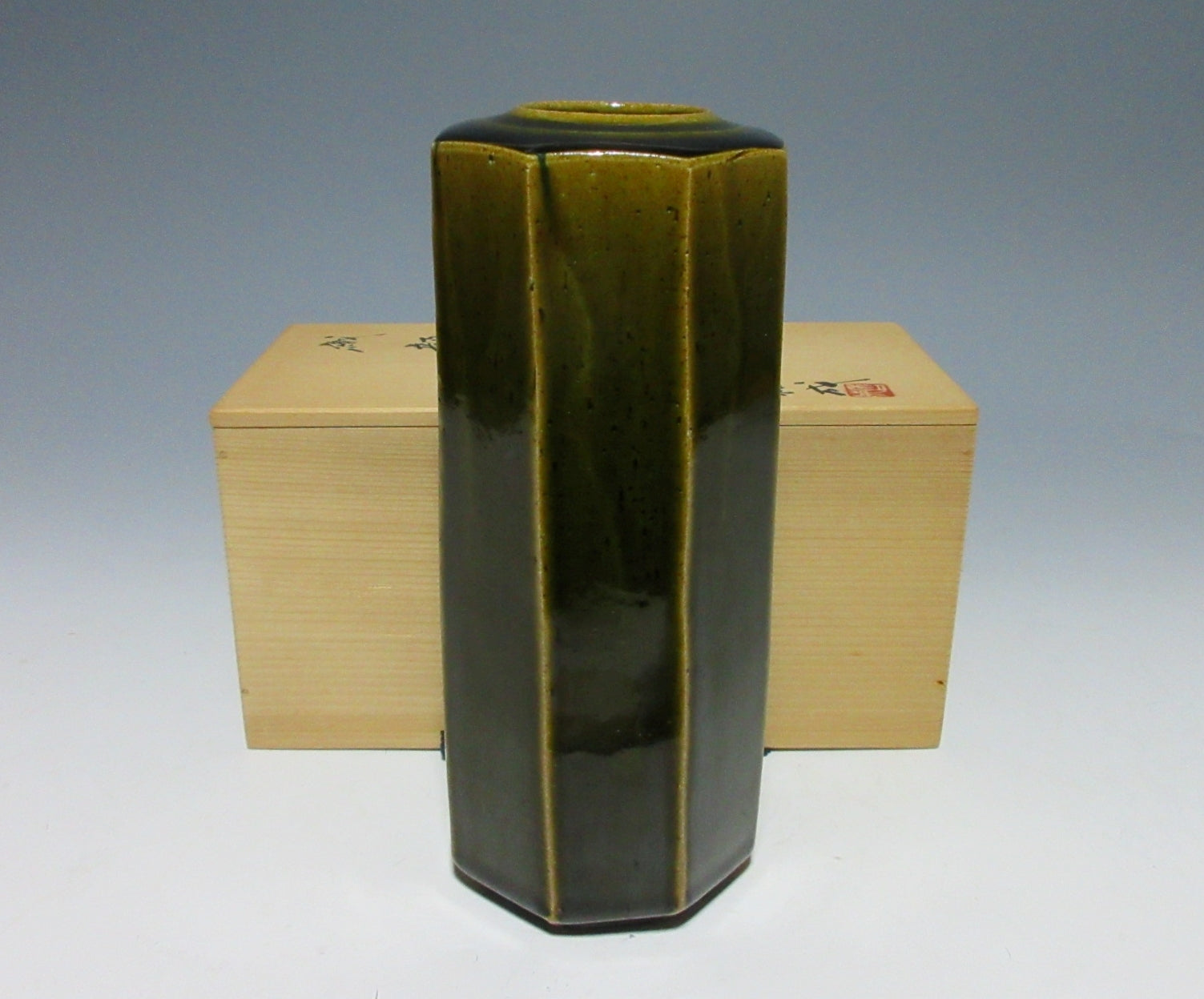 This listing is for an unassuming Oribe glaze vase made around 40 years ago by Shirai Kazunari. It is wheel-thrown and the sides were bevelled with a potter’s knife to create a piece with eight equal sides. The opening is wide enough to accommodate a small bunch of flowers, and the signature of the potter can be found on the bottom. It comes with its original signed wooden storage box, and it also comes with a Japanese language profile paper about the potter.