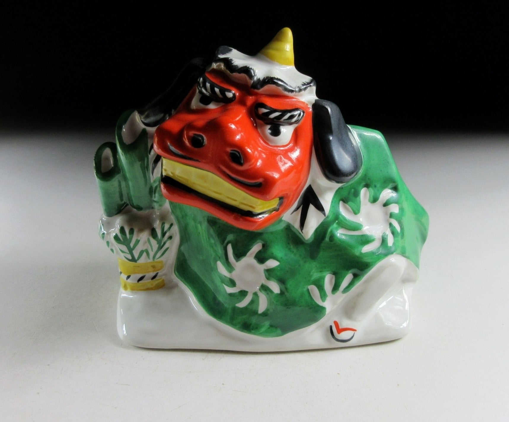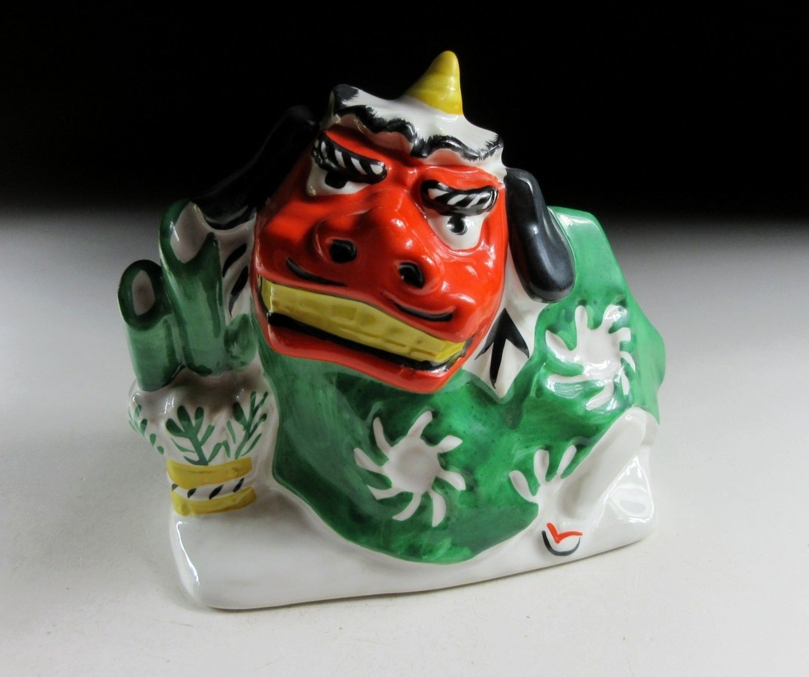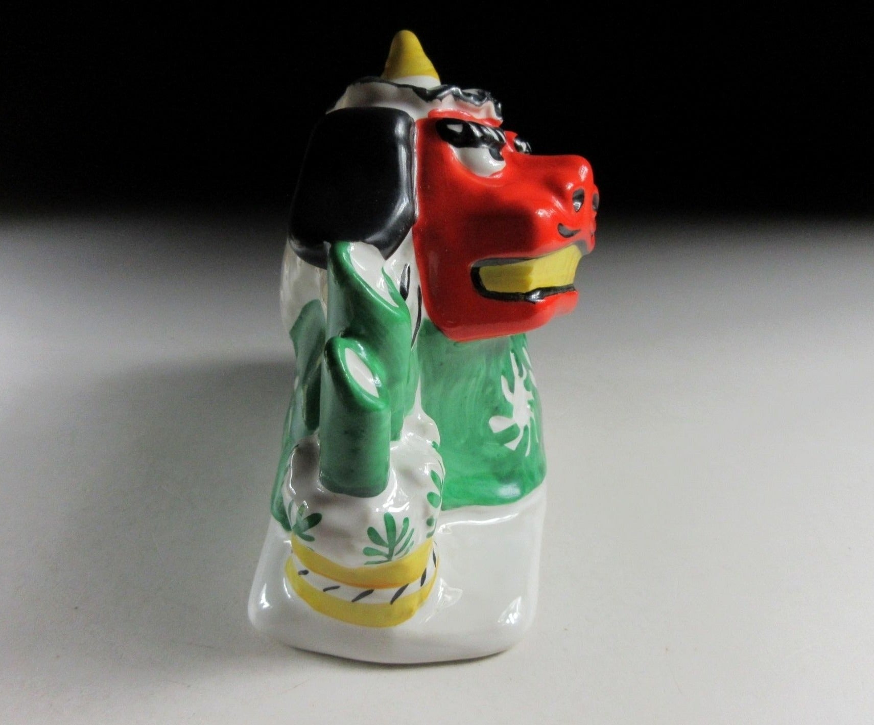 This listing is for a New Year ornament made around 20 years ago. During New Year men wear shishigashira masks and perform a shishimai dance to purify the spirit of those he ‘bites’ on the head, and also to drive out evil spirits. On the shishi’s right side is a traditional New Year ornament called a kadomatsu. Kadomatsu are placed in pairs in front of homes to welcome ancestral spirits or gods of harvest. The ornament accompanied some bottles of sake that were purchased many years ago. It is made from a slip mould and has a hollow interior.
