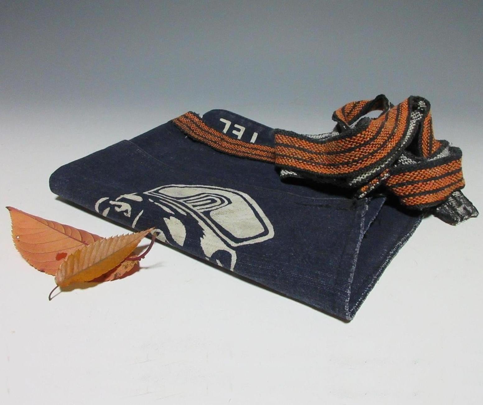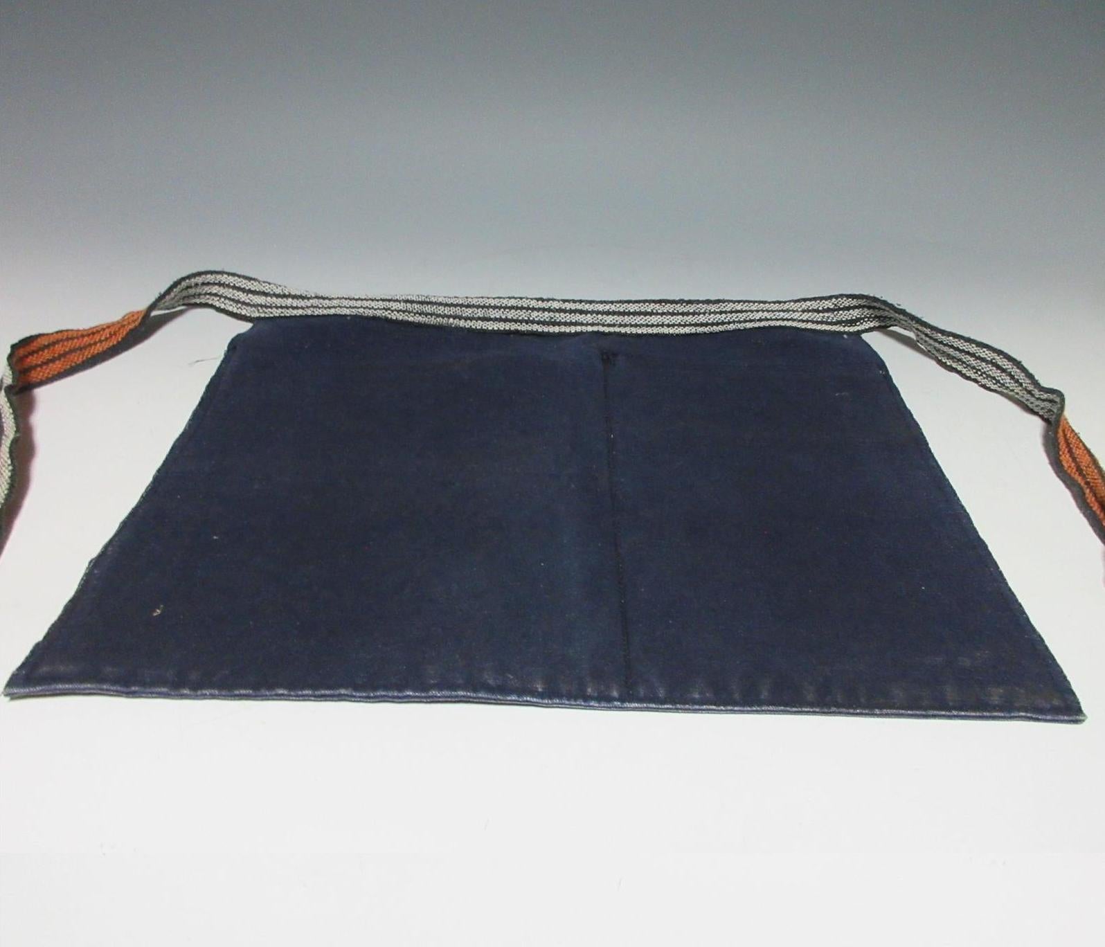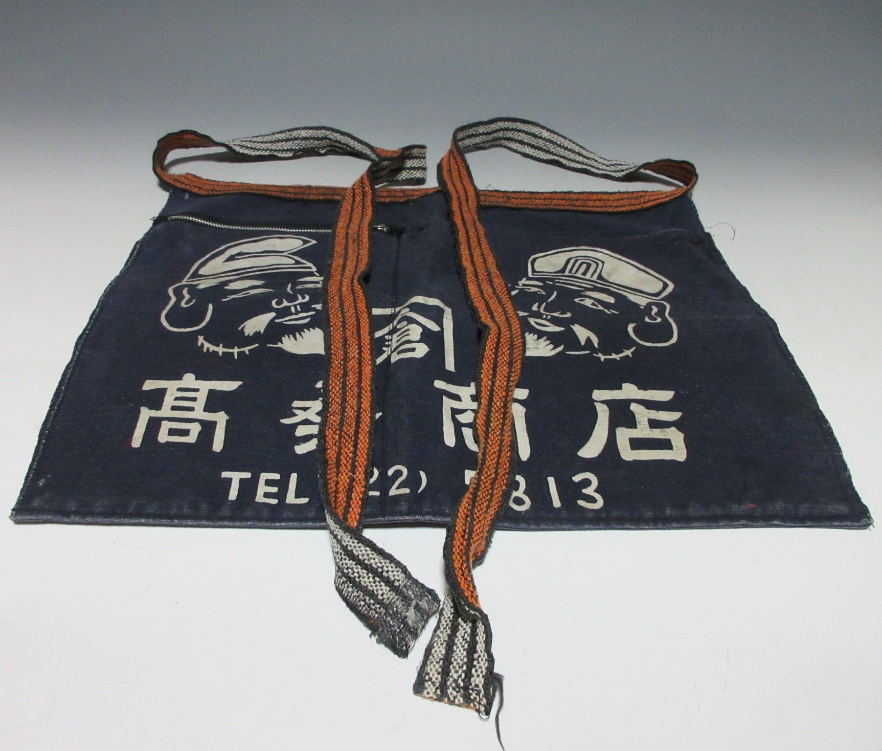 This listing is for a vintage maekake apron dating back to the late Showa period. A maekake is a traditional type of work wear made from thick indigo coloured fabric. Maekake feature front pockets and are tied around the waist by long straps, the straps can accommodate pretty much any waist size. The apron in this listing is printed with the name and phone number of a business and reads as ‘Kura Takakuwa Shoten’ which translates as Takakuwa Store Warehouse. Takakuwa is a seafood business located in Aomori Prefecture. Maekake can be worn as aprons or repurposed for making bags, cushion covers etc.