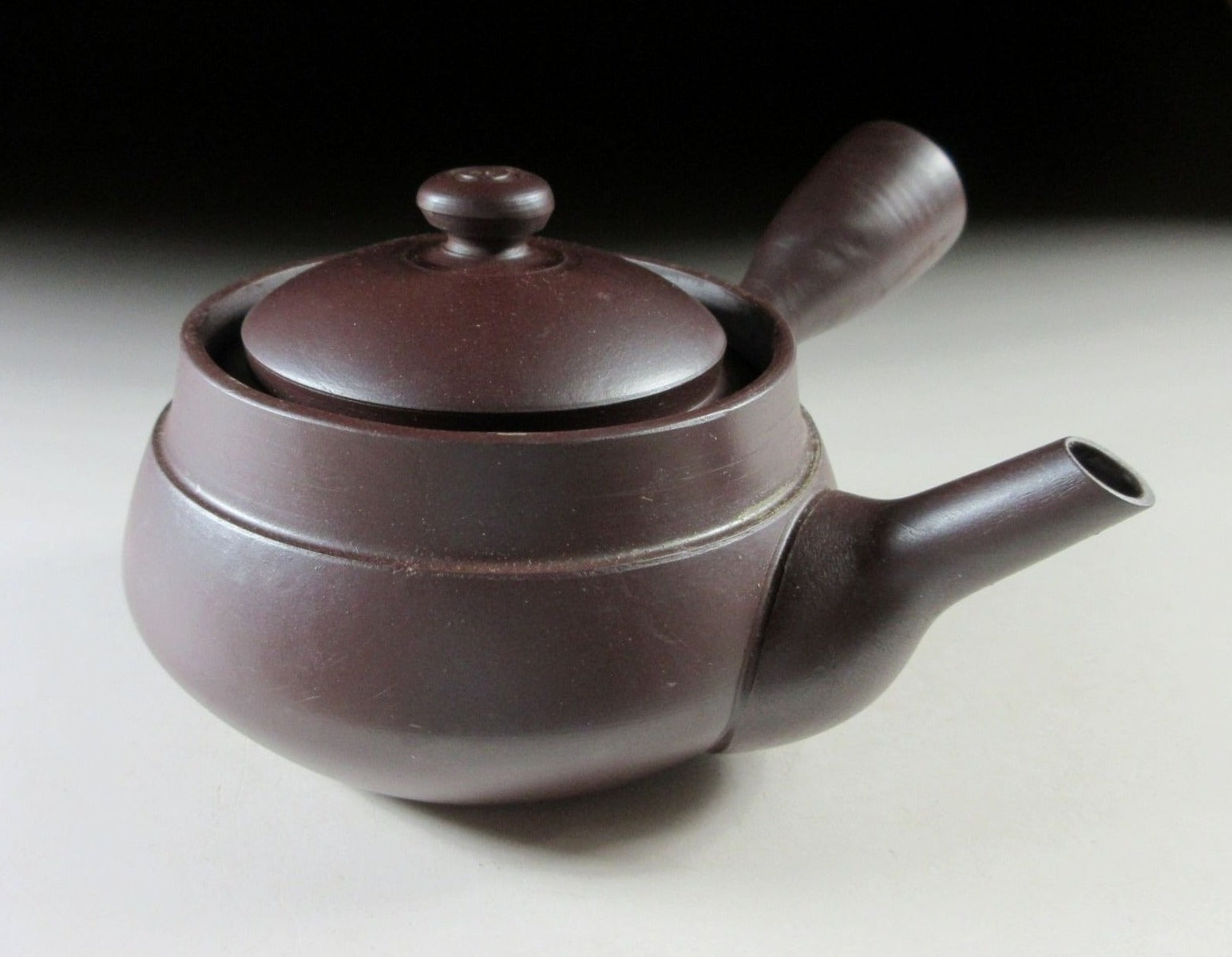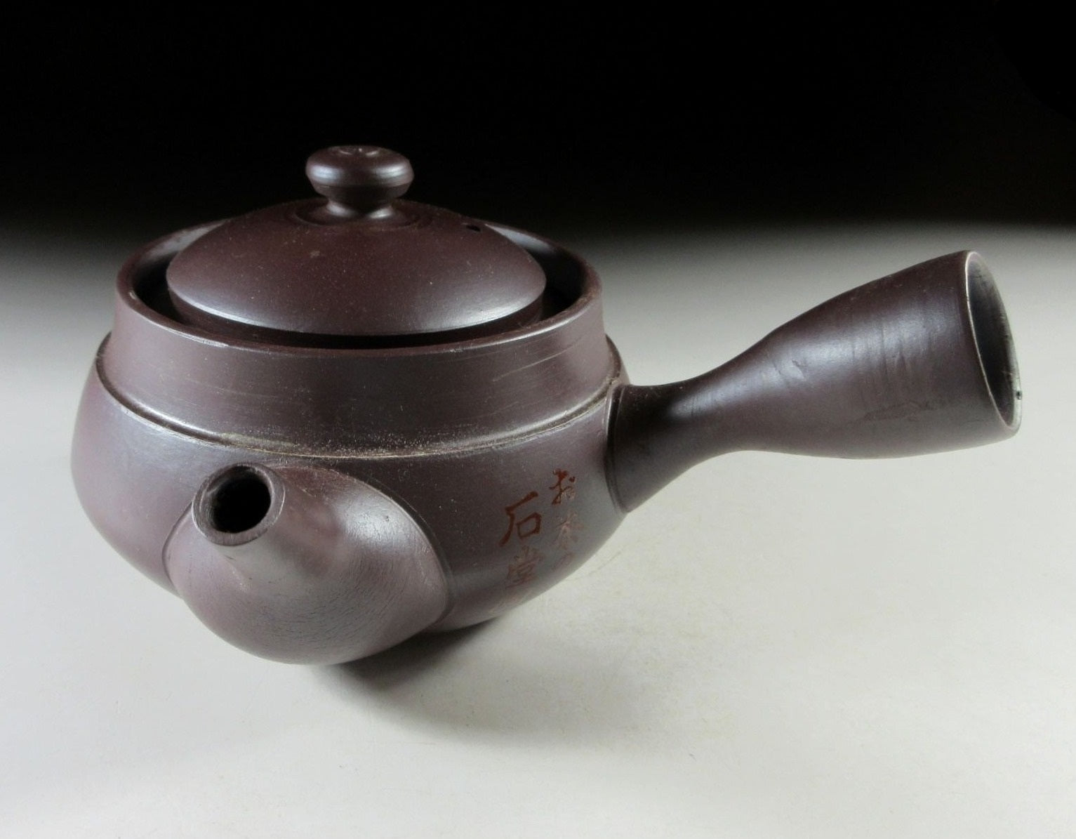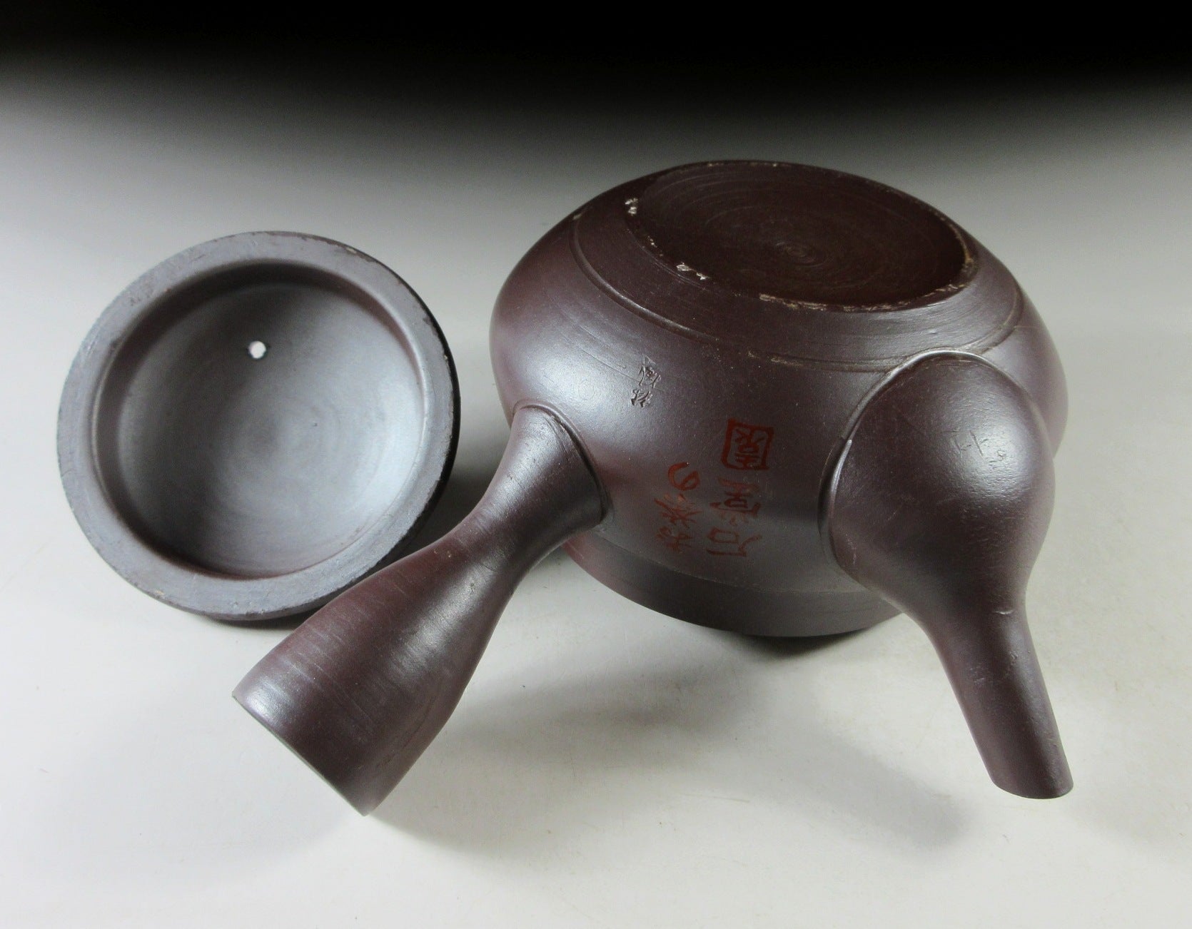 This listing is for a small Banko-ware kyusu style tea pot made around 20 years ago and signed ‘Shofu’. It is wheel-thrown and is made of unglazed high-fired stoneware, and it as a built in strainer to prevent tea leaves from pouring with the tea. It has a capacity of 220ml, and the signature of the potter can be found near the base. The red writing reads as ‘ocha no Ishido’ and is the name of a tea shop in Aizuwakamatsu, Fukushima Prefecture.