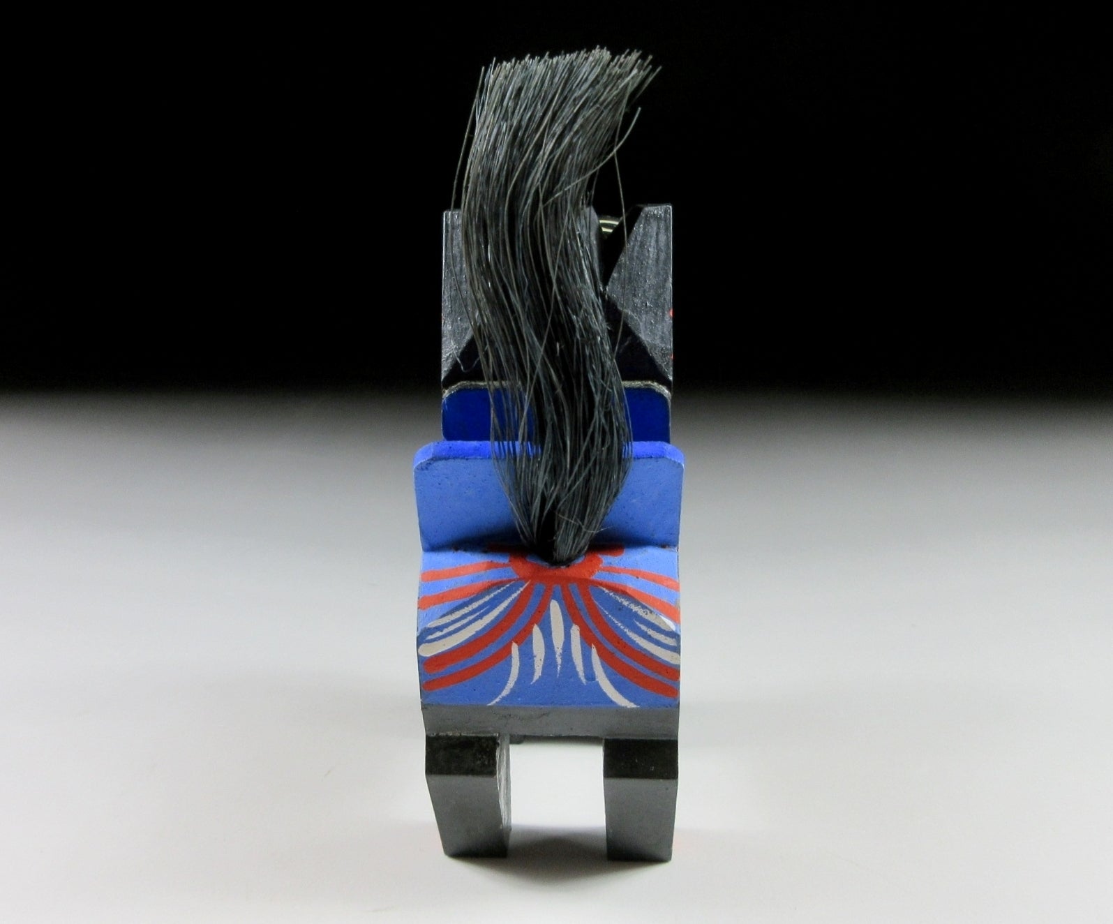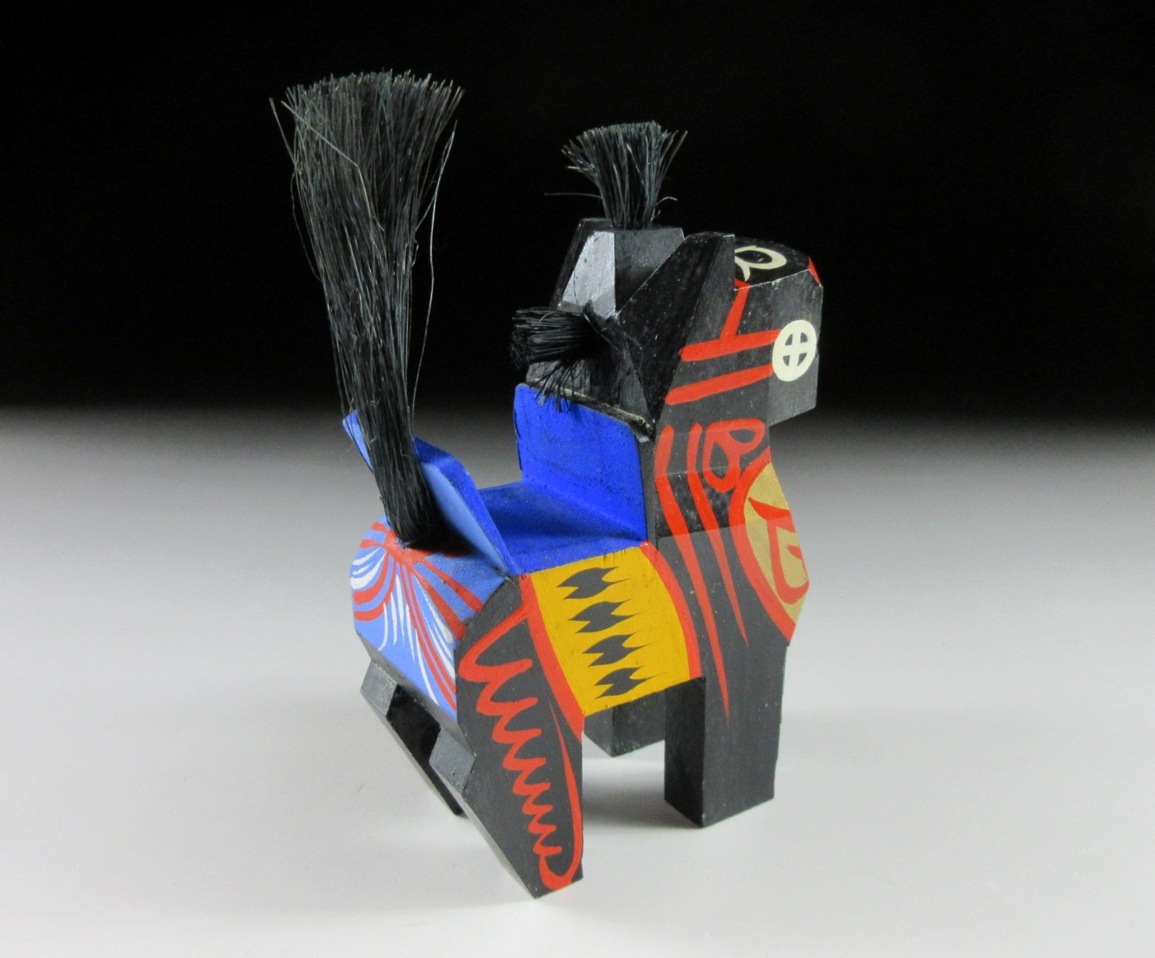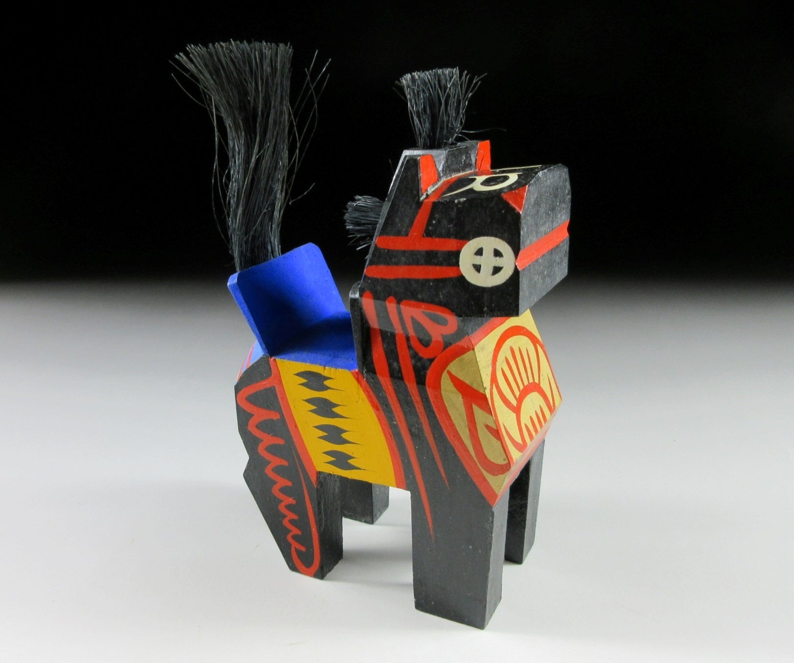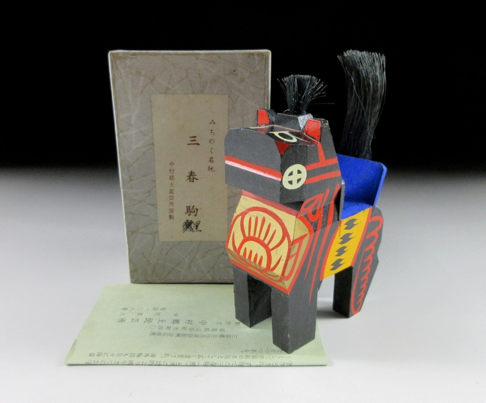This listing is for a very small Miharu-goma wooden horse dated Showa 33 (1958). Miharu-goma are brightly coloured wooden horses from Fukushima. They are angular in shape and feature red, blue and yellow decorations hand-painted onto the body. The mane and tail are made from coarse hemp fibre, and Miharu-goma are generally black or white in colour. It is said that the origin of Miharu-goma is based on a legend about 100 wooden horses that suddenly appeared and helped Heian shogun Sakanoue no Tamuramaro succeed in battle. The little horse in this listing comes with a Japanese language profile paper about Miharu-goma, and its original paper storage box. The handwriting on the bottom of the box reads as ‘Showa 33 (1958) Yadake Onsen sounvenir’.