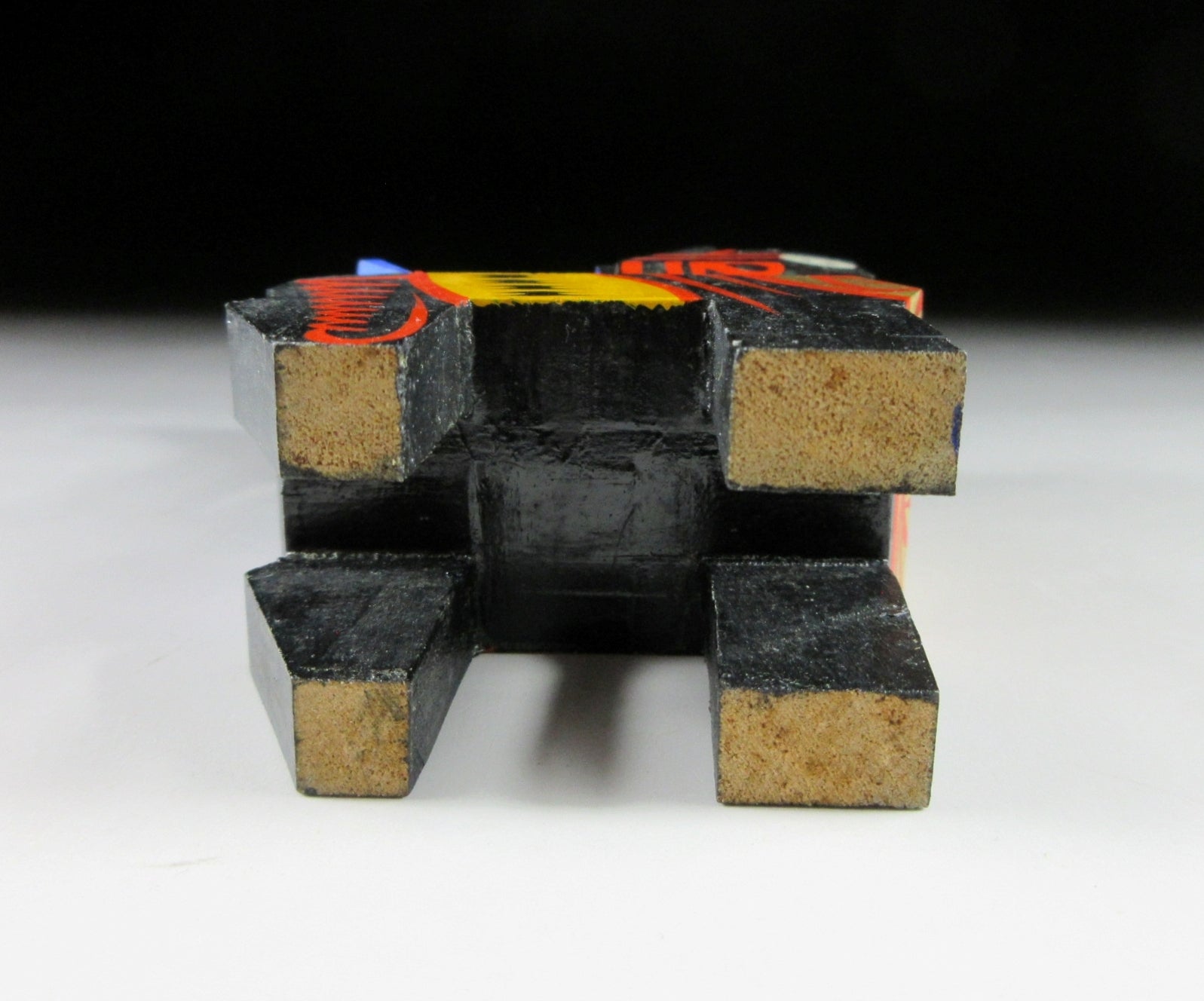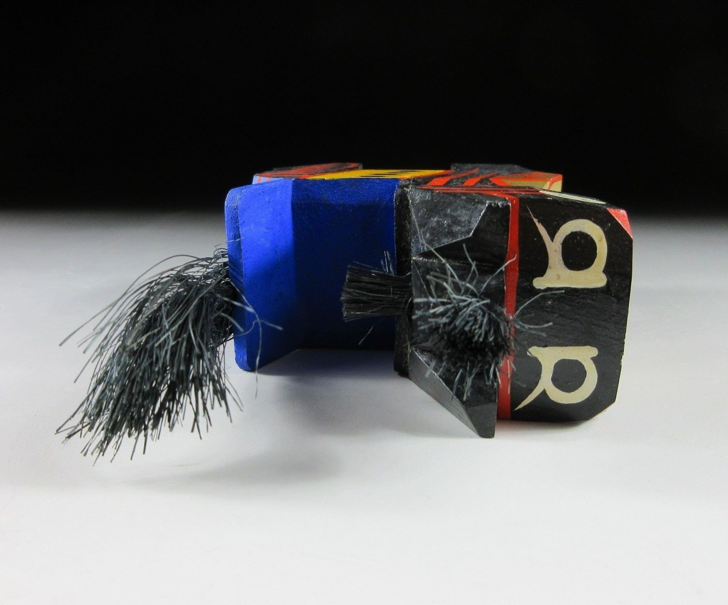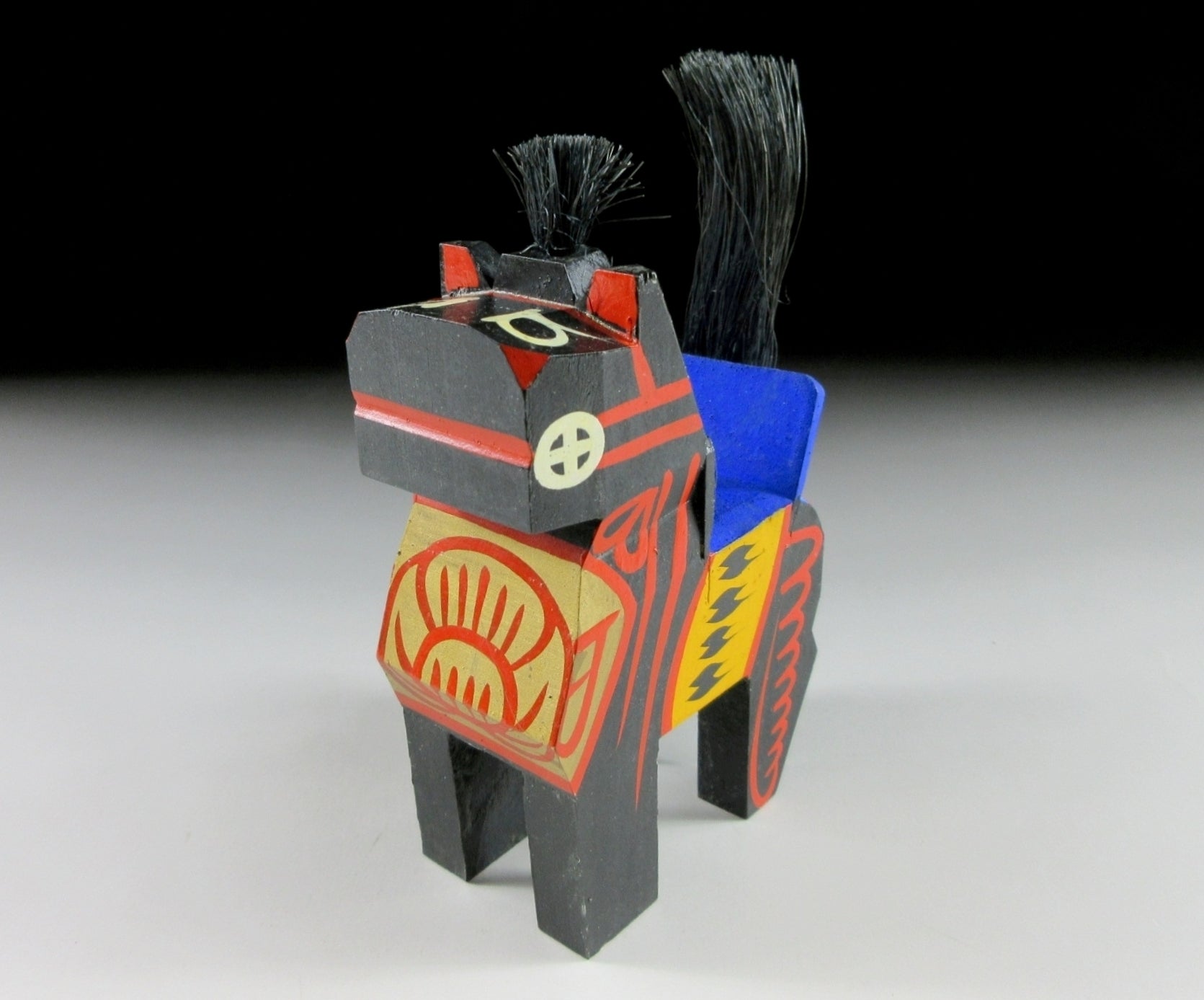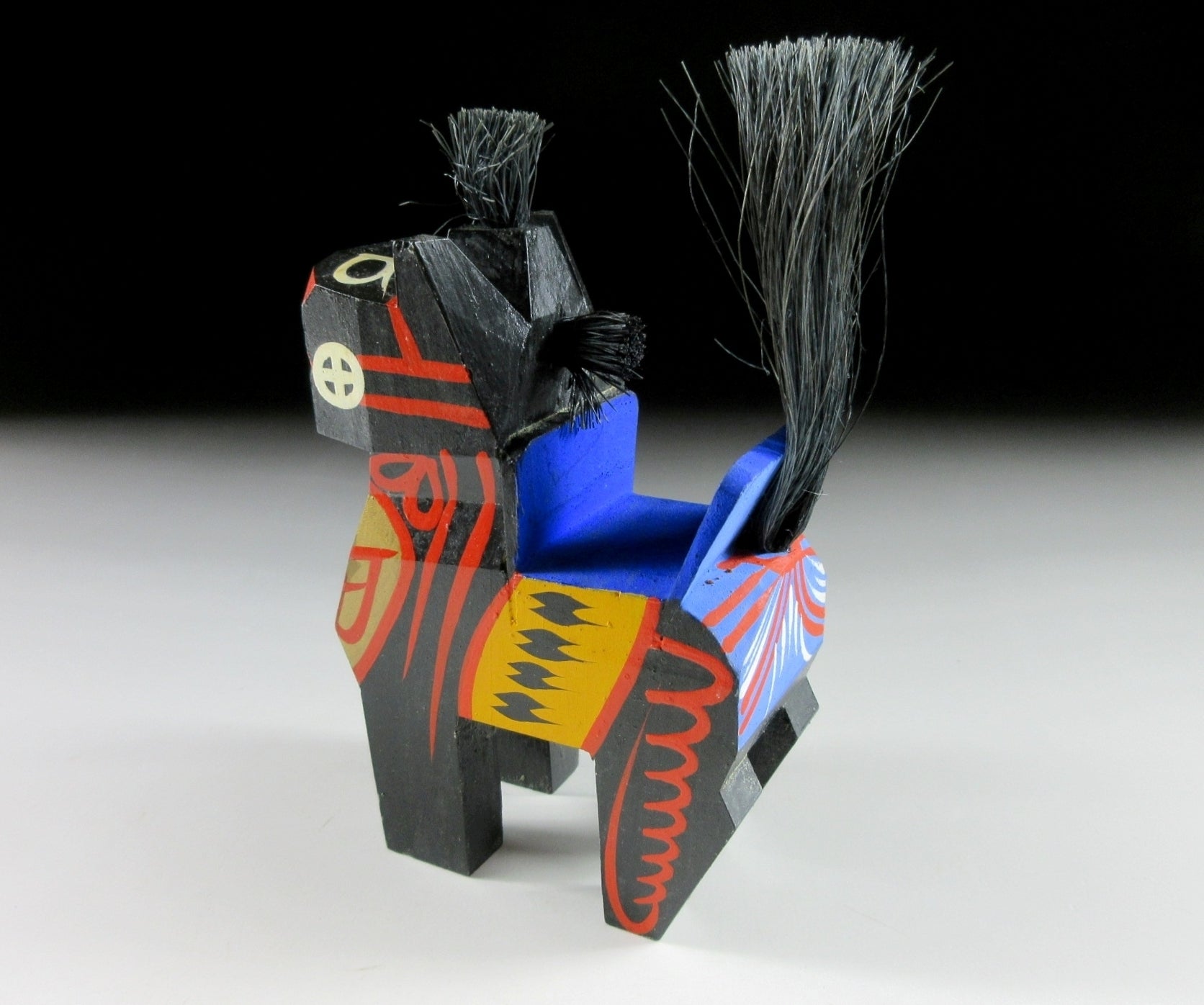 This listing is for a very small Miharu-goma wooden horse dated Showa 33 (1958). Miharu-goma are brightly coloured wooden horses from Fukushima. They are angular in shape and feature red, blue and yellow decorations hand-painted onto the body. The mane and tail are made from coarse hemp fibre, and Miharu-goma are generally black or white in colour. It is said that the origin of Miharu-goma is based on a legend about 100 wooden horses that suddenly appeared and helped Heian shogun Sakanoue no Tamuramaro succeed in battle. The little horse in this listing comes with a Japanese language profile paper about Miharu-goma, and its original paper storage box. The handwriting on the bottom of the box reads as ‘Showa 33 (1958) Yadake Onsen sounvenir’.