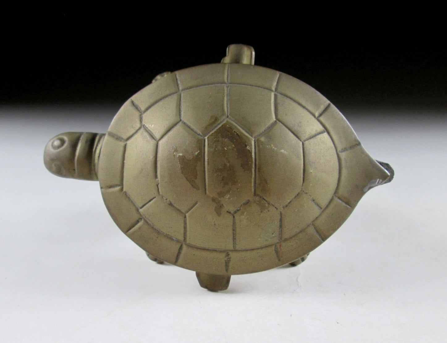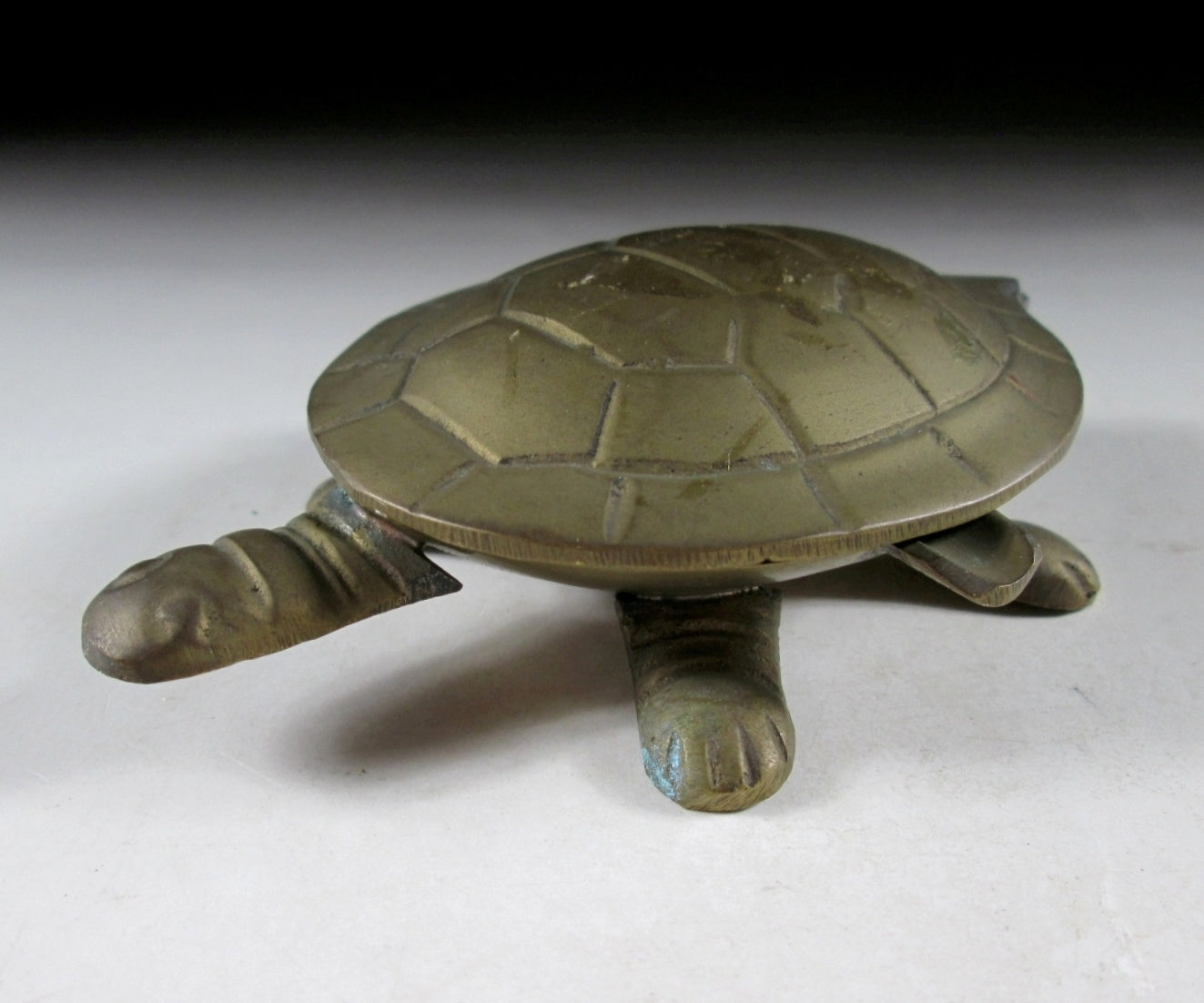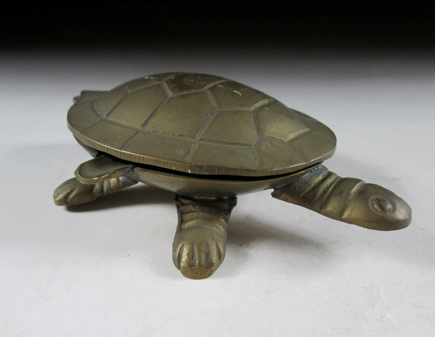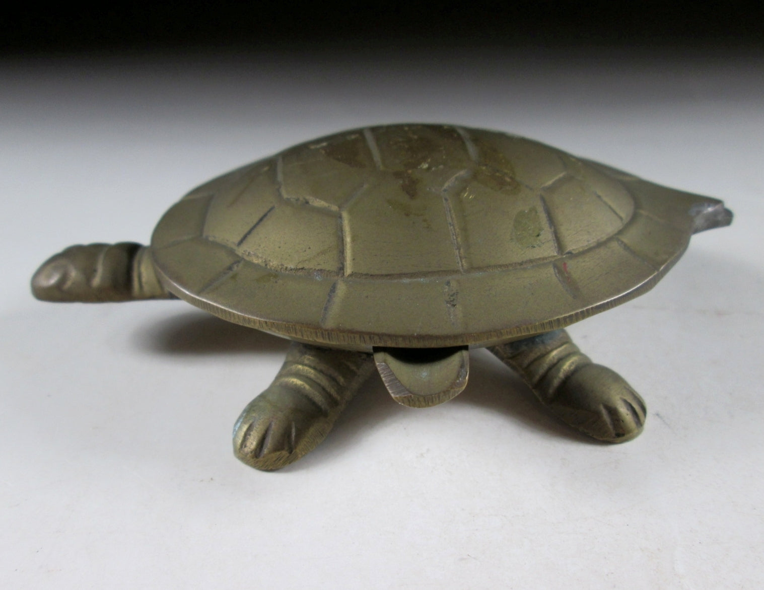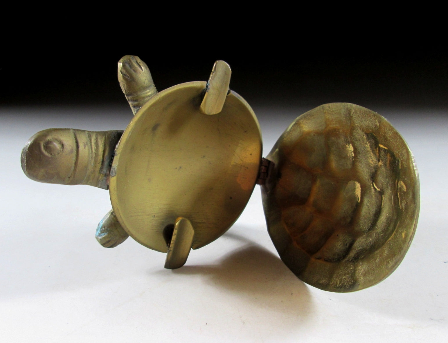 This listing is for a small brass tortoise with a hinged lid made around 30 years ago. It was made in India and the shell can be opened and used as an ashtray. India has been producing brass items since ancient times. Brass is an alloy of copper and zinc and is quite malleable, thus allowing it to be hammered without cracking. Handicrafts such as trinket boxes, vases, ornaments and jewellery became popular as souvenirs so little tortoise ashtrays have made their way around the world. These items were also exported in large quantities over the years.