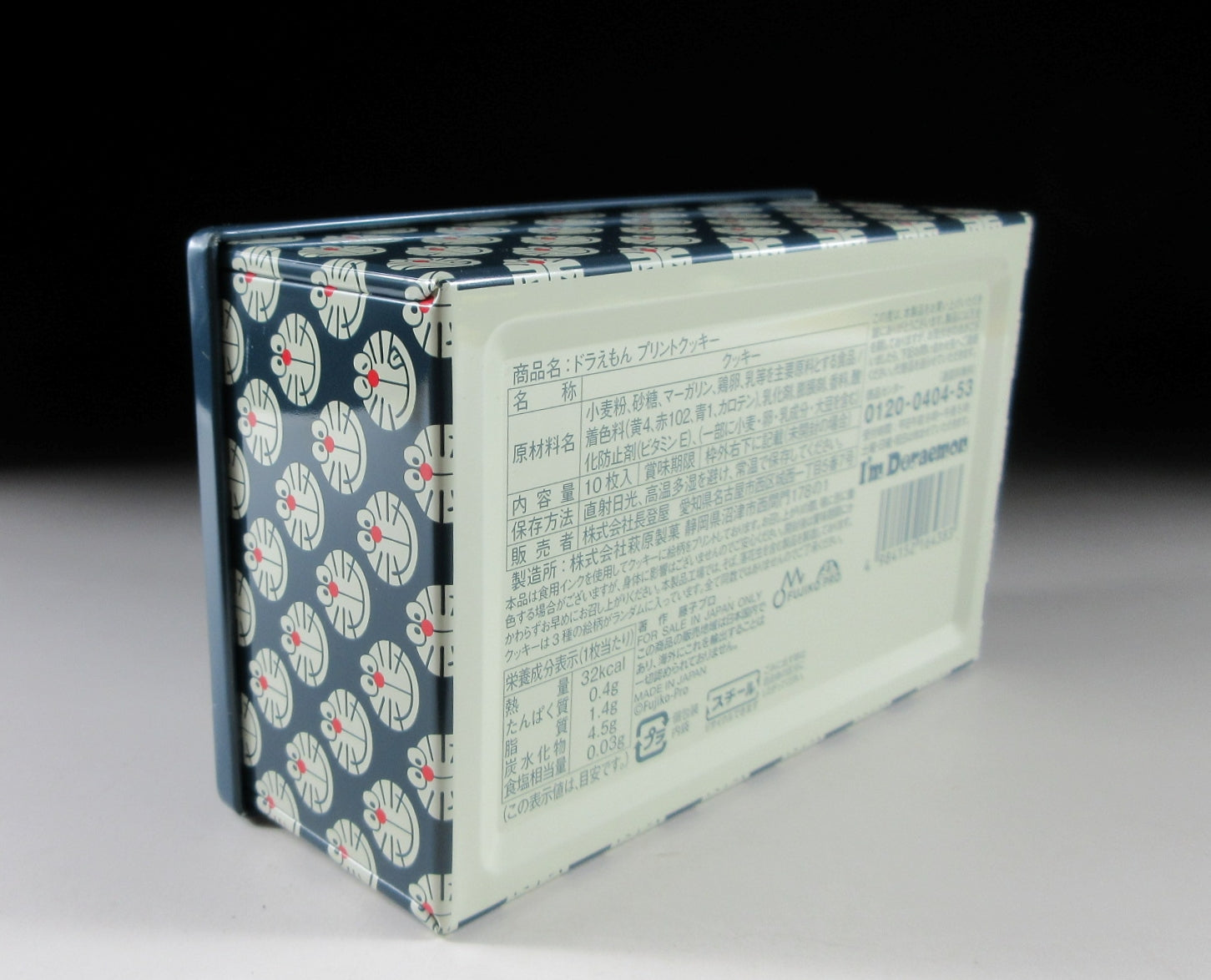 This listing is for a small collectible Doraemon tin which used to hold Doraemon shaped biscuits/cookies. It features one larger Doraemon face on the hinged lid, with many smaller faces on the sides of the tin. The tin is being sold empty without its original contents.