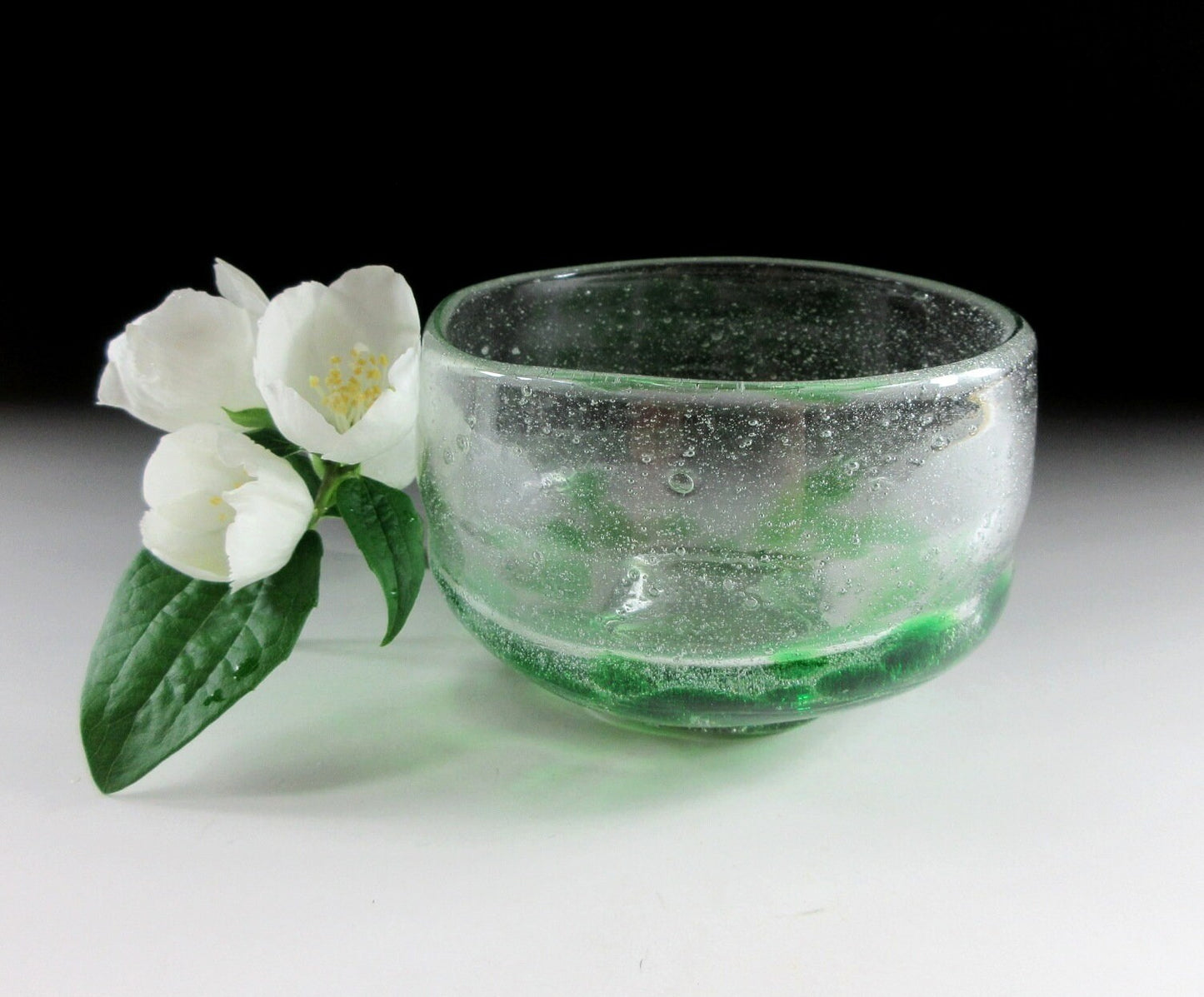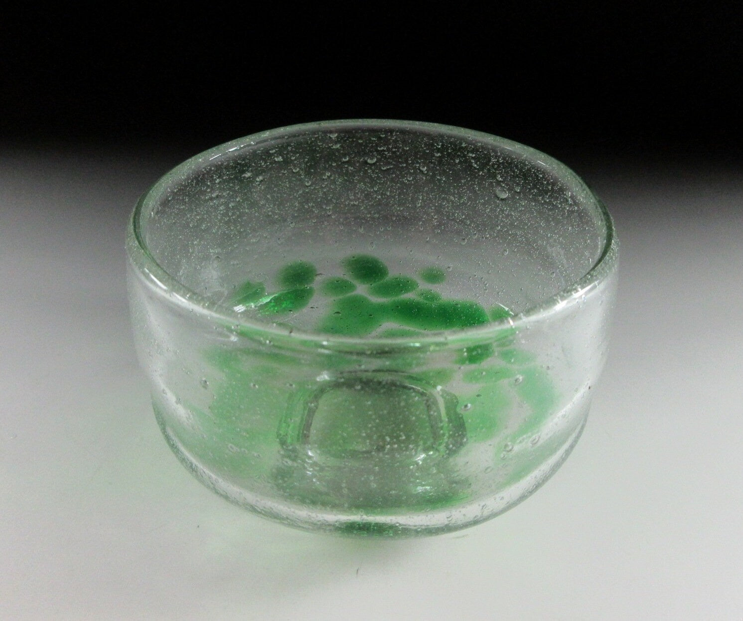 This listing is for a small glass chawan made around 20 years ago. It has thick walls and features dabs of green that appear to float on the surface of the bowl. I’m not sure if this piece is heat resistant or not so I recommend using it for iced tea just to be on the safe side. It comes with its original paper storage box.