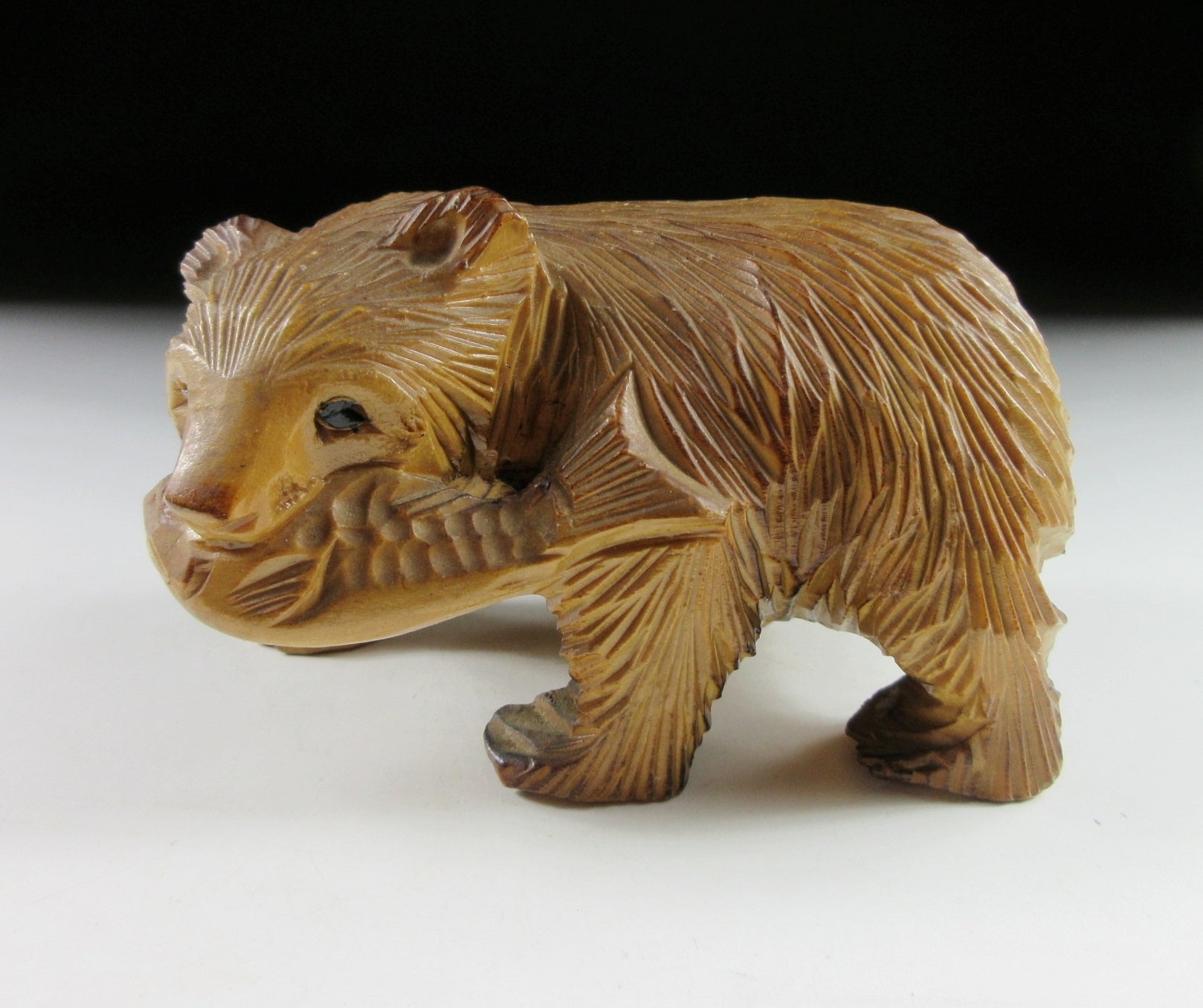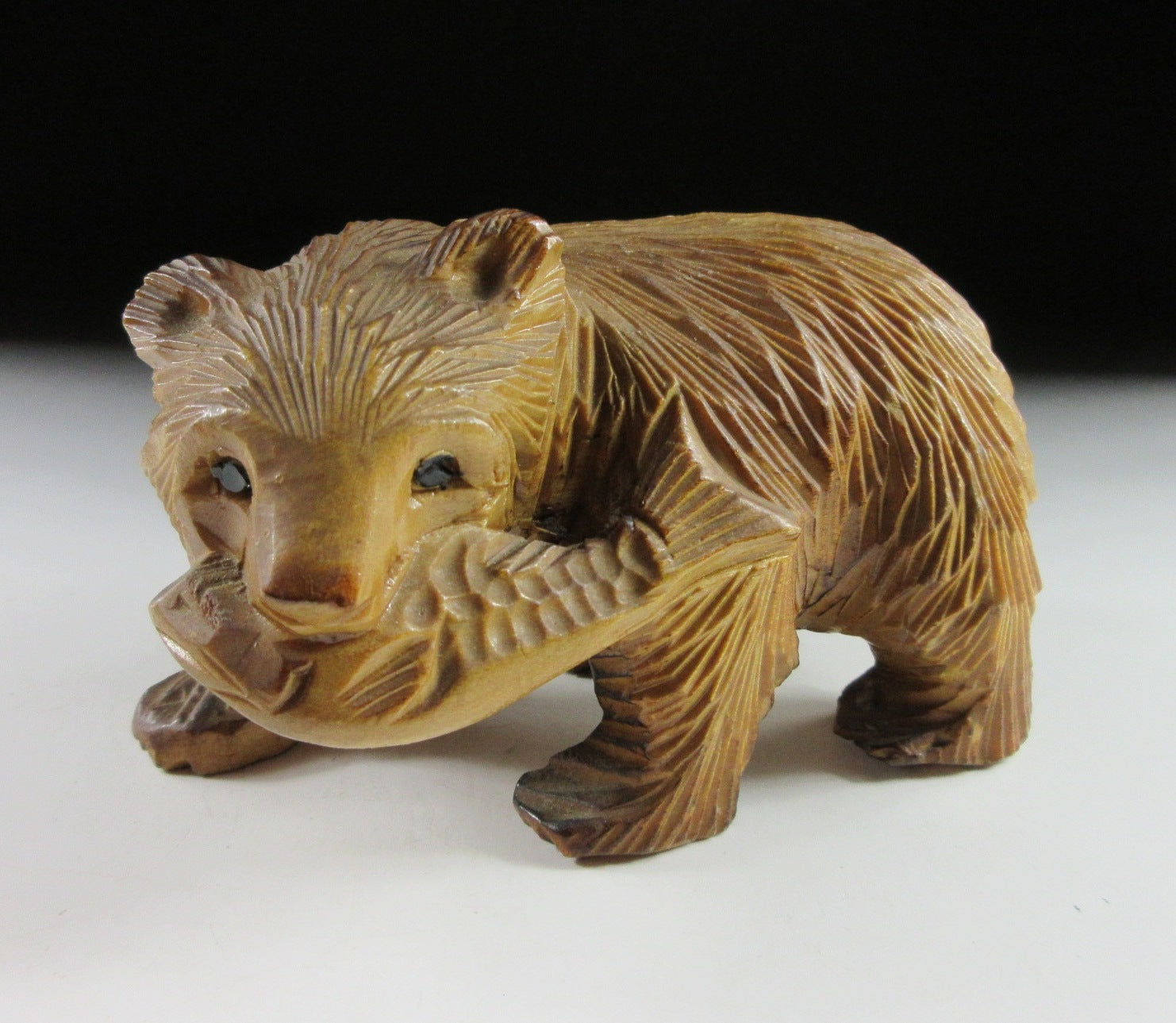 This listing is for a SMALL higuma bear carving from the northern island of Hokkaido, made about 20-30 years ago. The texture of the fur is very finely carved, and it is depicted with a freshly caught salmon in its mouth. The bear has been fashioned from one single piece of wood and is entirely hand carved. Hokkaido bears are usually black, so this natural coloured piece is a little more unusual.