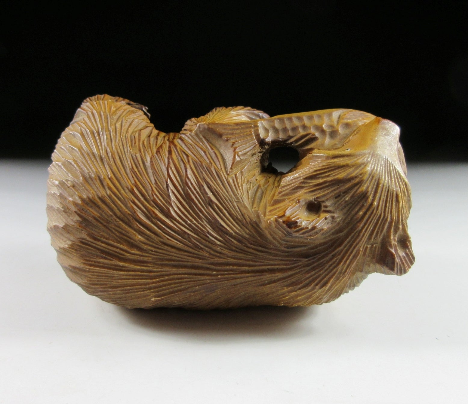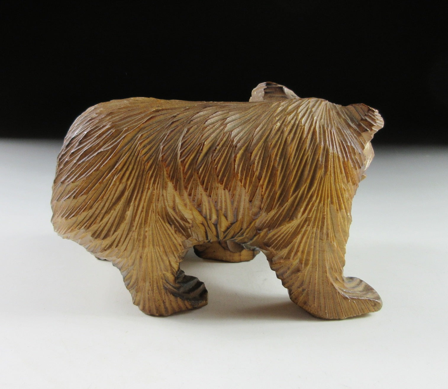 The Ainu people of Japan first started commercial wood carving back in the1920s. Traditionally their carvings consisted of religious objects, however dire economic circumstances forced them to turn to wood carving for tourists. Their wares, particularly the higuma bear carvings, became very popular as souvenirs due to their very realistic appearance. The Emperor himself acquired a higuma bear made by a highly talented carver named Umetaro Matsui in 1938. Following this Matsui won many awards for his work, and gradually these ornate carvings became recognized as beautiful works of art.