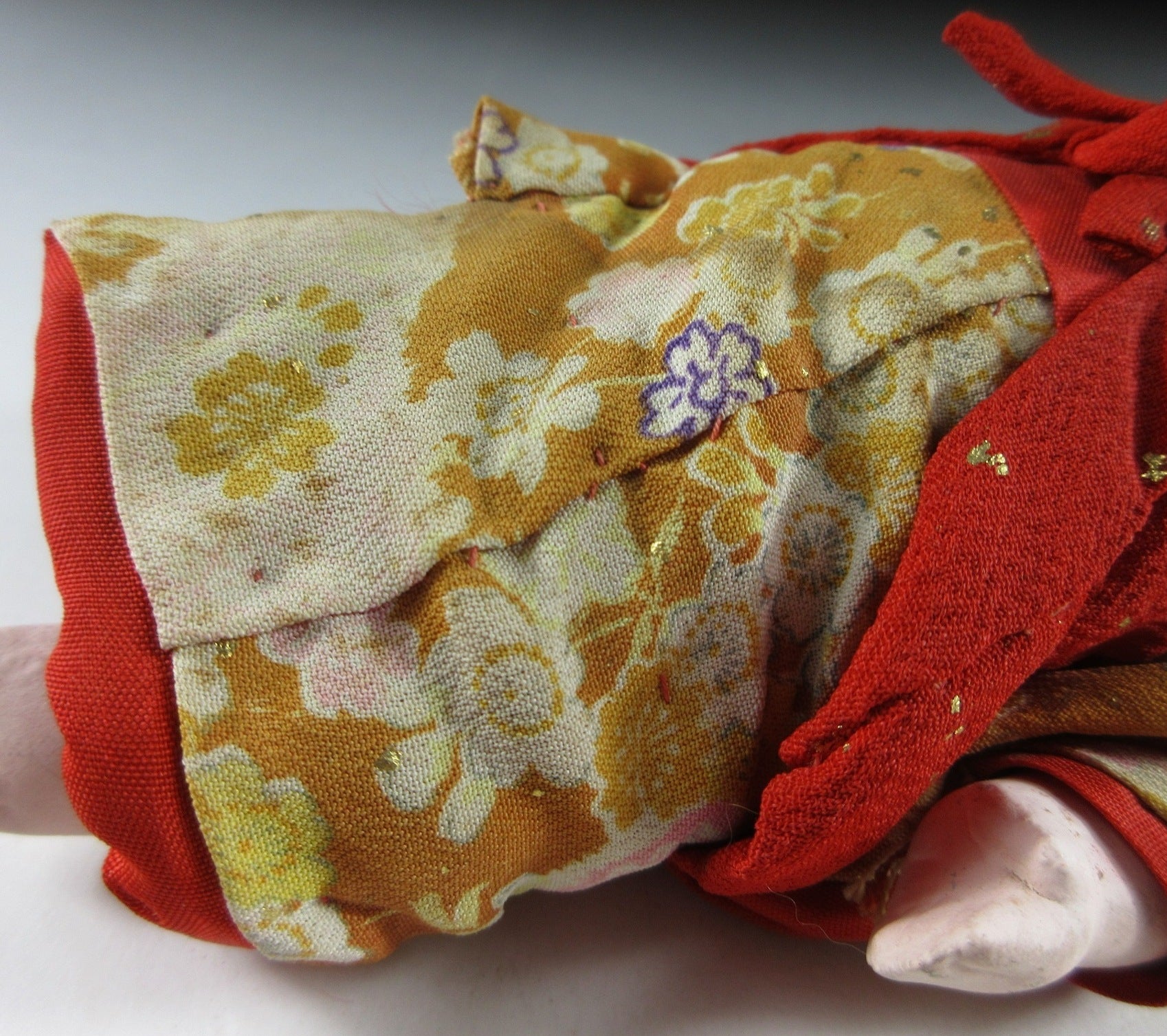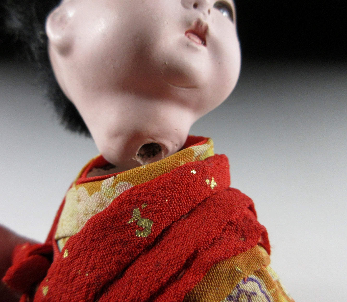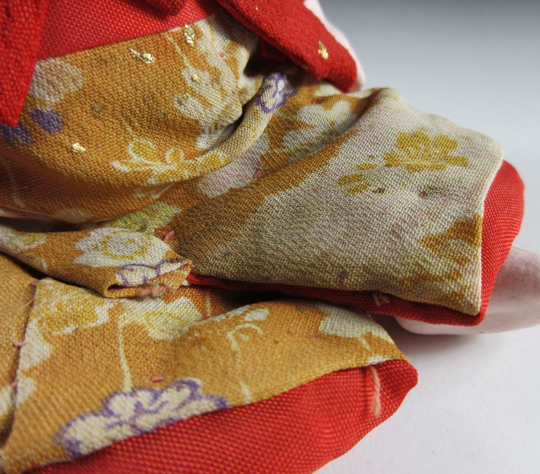Ichimatsu dolls take their name from an 18th century kabuki performer, although the dolls themselves represent small boys and girls and not adults. Parts of the doll are made from clay press moulds. The clay is fired and then coated with thick layers of gofun, a paste made of crushed oyster shell powder mixed with animal based glue. Before the gofun is applied the doll is given glass eyes, and layers of gofun are painted over the eyes. The craftsman then carves away the surface until the eyes become visible again. Finally, the skin colour is added and detail is added to the lips, eyes, and cheeks. Hair is added by pasting strips of real human hair around the head. It is the doll maker’s job to cut the hair on the front to create a fringe. The torso is wrapped with paper and often bears to seal of the craftsman. The finally stage involves dressing the doll in clothes which is usually formal and a type of kimono. These clothes are not necessarily made of silk, it is quite common for dolls to have their costumes fashioned from chirimen crepe fabric.