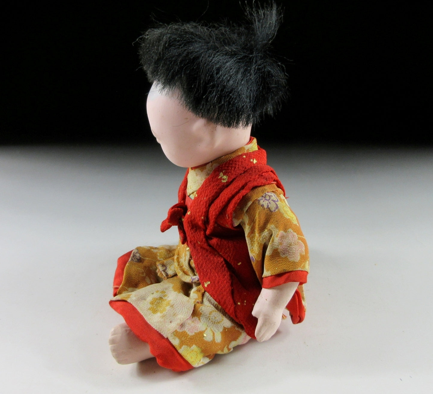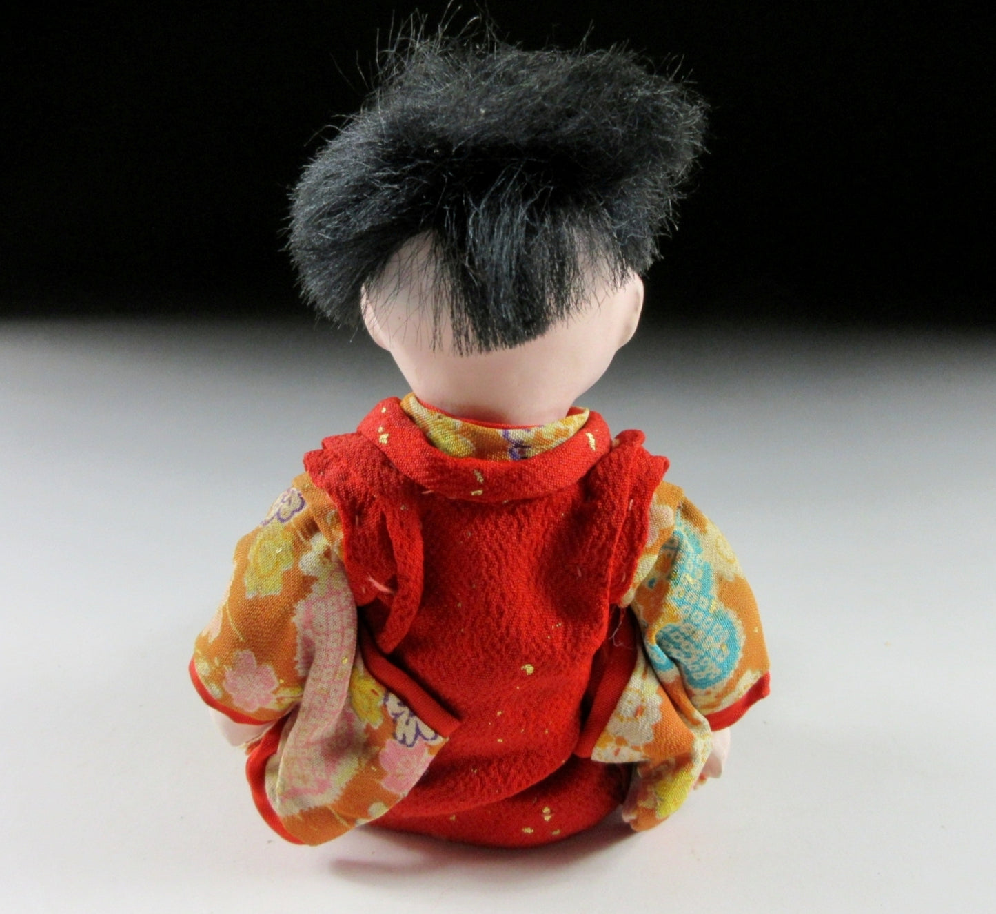 This listing is for a VERY SMALL Ichimatsu ningyo doll, he weighs just 90grams. He is dressed in his original costume and his hair consists of actual human hair. His head is attached with the original string, and his gentle features were created from layers of gofun that were applied over a clay base. His tiny mouth is closed and he has delicate colouring on his lips. Please read below regarding the condition of the doll as he needs a bit of love and care.