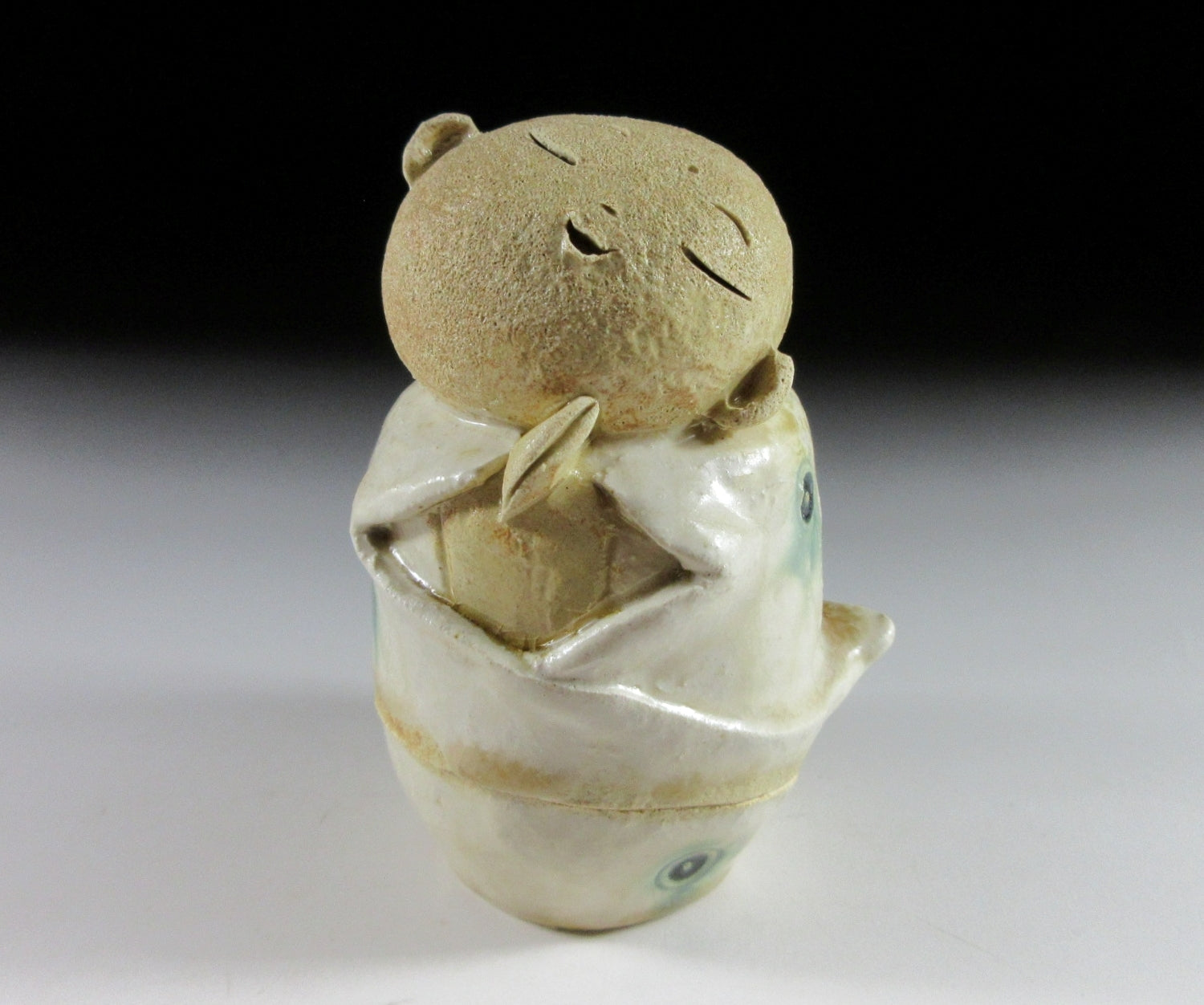 This listing is for a SMALL Mino-ware joss stick incense burner. It is made of stoneware and moulded to resemble a Jizo monk. Jizo is one of the most respected deities in Japan, and temples sometimes have areas like caves containing hundreds of small Jizo statues. Jizo eases suffering and can often be found along travel routes and paths, his purpose being to point you in the right direction in life. The burner in this listing has seven vents in the back and a small pottery stick holder on the interior. To burn long incense sticks simply leave the top off. This little burner is also suitable for burning incense cones. It comes with its original paper storage box.