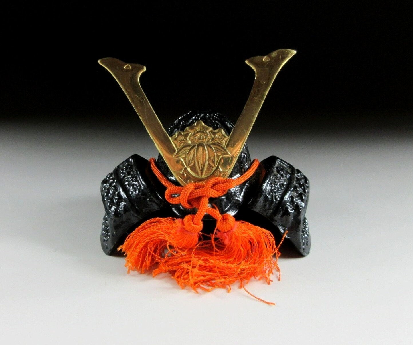 This listing is for a very small Kabuto samurai helmet ornament made around 20 years ago. It is made of iron and the maedate crest is made of brass and attached to the helmet with a screw. There’s a thin orange cord with tassels attached underneath. This piece would make a great paperweight, or perfect to pop on a small shelf as an ornament.