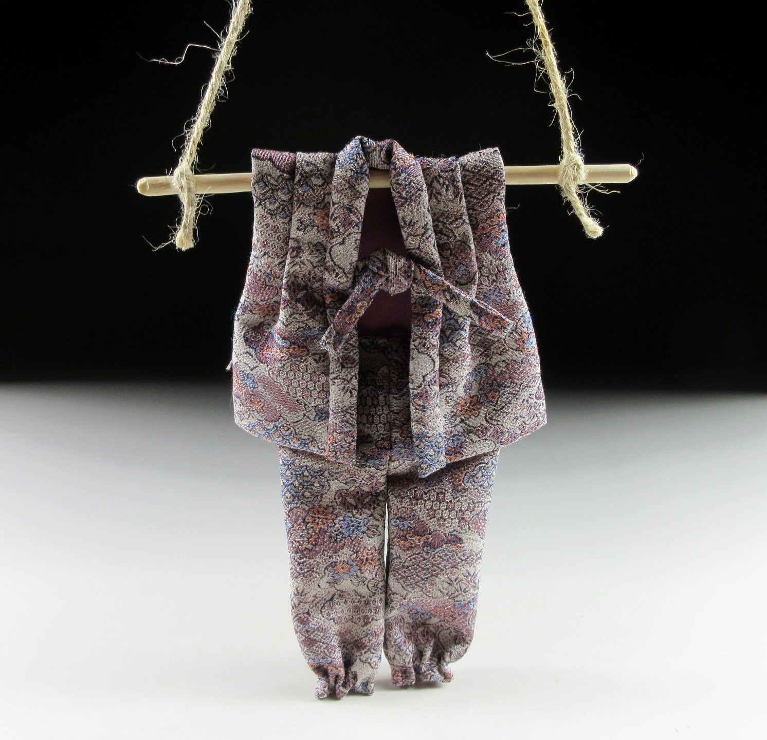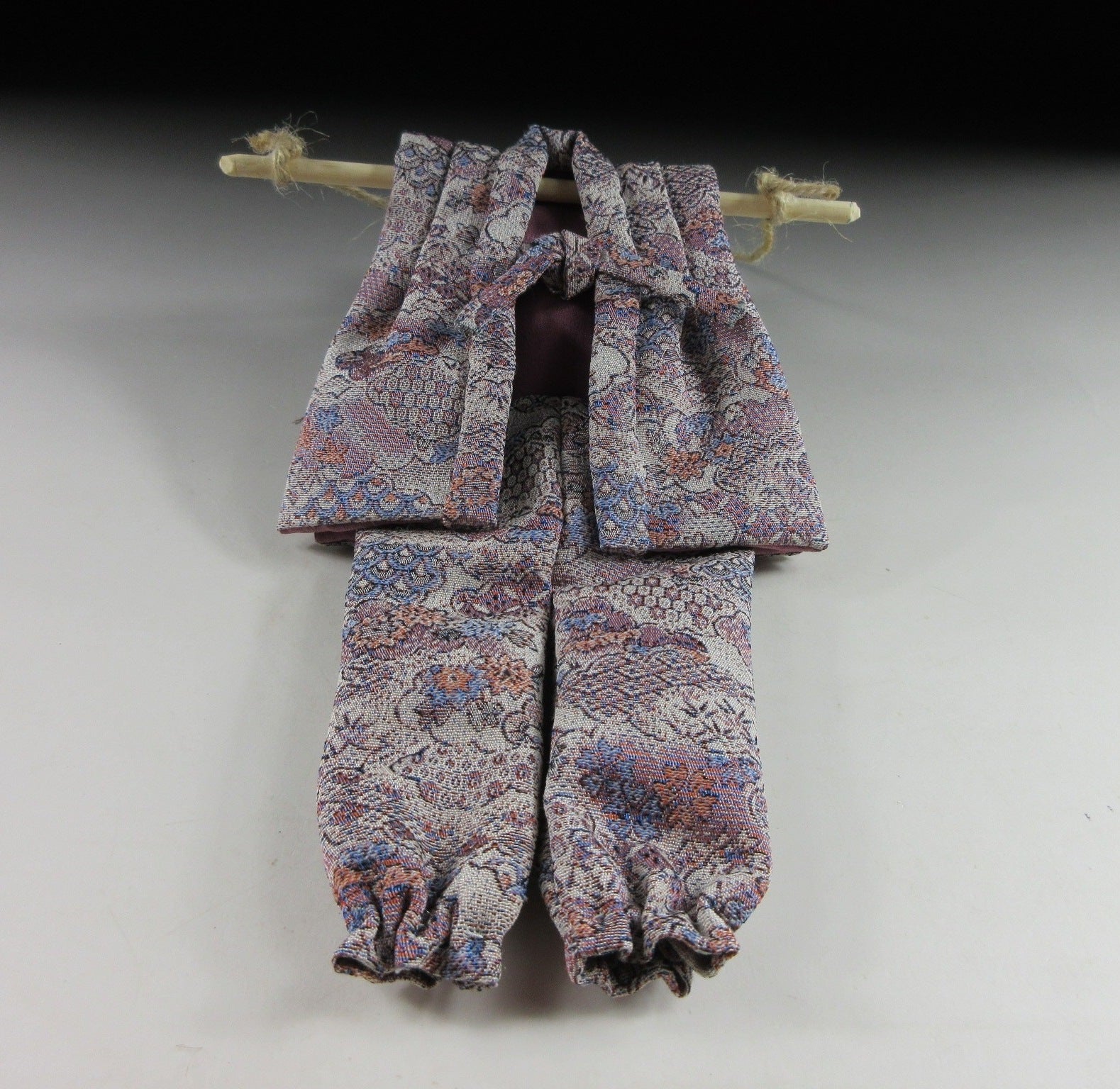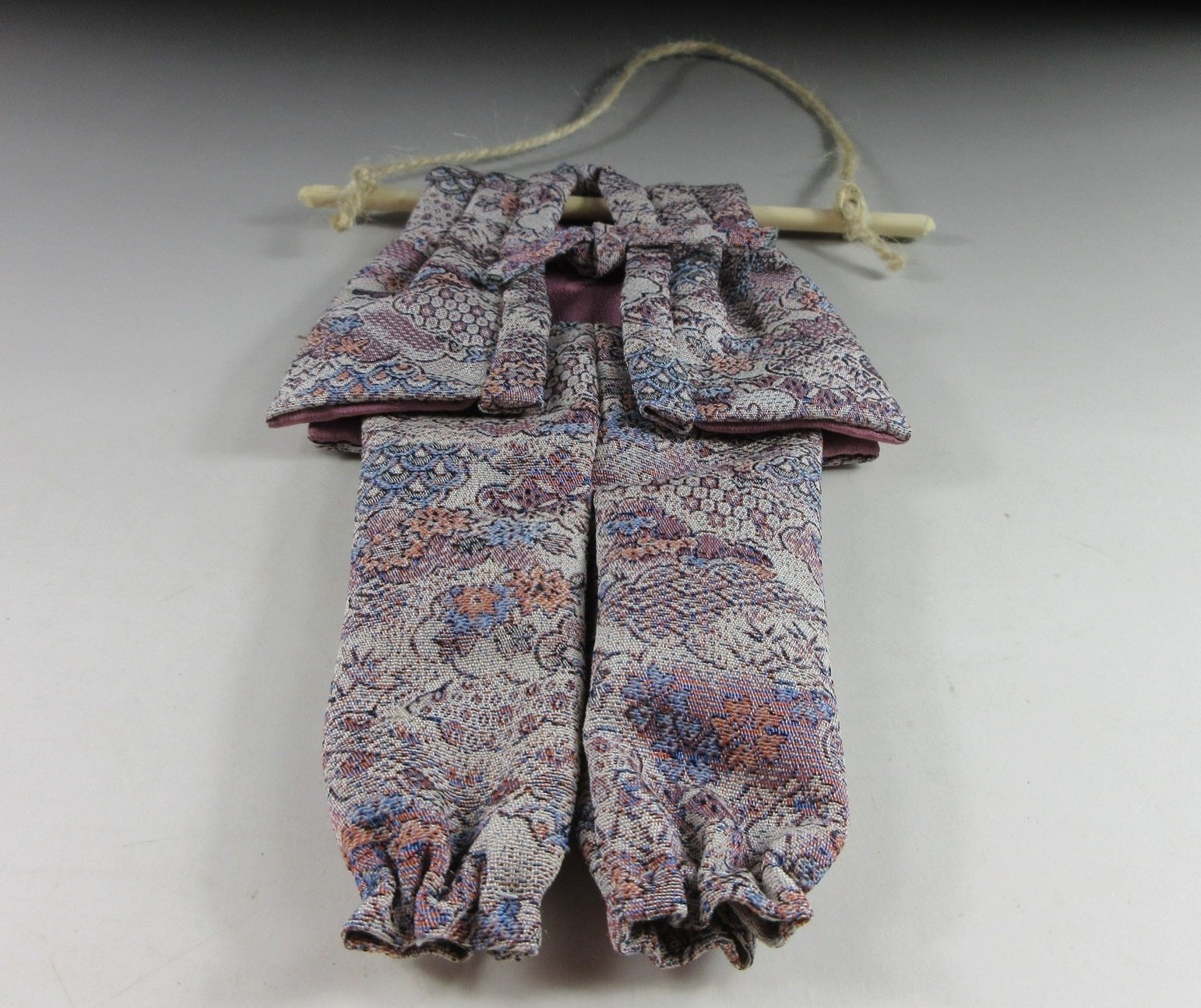 This listing is for a small hanging ornament made by an elderly lady who sews and sells vegetables in my neighbourhood. Due to her advanced age she cannot see so well these days so her daughter assists her. It is handmade using vintage fabric and features monpe pants with a matching noragi jacket. Monpe were baggy trousers and noragi were patched jackets worn by rural people when doing farm work. The jacket is sleeveless and is tied at the front. All proceeds go to the lady who makes them.