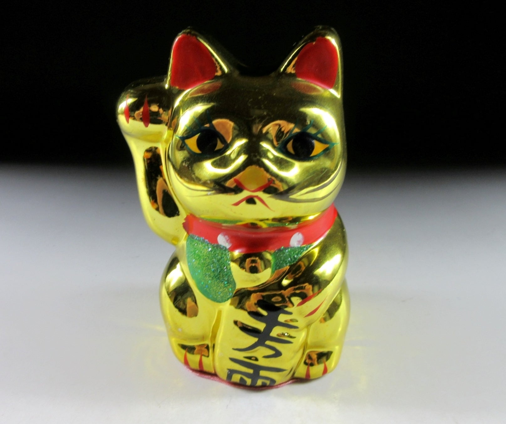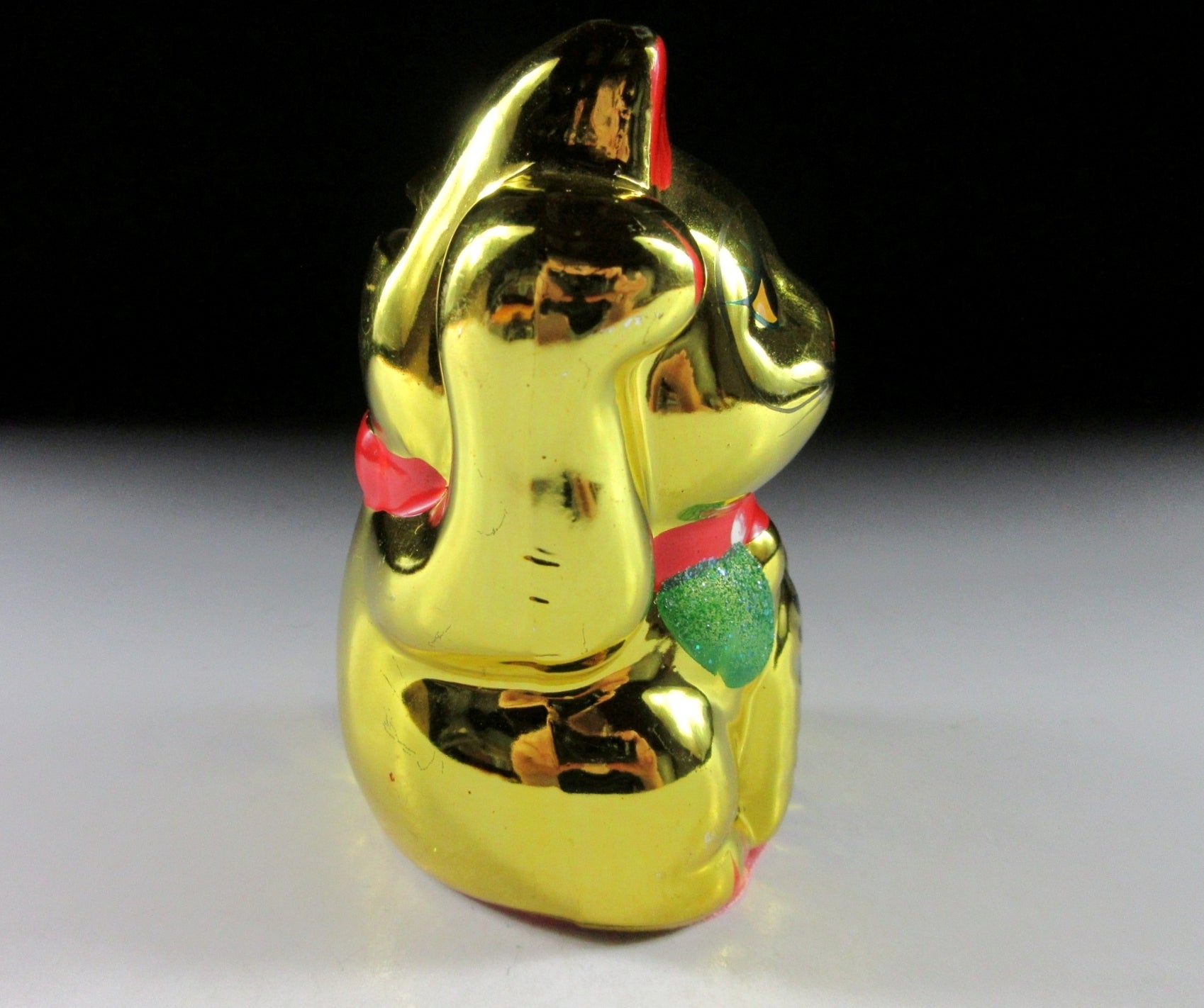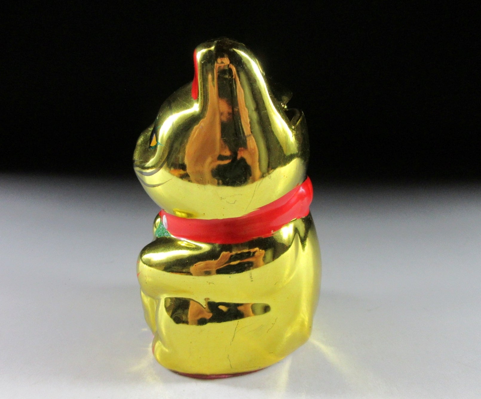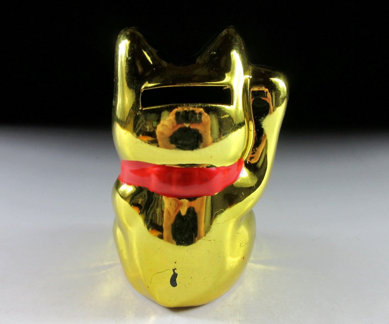 This listing is for a SMALL Showa retro maneki money box. A maneki-neko is a beckoning cat and it is believed to bring good luck to its owner, so they are a very common sight in stores and restaurants. Cats with their right paw raised are considered to be ones that bring money, and cats with their left paw raised are considered to be ones that bring customers. The maneki in this listing is gold and has a small slot in the back for coins. There’s no stopper in the bottom, but there’s a hole so loose change can be emptied by removing the felt on the bottom.