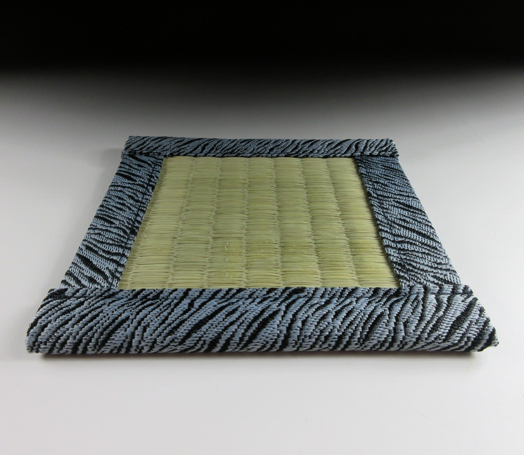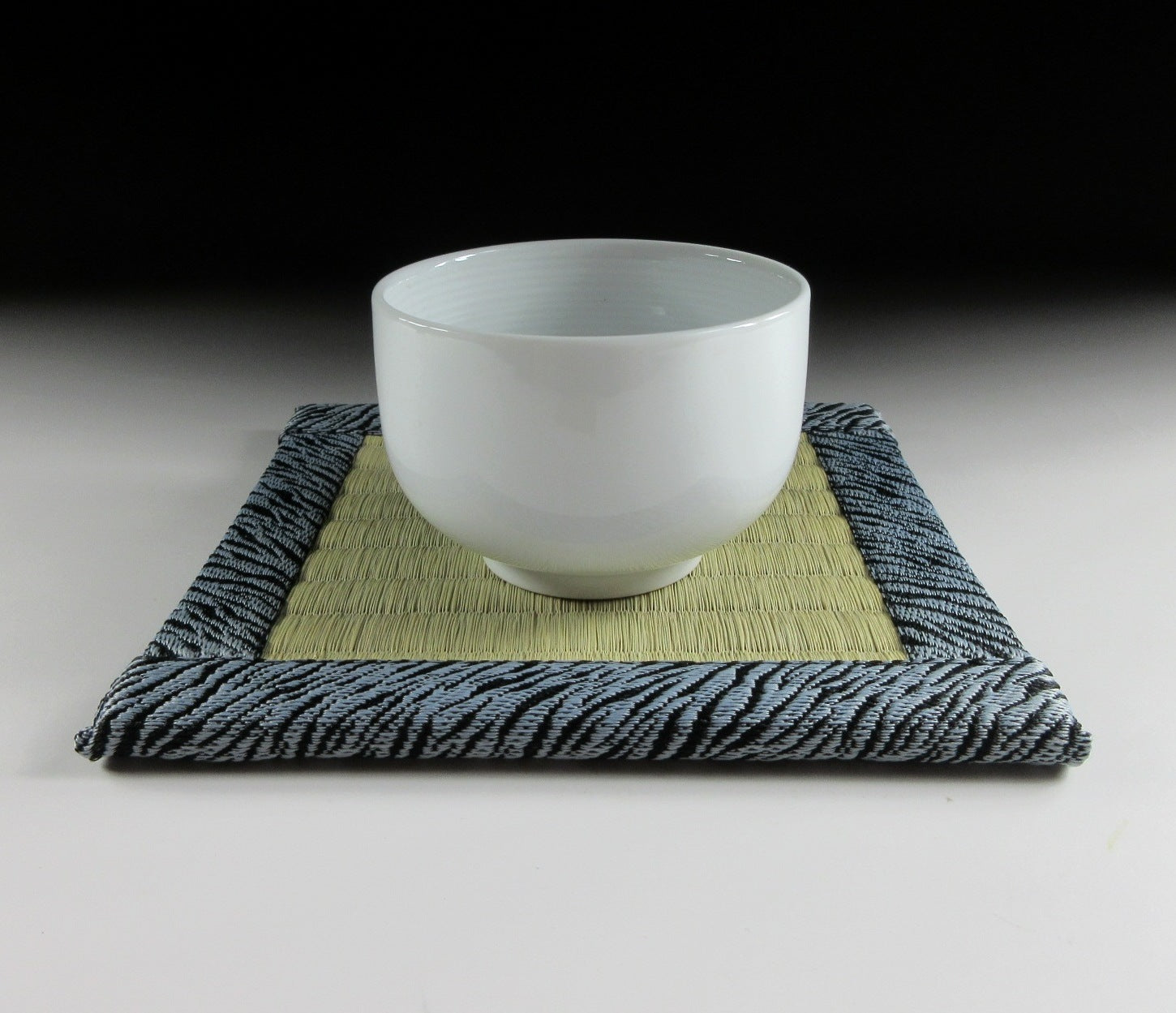 This listing is for a small-medium sized hand-woven tatami mat made of soft reed rushes. Hemp or cotton cord is used to weave rushes together to form a square mat. These little mats are ideal for displaying items such as vases, okimono, chawan, they can also be used as little placemats for tea cups etc. The mat is covered on all four sides by a traditional cotton edge called ‘eri’. The eri in this listing is black and silver/grey, and features a zebra-like pattern. Our mats are hand-made in Kanagawa Prefecture using local materials. *PLEASE NOTE THAT THE TEA CUP IS NOT INCLUDED IN THIS LISTING, THIS LISTING IS FOR THE MAT ONLY.