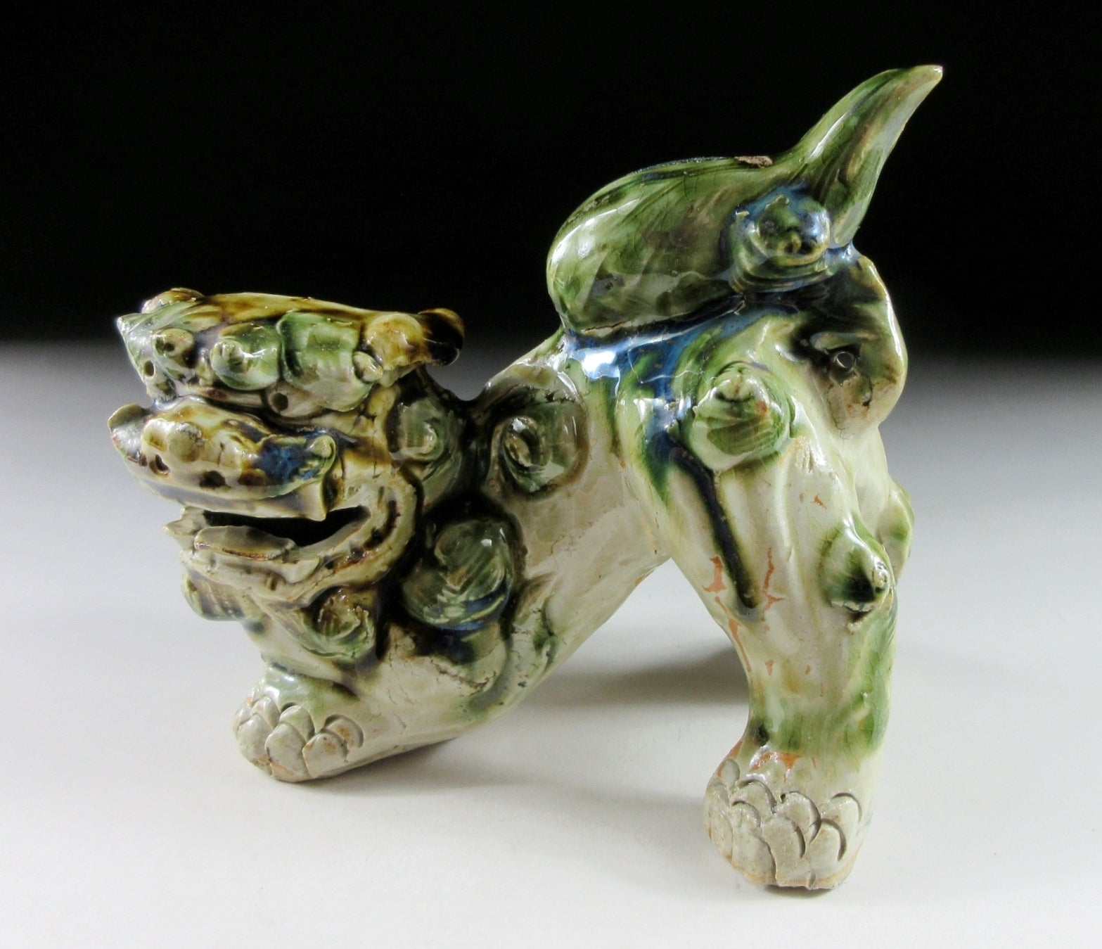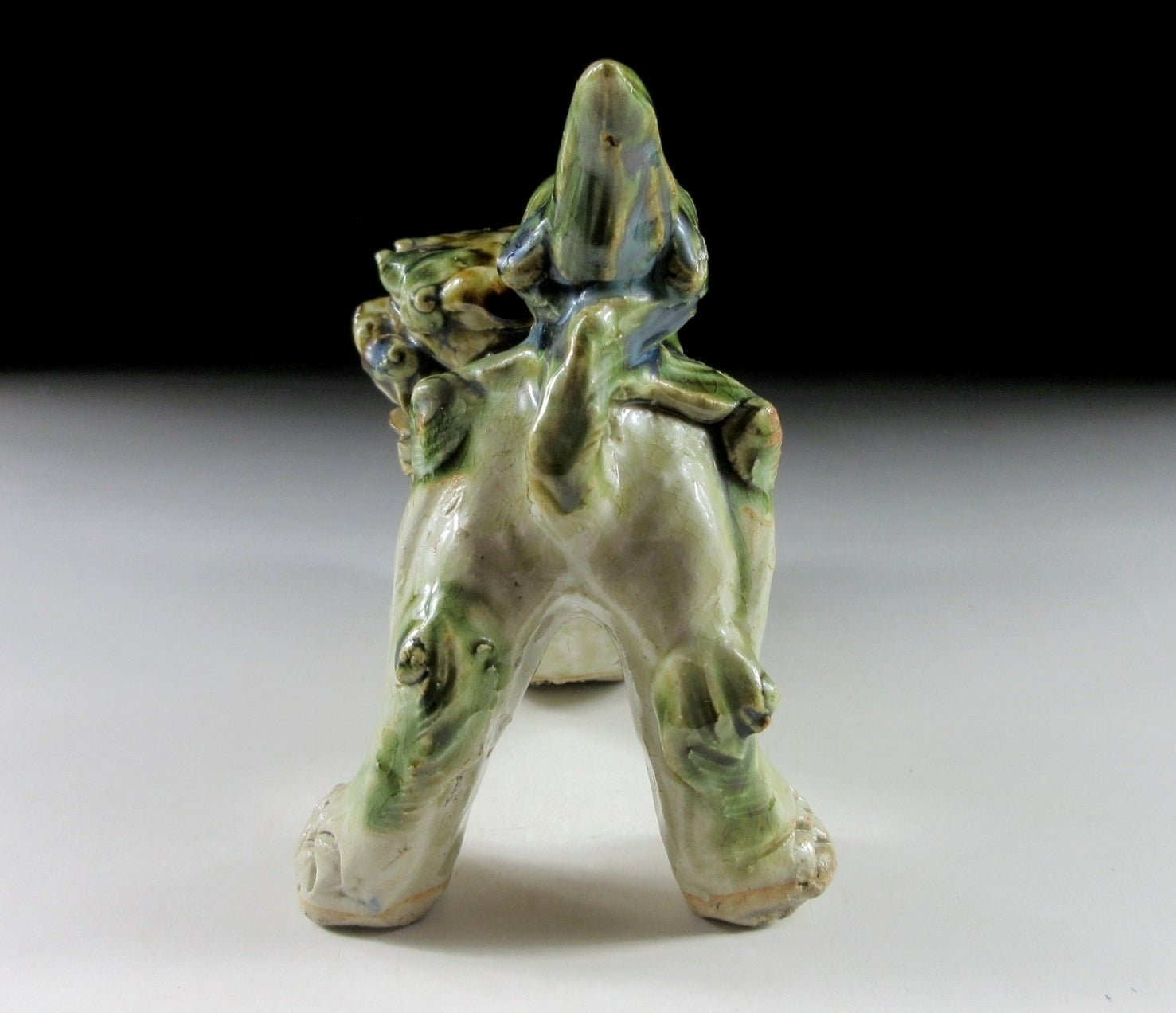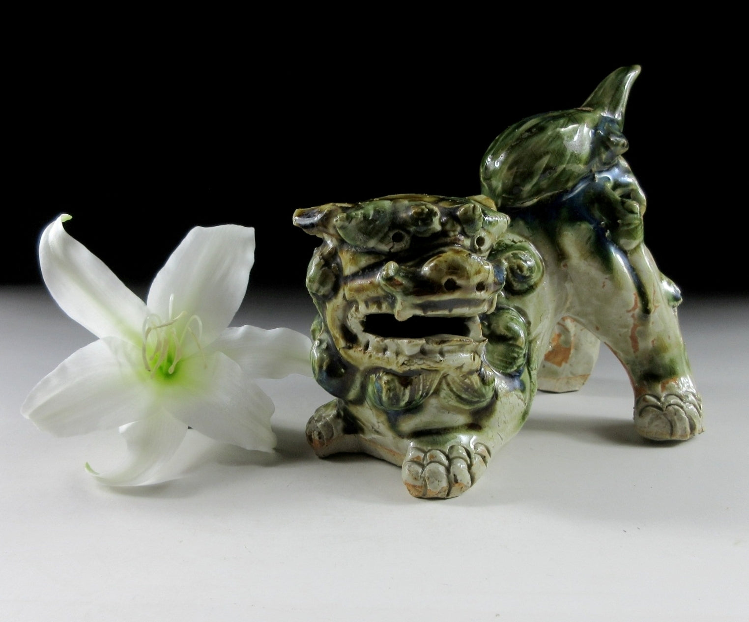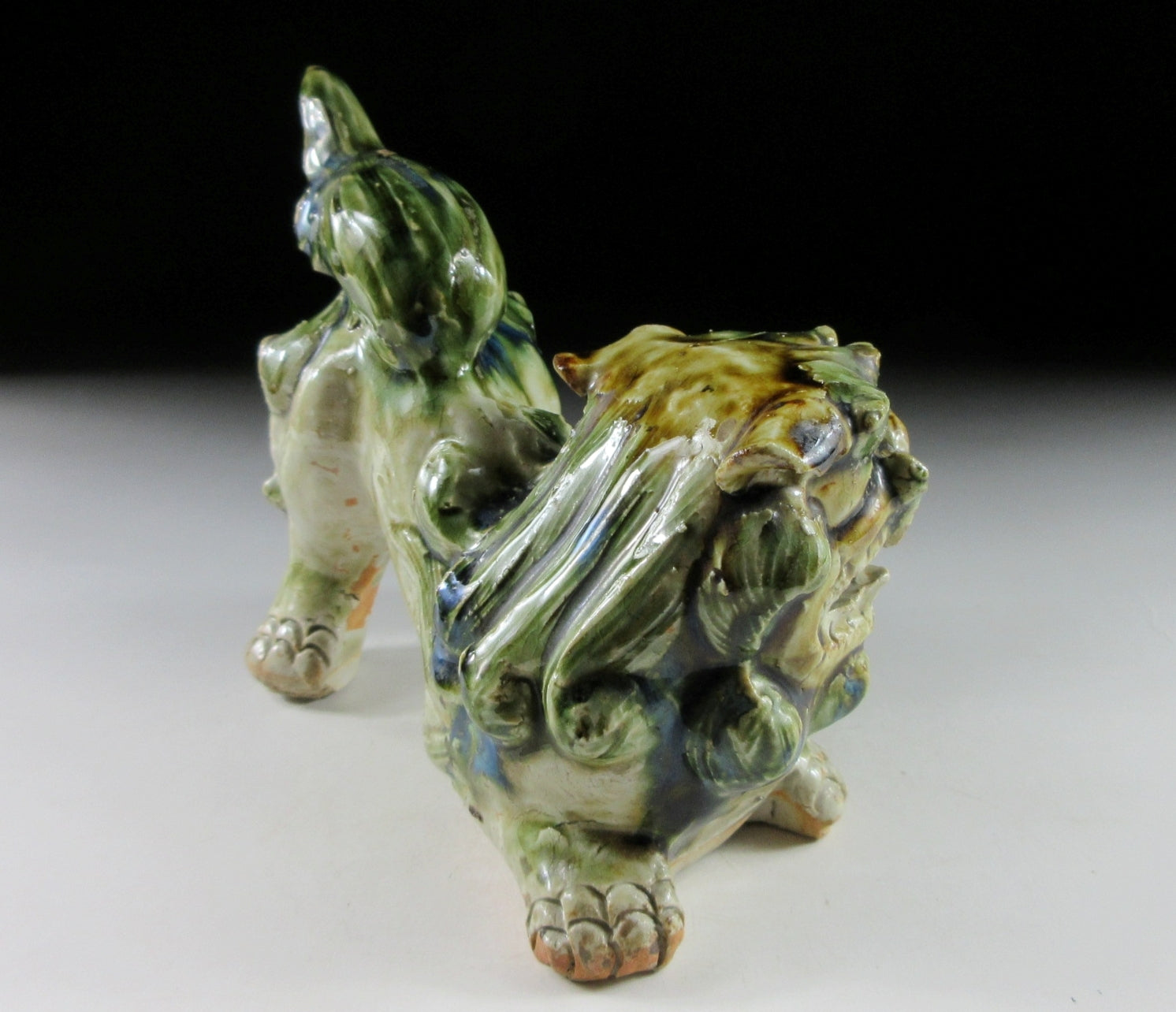 This listing is for a shisa okimono made about 30 years ago. It features a mix of mainly green and light golden-brown glaze and is an open-mouth male lion dog. This piece is ideal as a garden ornament, or for guarding your front door!