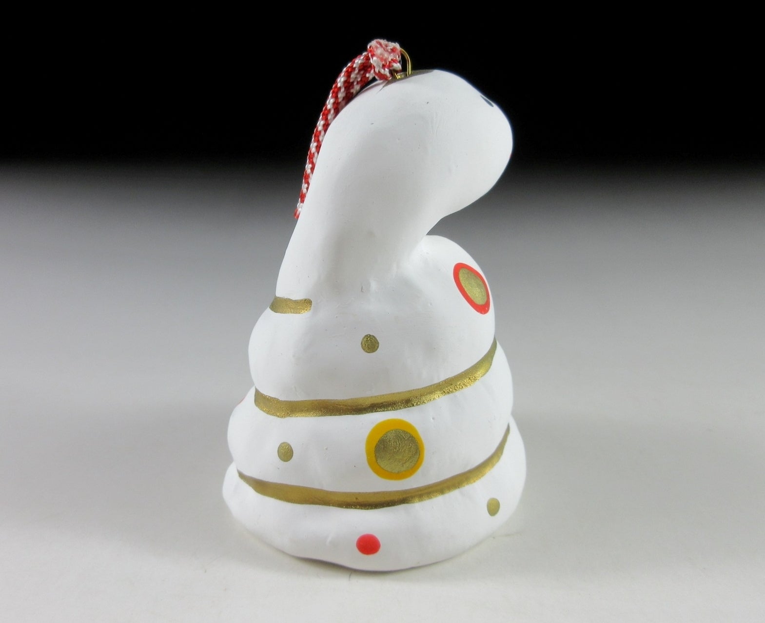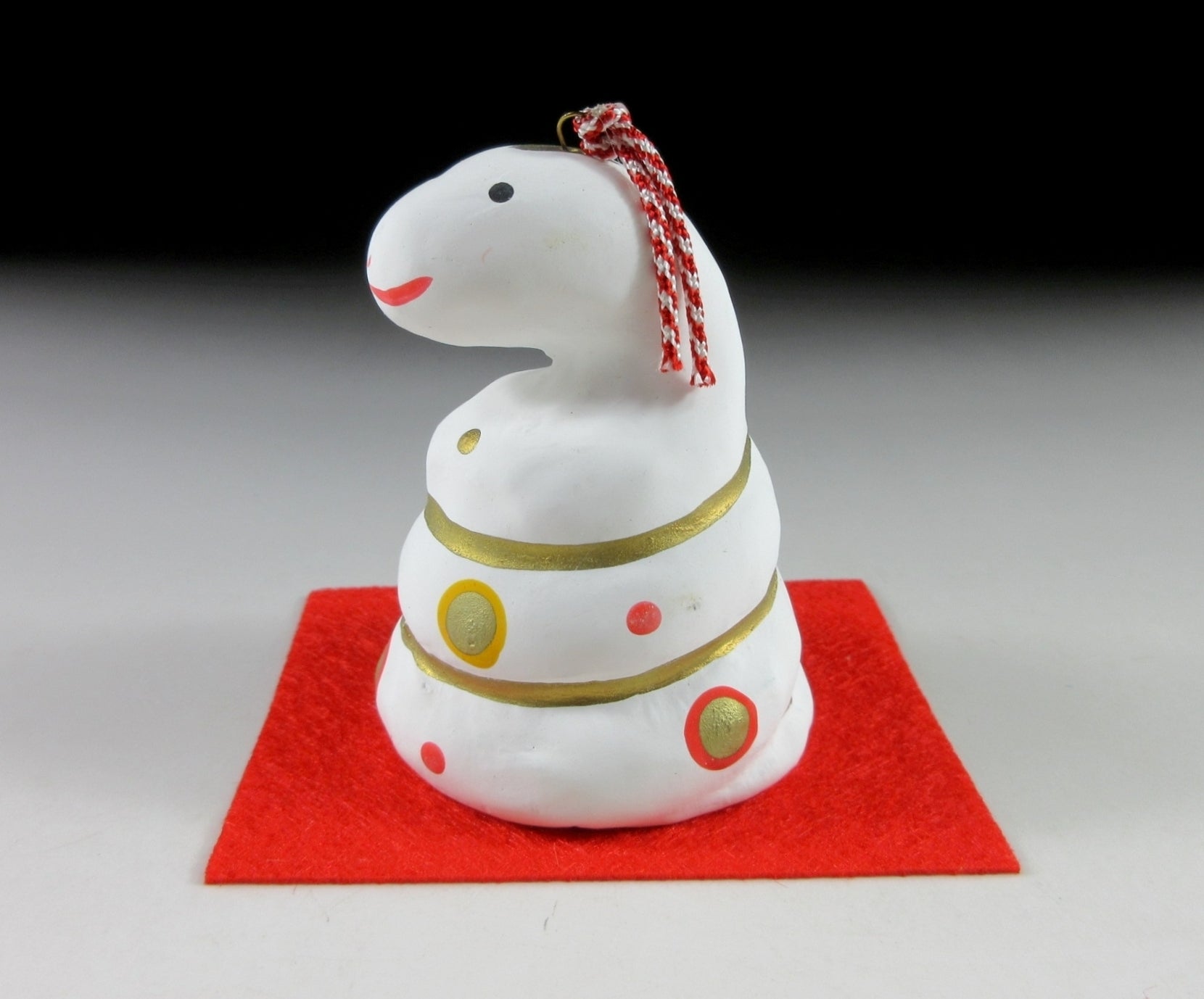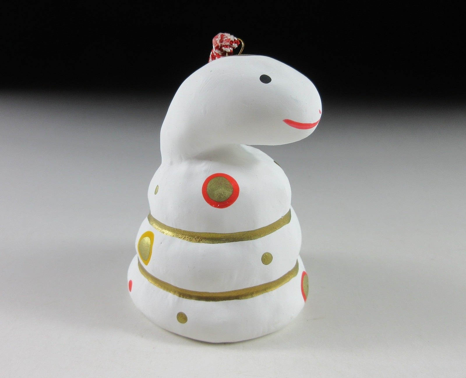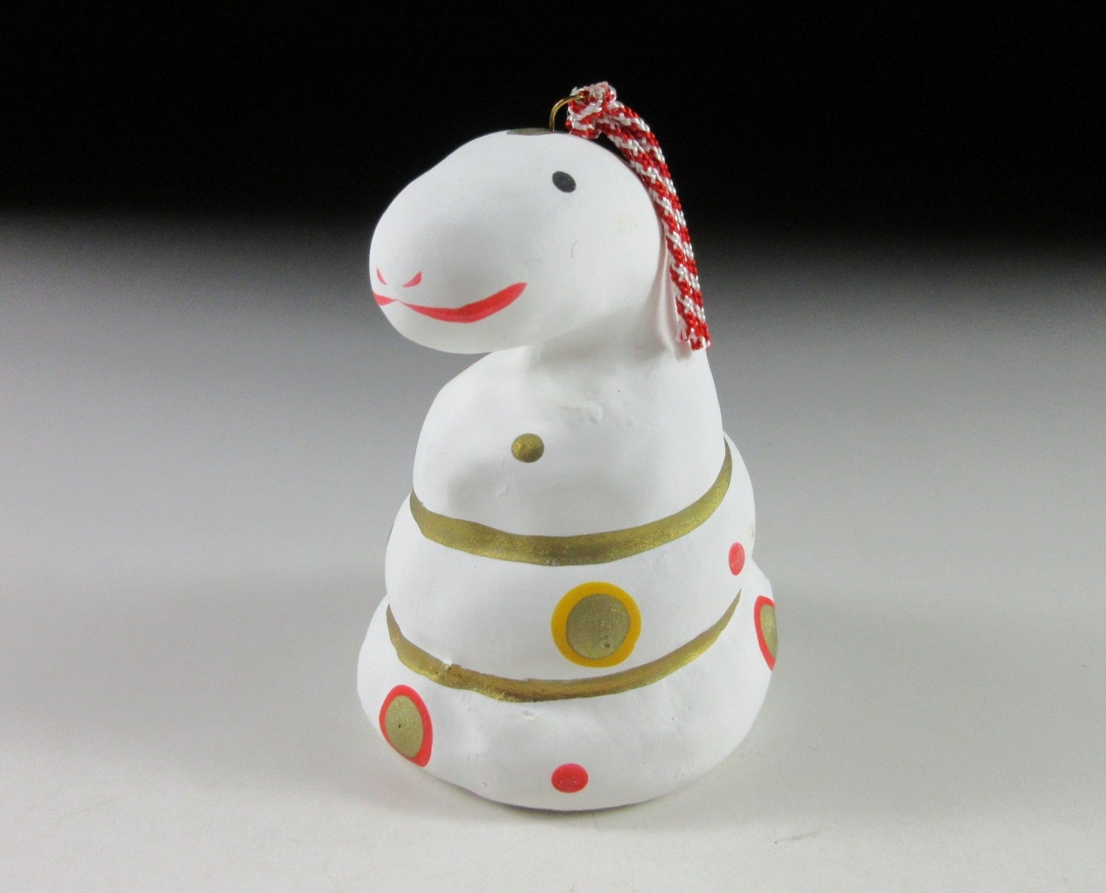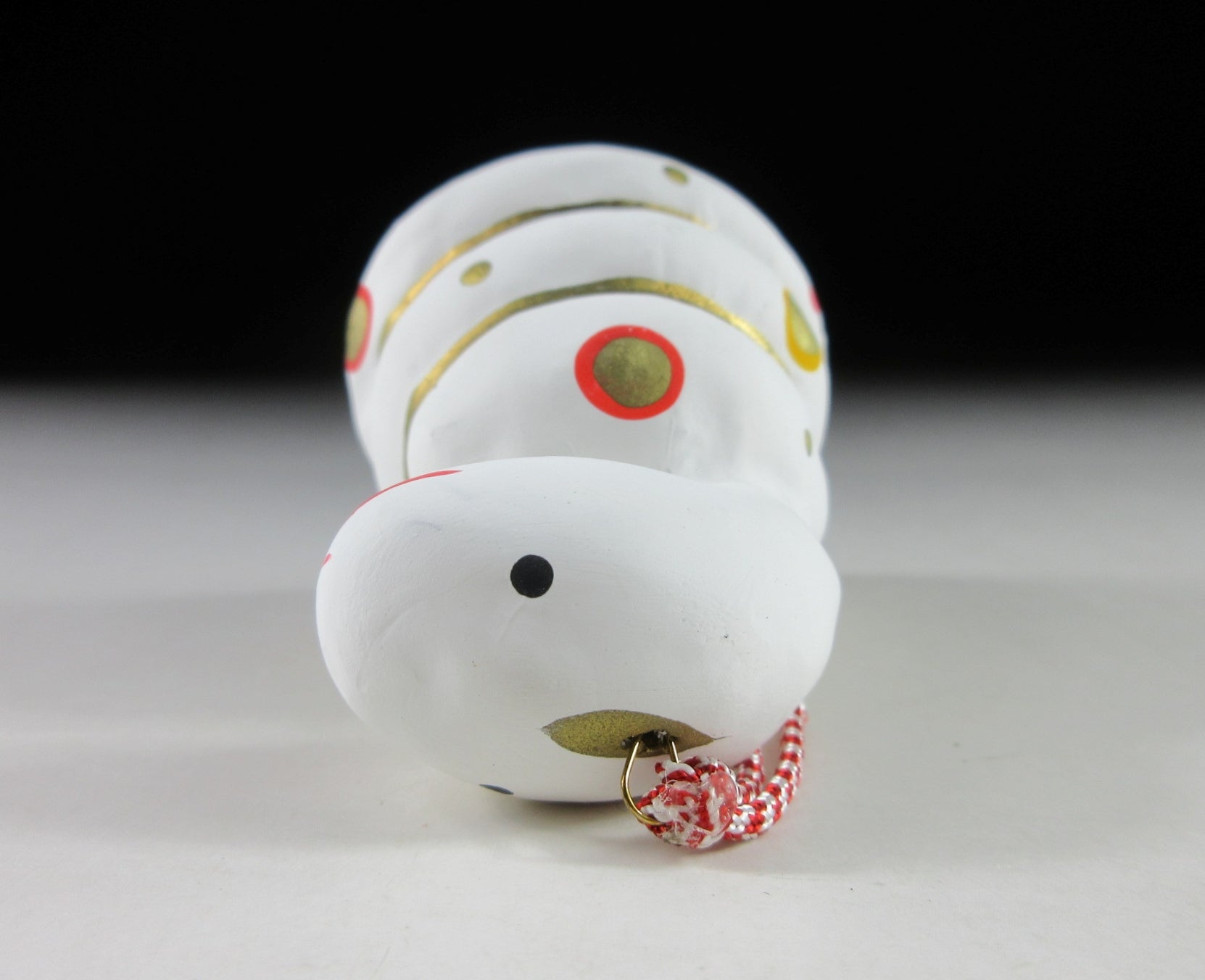 This listing is for a small papier-mâché snake with a metal bell inside. It is a lucky charm to celebrate the beginning of the New Year, 2025 being the Year of the Snake. White snakes are considered to be good luck in Japan, and are a symbol for Benten, the Japanese goddess of wealth. It comes with a small red mat, as well as two Japanese language blessings and information about the twelve zodiac animals. It also comes with a paper storage box so it can be stored until the next Year of the Snake.