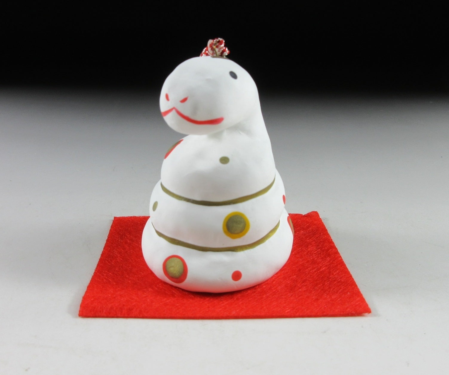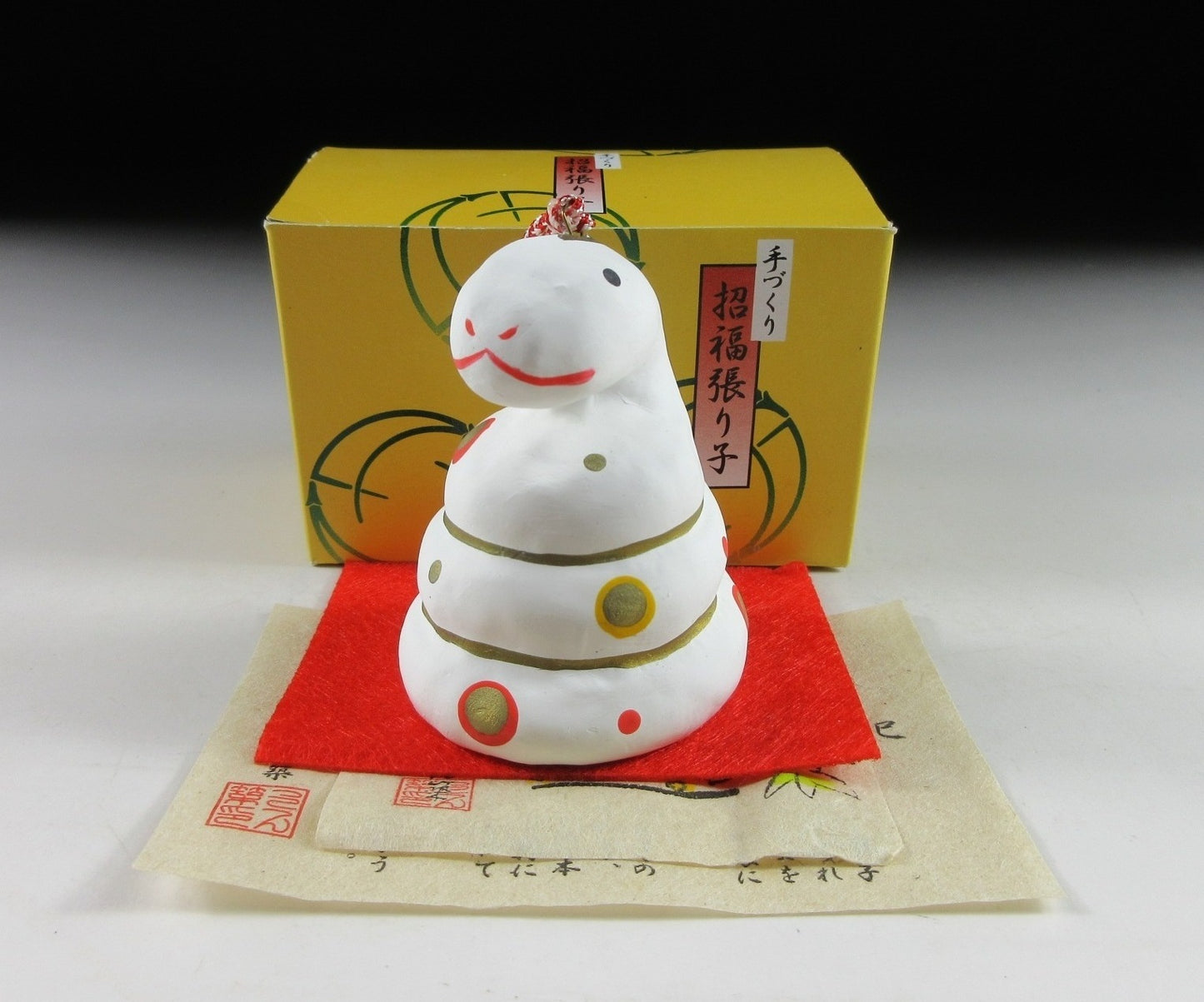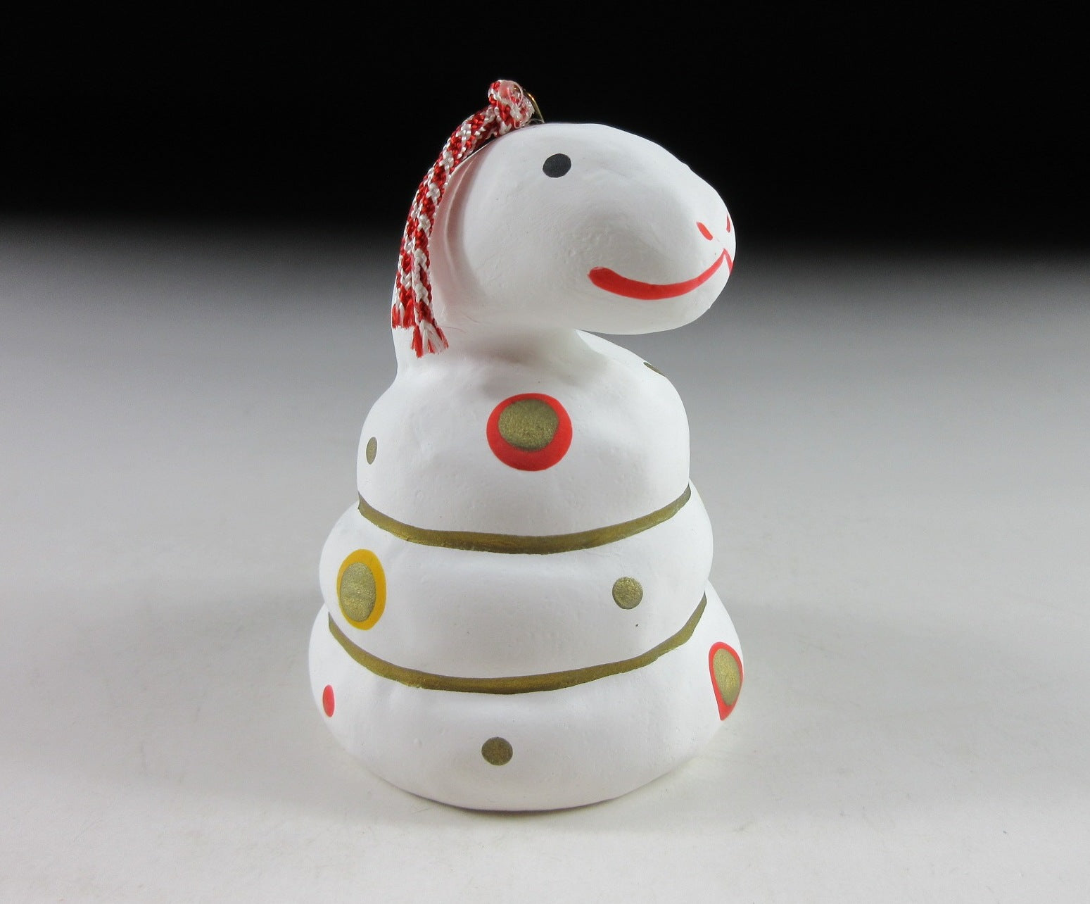 This listing is for a small papier-mâché snake with a metal bell inside. It is a lucky charm to celebrate the beginning of the New Year, 2025 being the Year of the Snake. White snakes are considered to be good luck in Japan, and are a symbol for Benten, the Japanese goddess of wealth. It comes with a small red mat, as well as two Japanese language blessings and information about the twelve zodiac animals. It also comes with a paper storage box so it can be stored until the next Year of the Snake.
