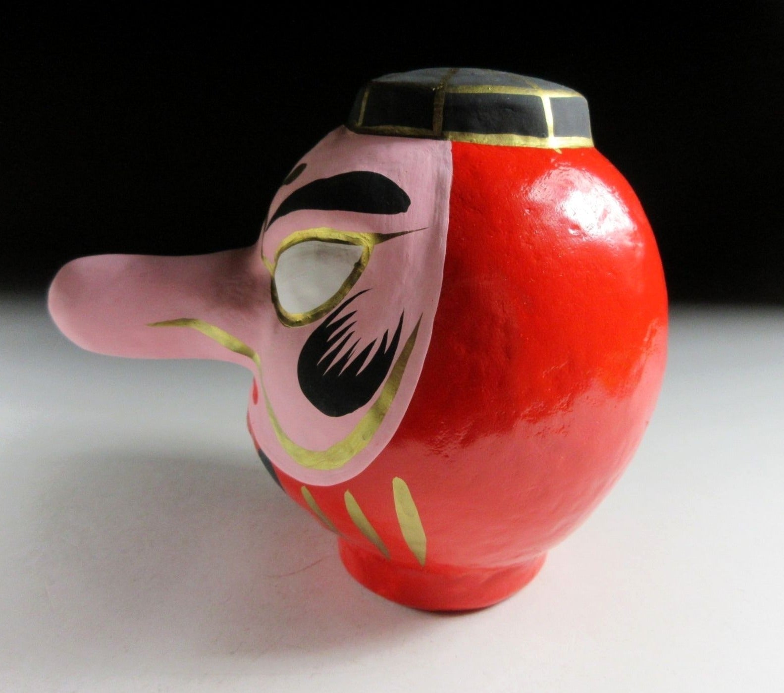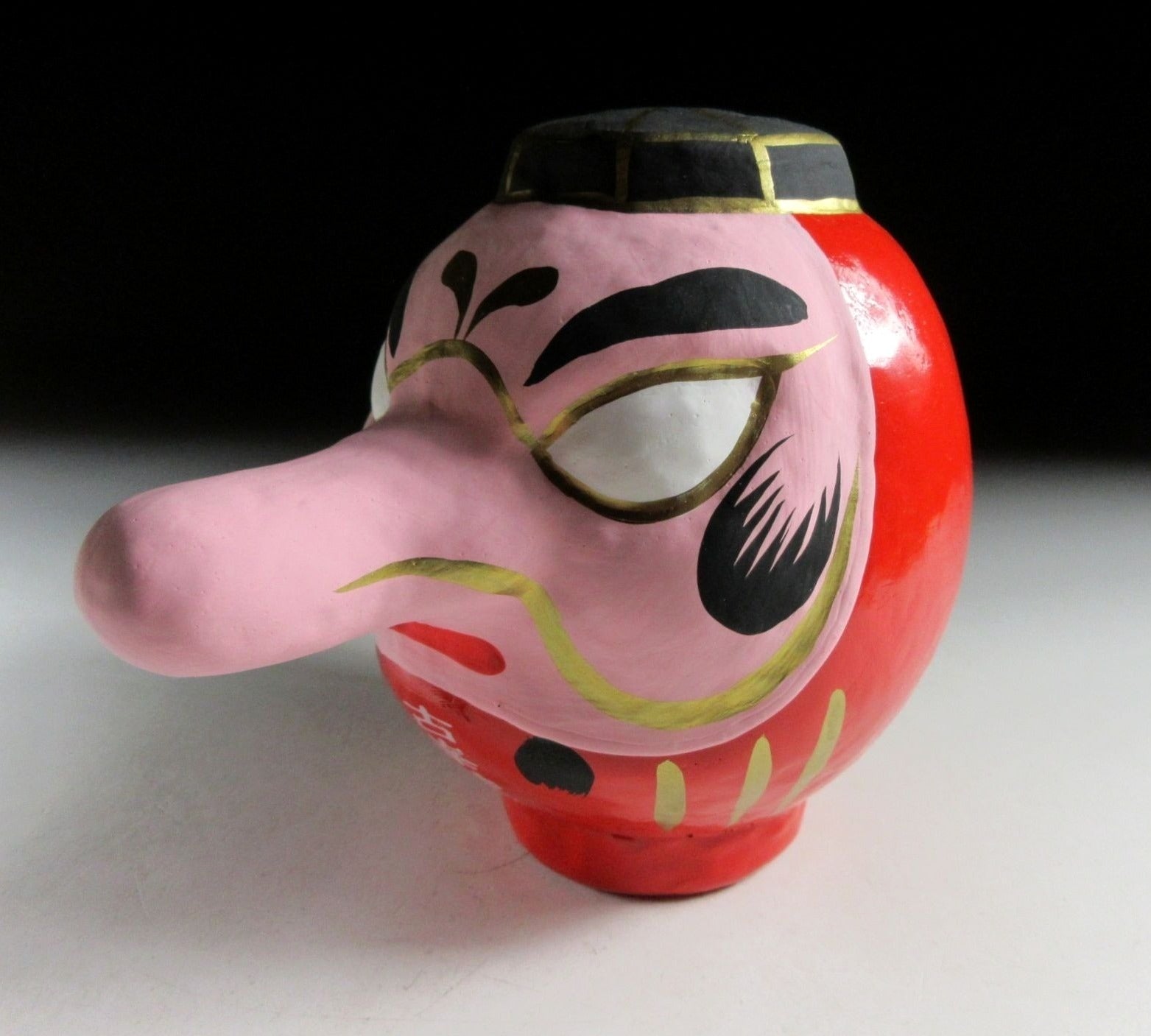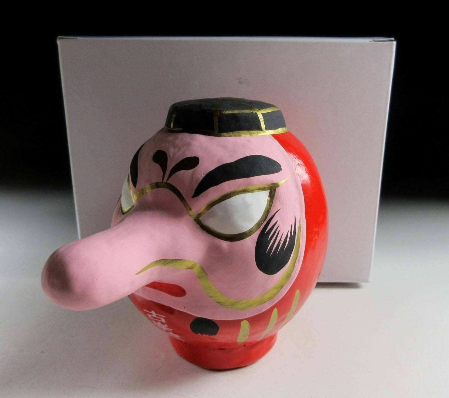 This listing is for a small papier mâché tengu Daruma. Tengu are a type of long nosed goblin believed to inhabit the mountains and forests of Japan. They have supernatural powers and are recognised in both Shinto and Buddhist teachings. The Daruma in this listing comes from Furumine Shrine in Kanuma city, Tochigi Prefecture. Furumine Shrine is a tengu dedicated shrine that houses over 200 tengu masks in the main hall. Temples usually sell Daruma as good luck charms, and Furumine shrine has combined tengu with Daruma to make its own original good luck charm. This particular item is unused and comes with a paper storage box.
