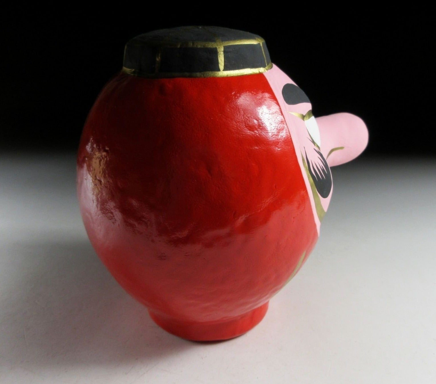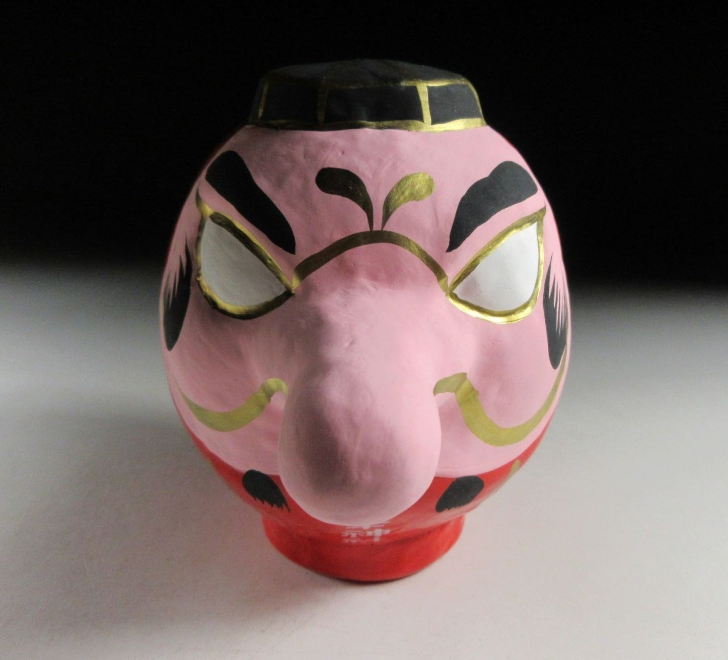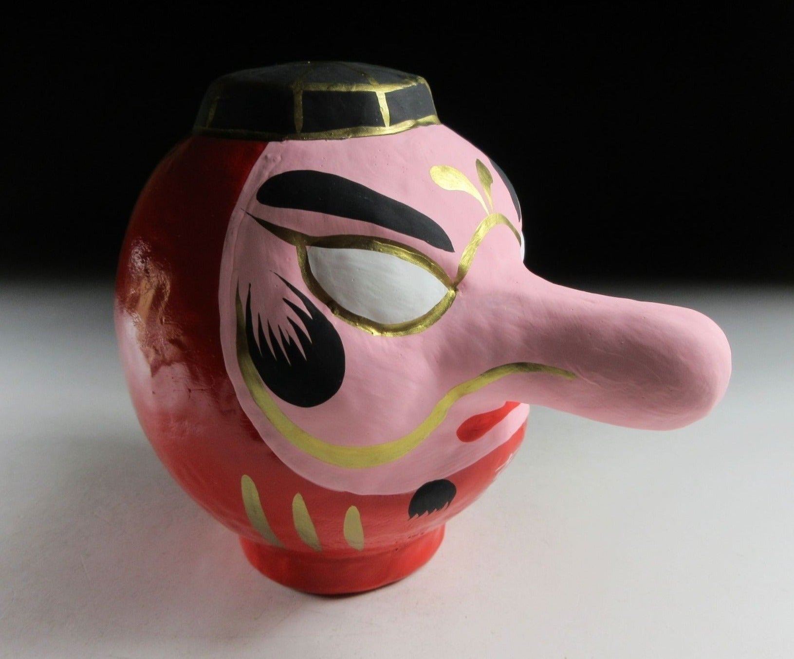 This listing is for a small papier mâché tengu Daruma. Tengu are a type of long nosed goblin believed to inhabit the mountains and forests of Japan. They have supernatural powers and are recognised in both Shinto and Buddhist teachings. The Daruma in this listing comes from Furumine Shrine in Kanuma city, Tochigi Prefecture. Furumine Shrine is a tengu dedicated shrine that houses over 200 tengu masks in the main hall. Temples usually sell Daruma as good luck charms, and Furumine shrine has combined tengu with Daruma to make its own original good luck charm. This particular item is unused and comes with a paper storage box.
