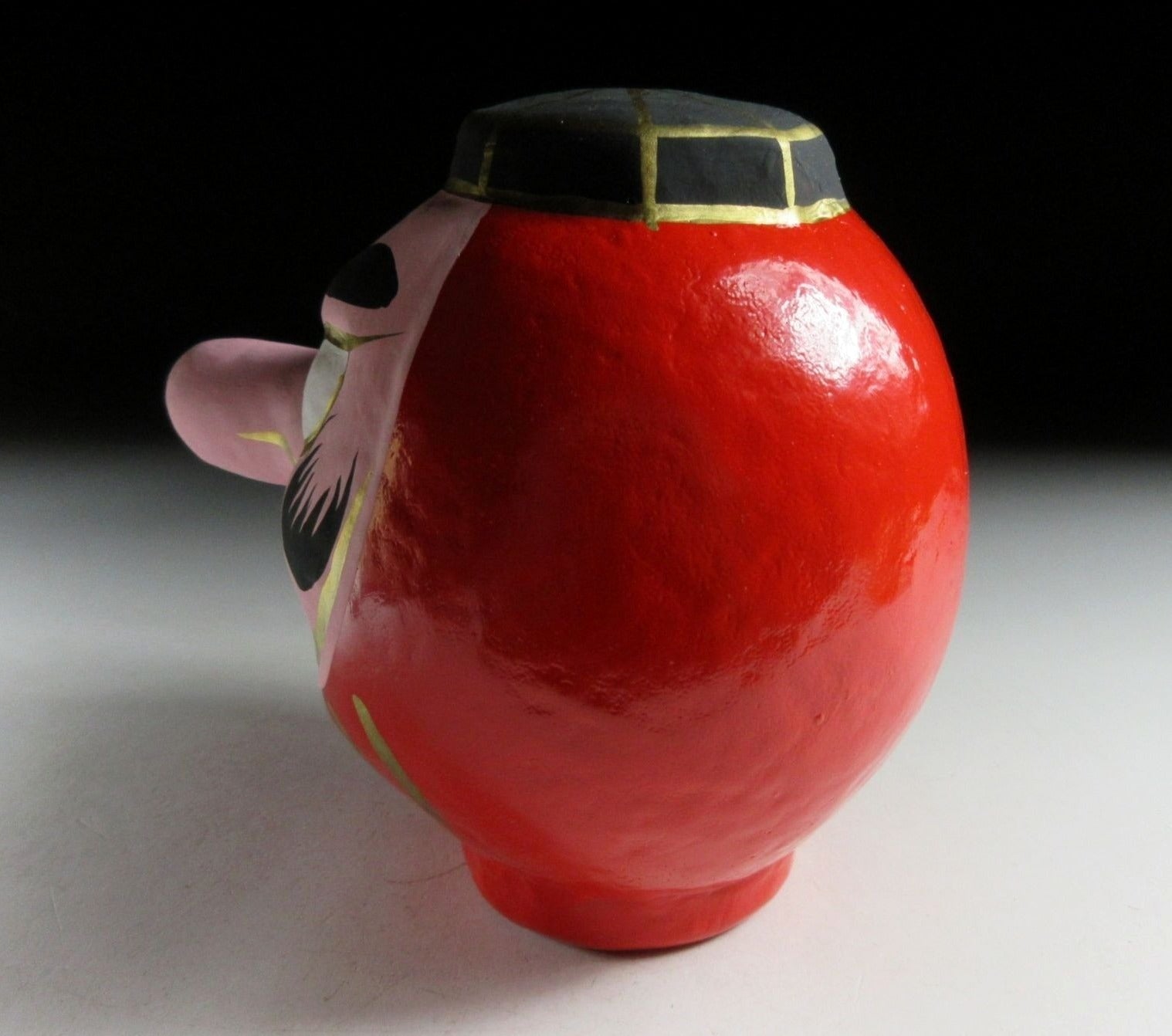 Daruma: H.12.2cm (4.8”) x 13.5cm (5.3”) from the back to the end of the nose x 9.7cm (3.8”) across