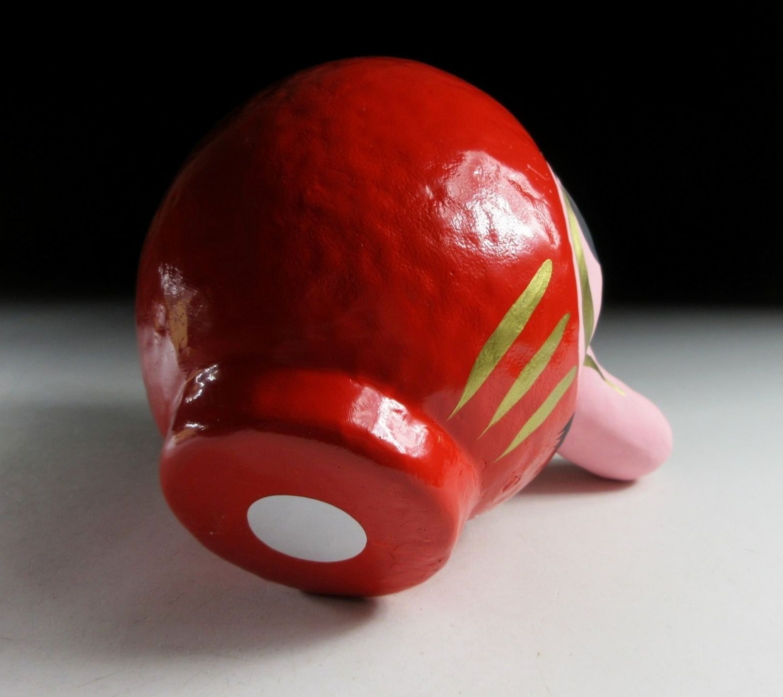 Daruma is a popular talisman of good luck, especially during New Year. When a Daruma is purchased, the owner paints a single eye black while making a wish. Once the wish is realized the other eye is added, and then the Daruma is taken to the local temple to be burned during a special ceremony.