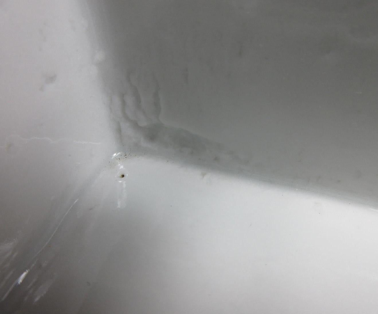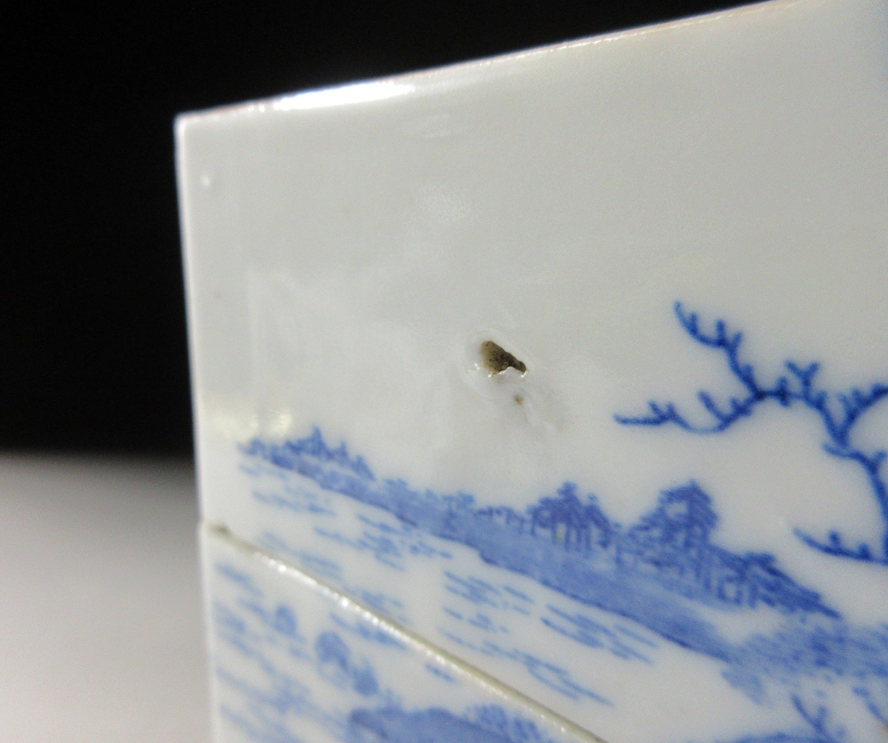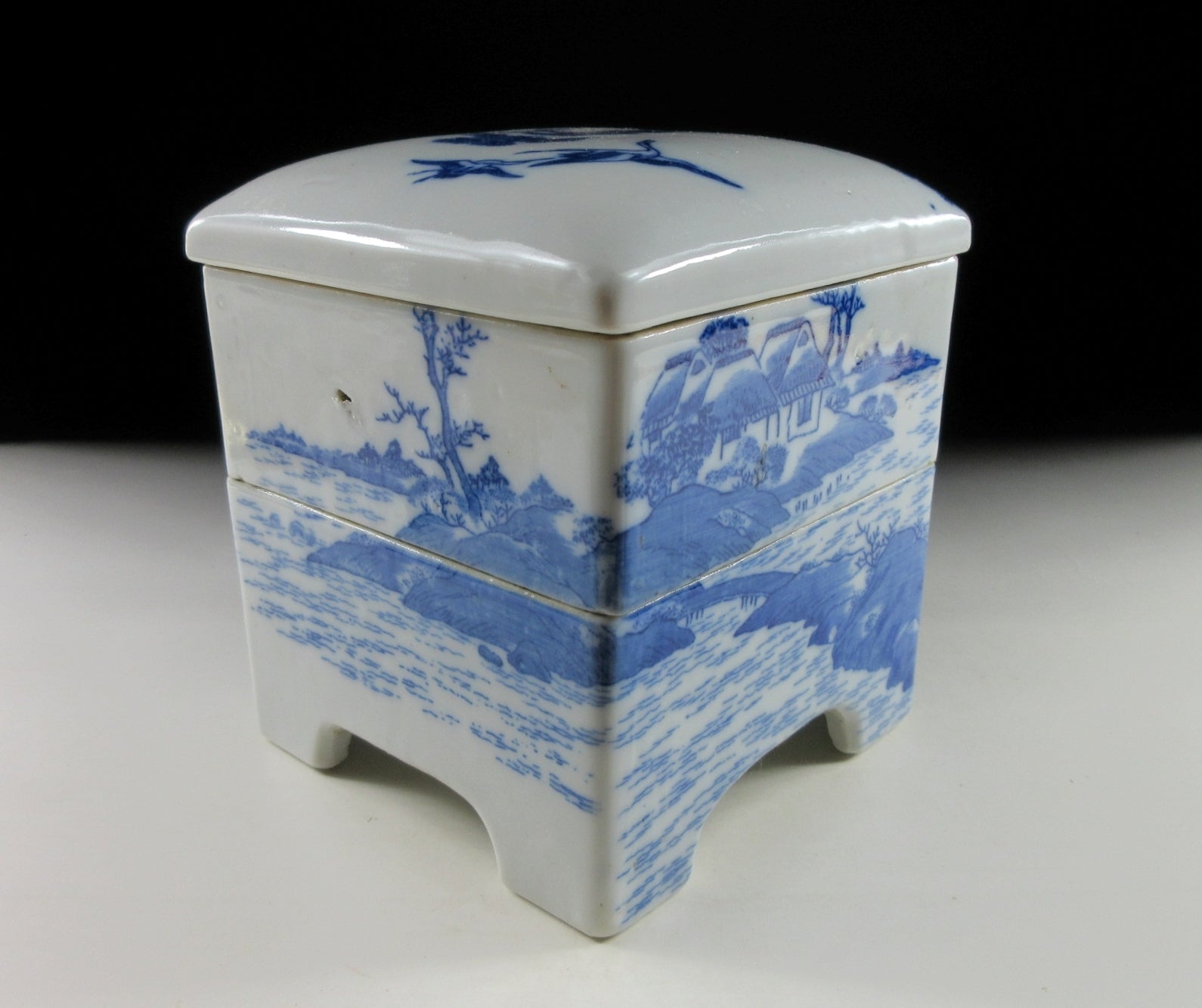 It has surface imperfections, moulding imperfections, the top tier has rough glaze along rim on one corner, and the lid is chipped along one edge.