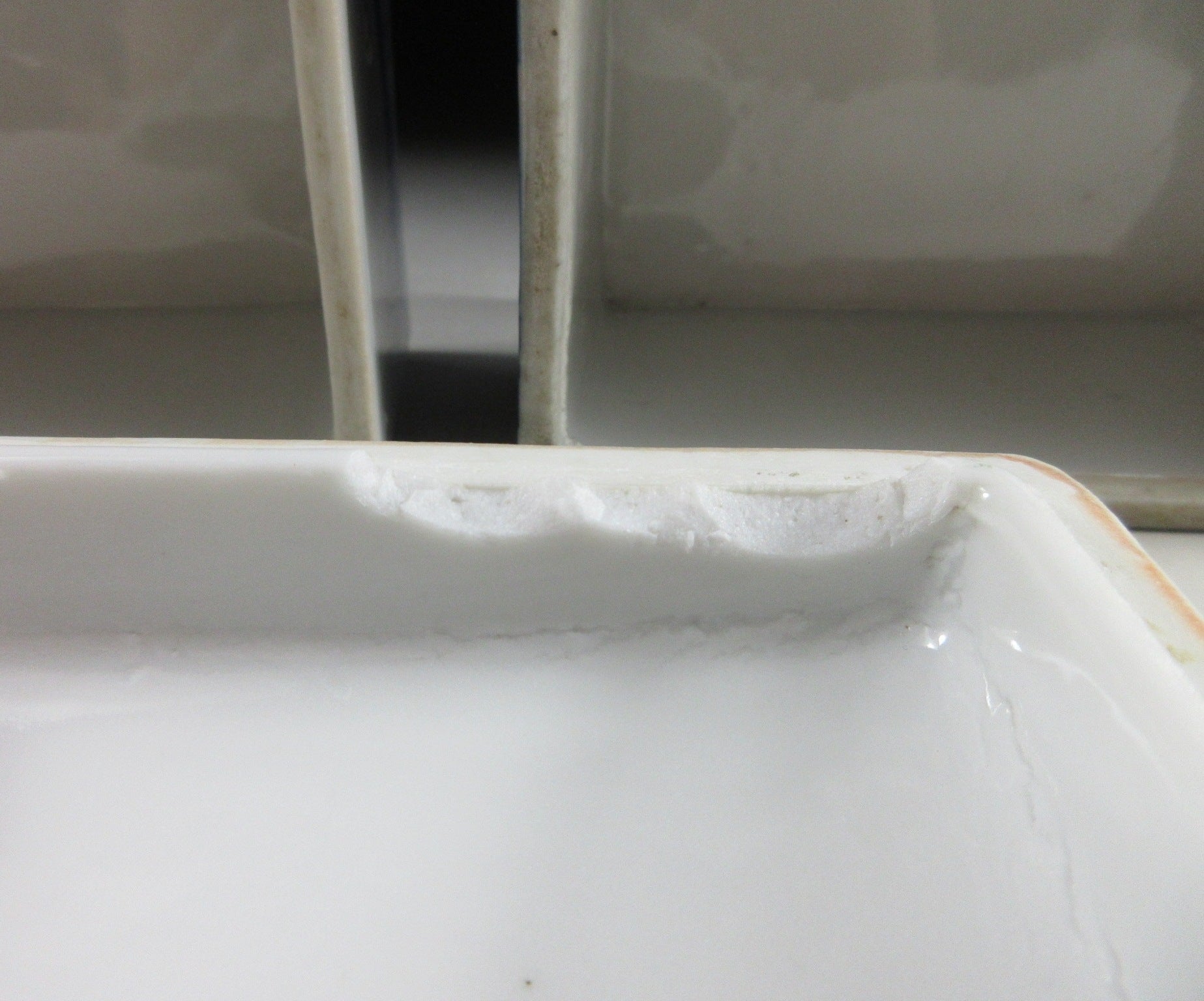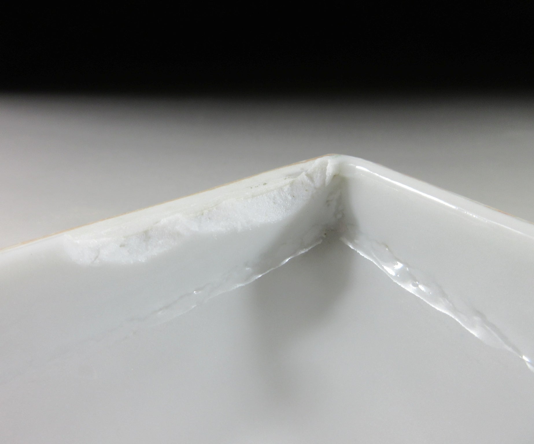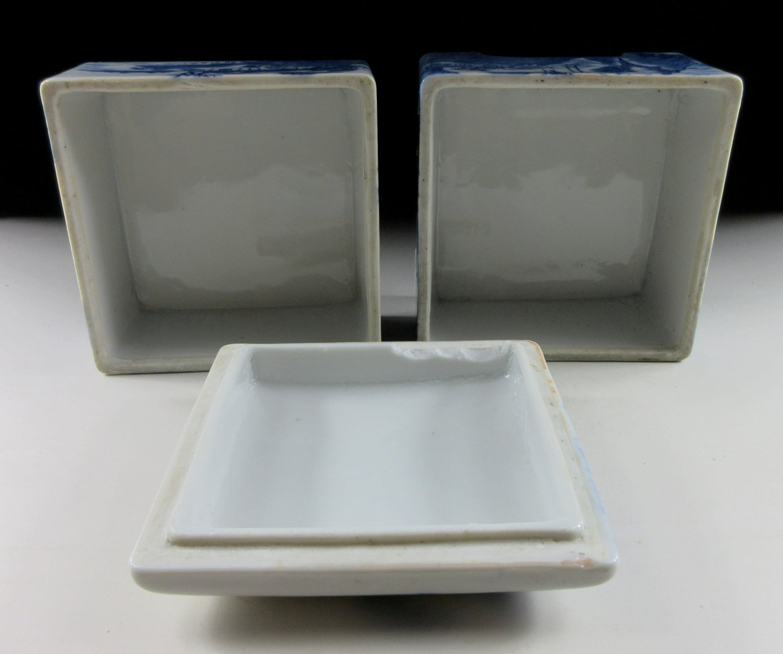 It has surface imperfections, moulding imperfections, the top tier has rough glaze along rim on one corner, and the lid is chipped along one edge.