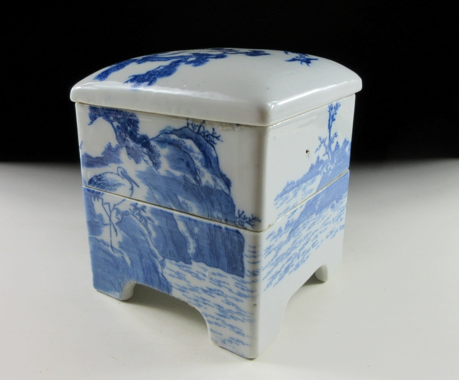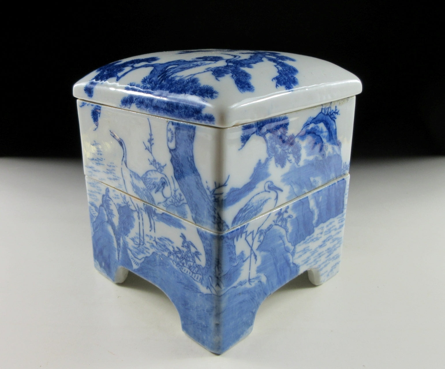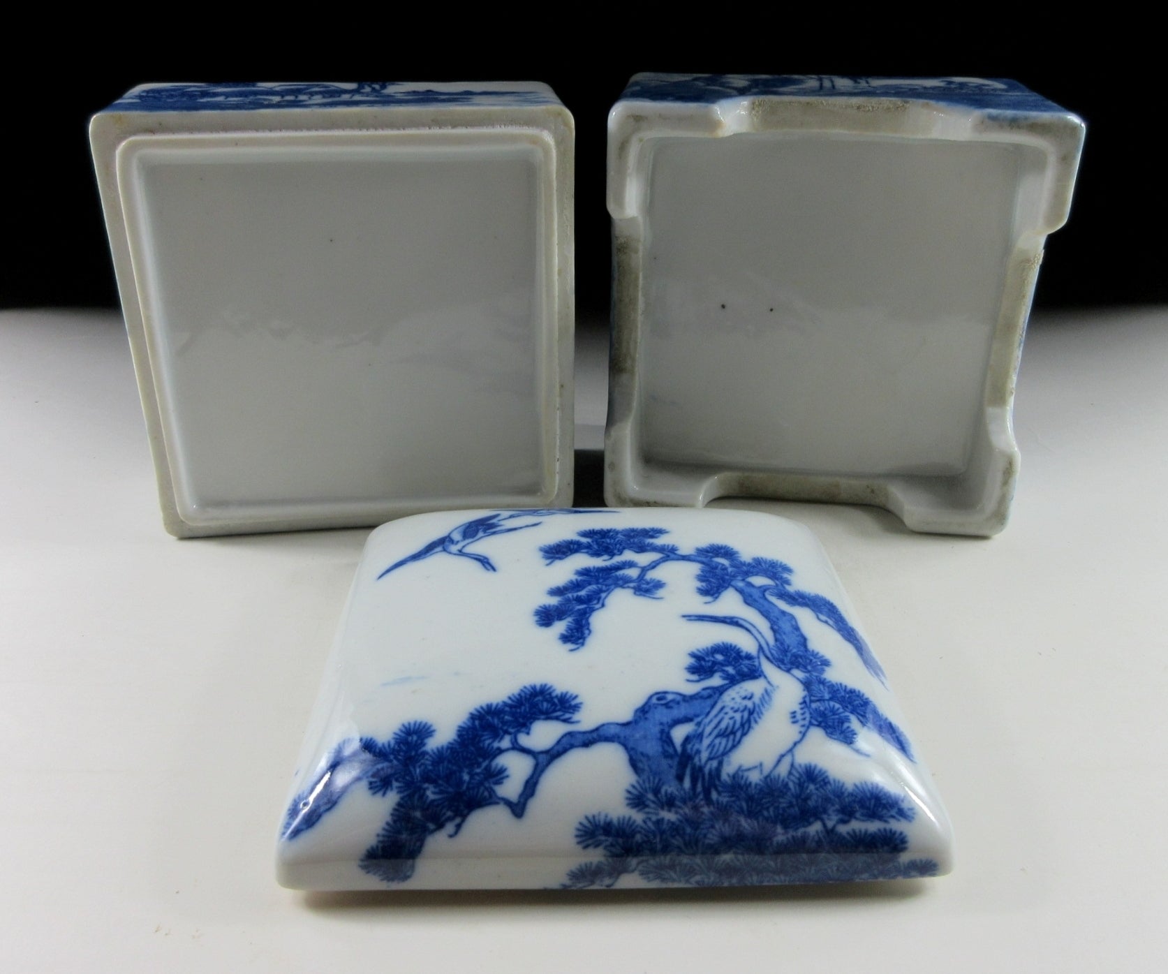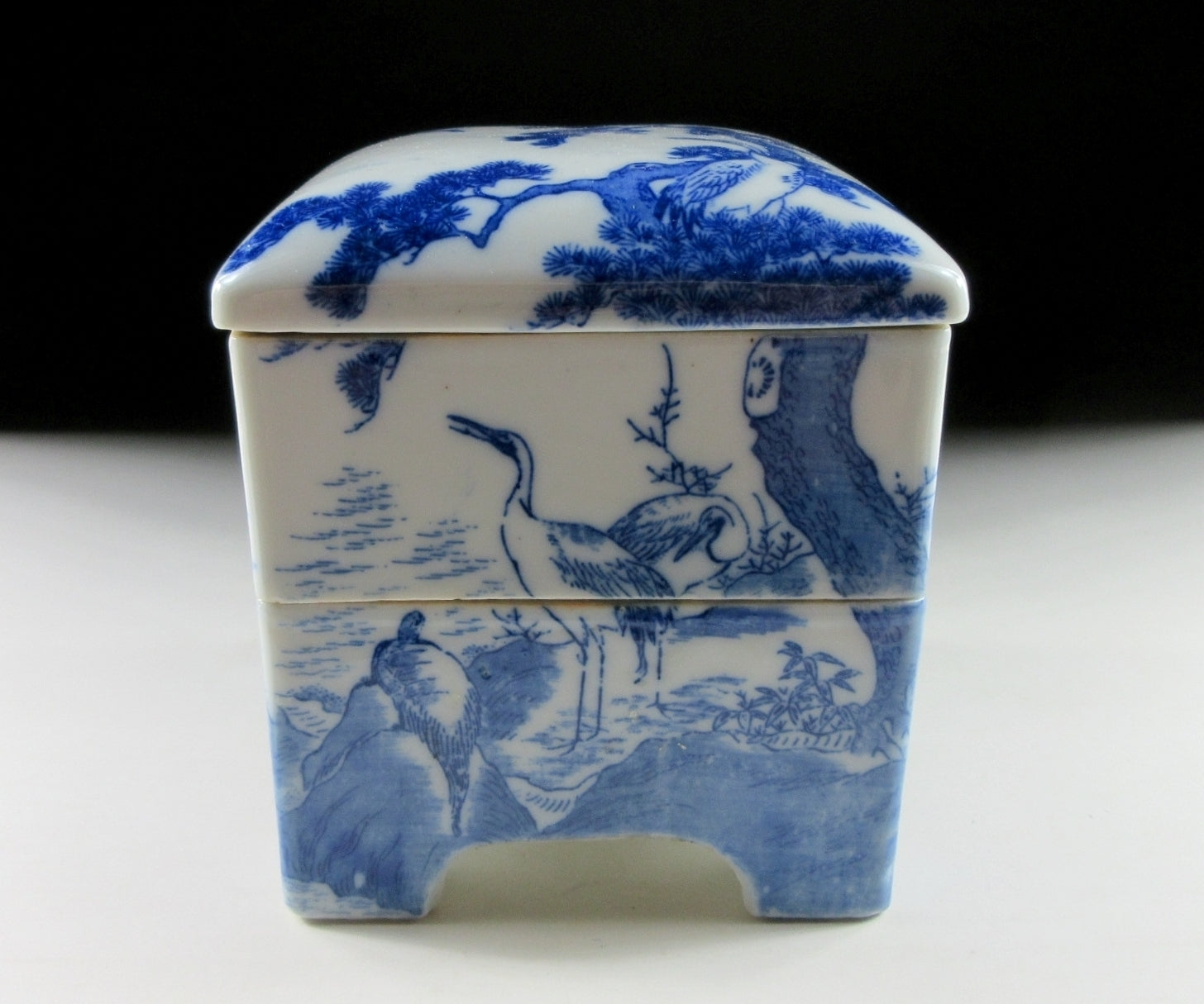 This listing is for a small Seto-ware porcelain danju made around 80-90 years ago. It is decorated with a matsu pine and crane pattern using a stencil or transfer. Japanese stencilled porcelain, often referred to as katagami or fukizumi, became popular during the Edo and Meiji periods, particularly for mass-produced export wares. Katagami utilises a positive stencil, allowing pigment to pass through cut-outs, while fukizumi is a negative method where pigment is applied around a stencil, creating a speckled effect. The danju in this listing has two tiers and they’re equal in depth.