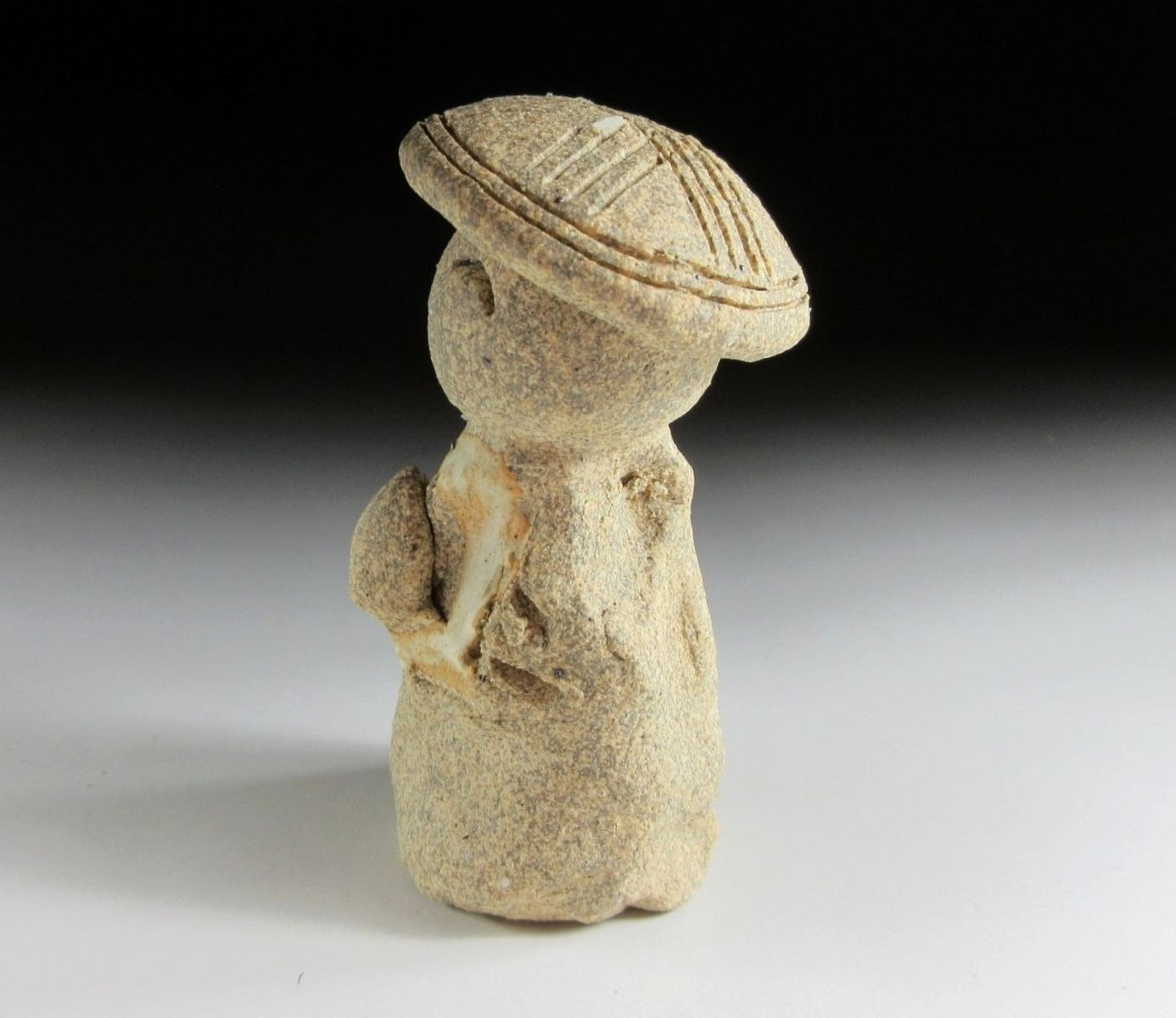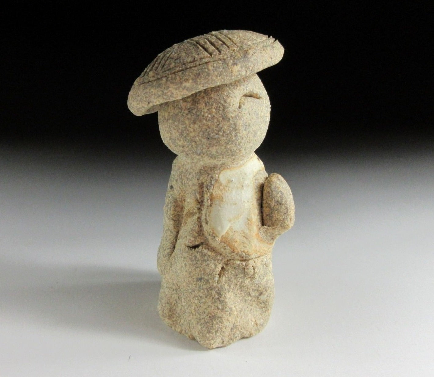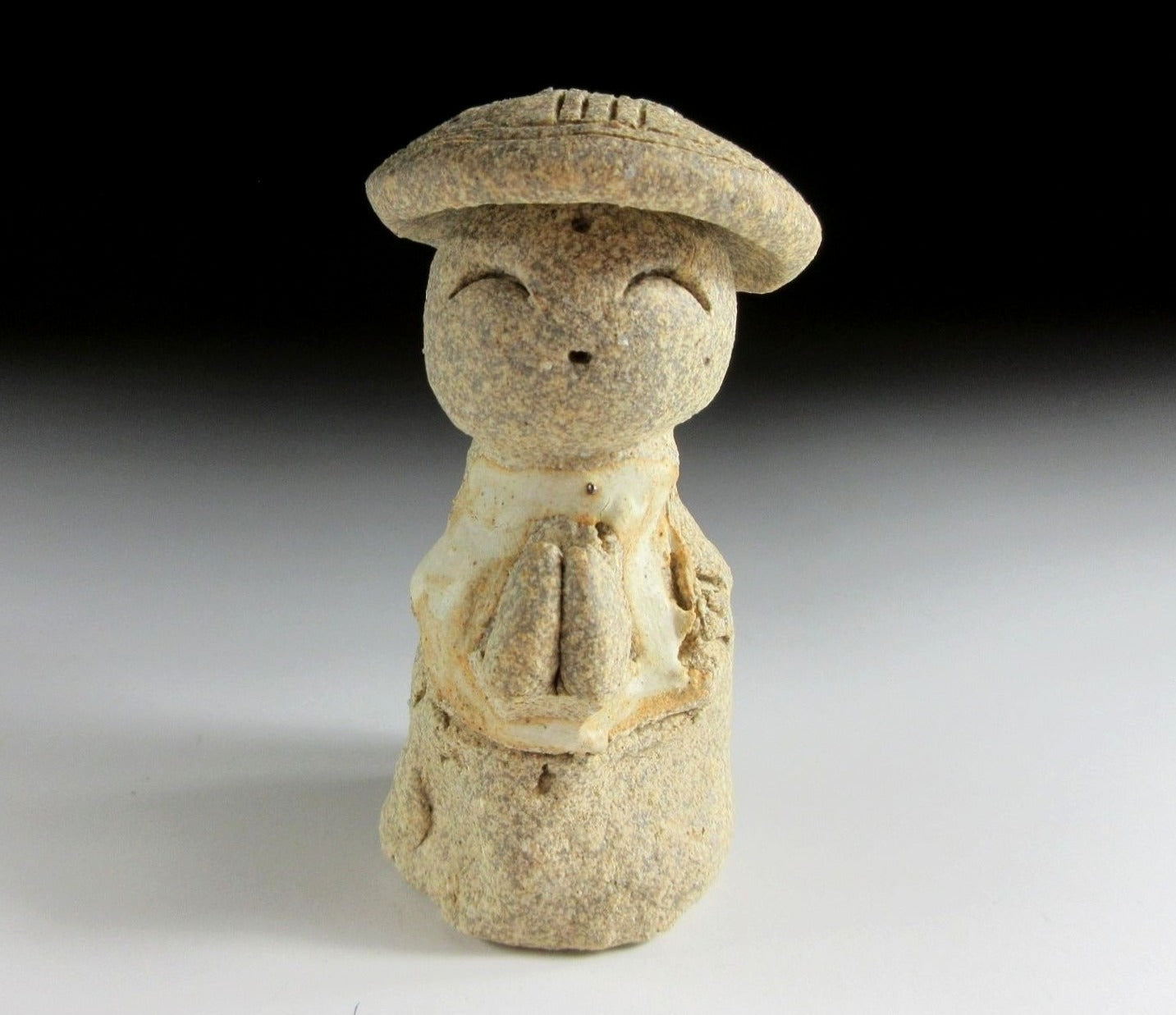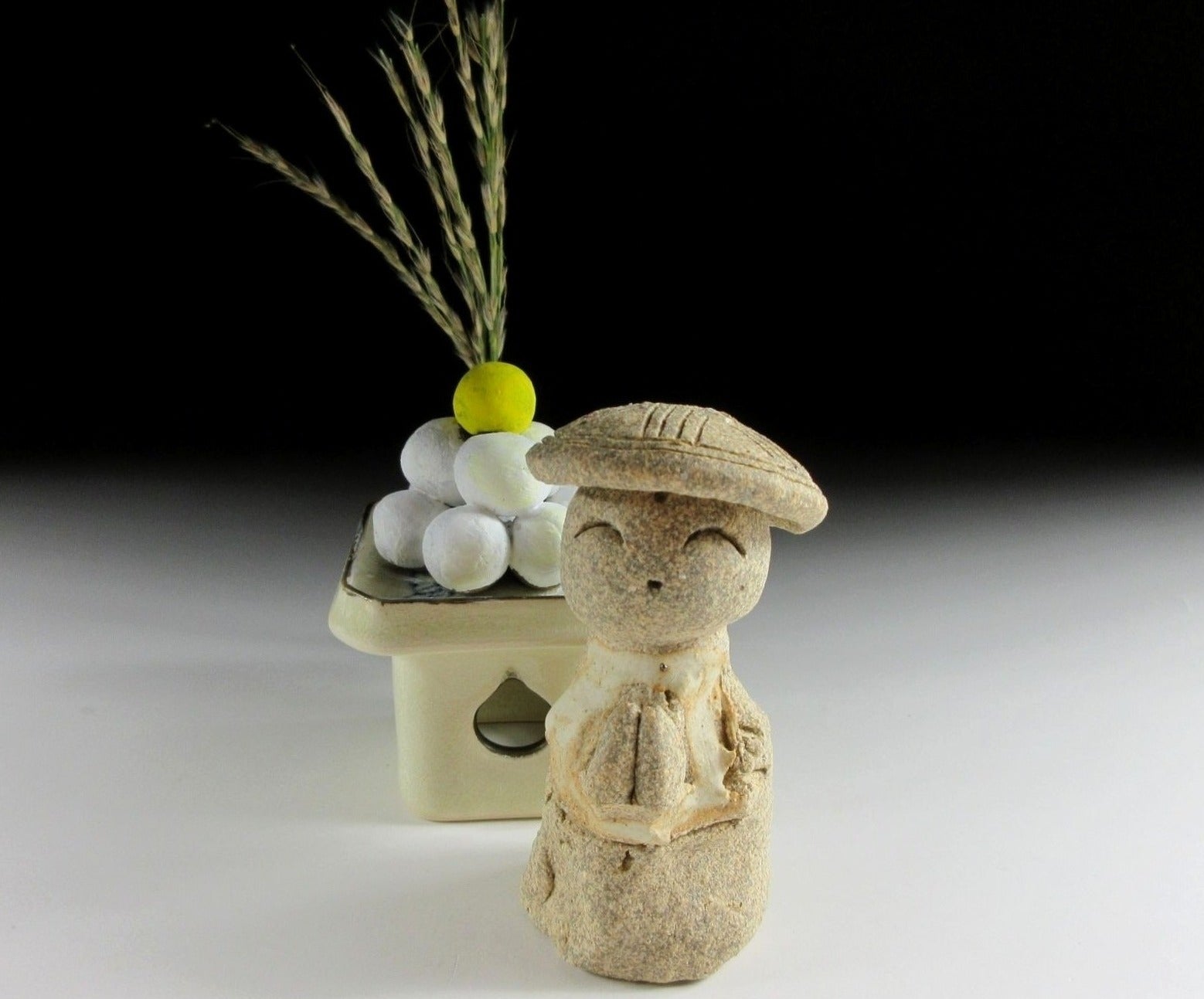 This listing is for a small Shigaraki jizo. It has been hand-shaped and is modelled on the children’s story named Kasajizo. Kasajizo is a story about a poor old hat maker and his wife. It was just before New Year and the old couple were running very low on food. A baby mouse appeared looking for food scraps, so the old man gave the little mouse some of the last rice they had left. To thank the old man the parents of the mouse went out into the snow and gathered some straw so he could make hats. The old couple were so happy for their help, and they all sat down and got to work on making some hats to sell for food. When the hats were finished, the old man set off for town so he could make some money and buy some food for New Year. On the way into town he noticed that the heads of the jizo statues were covered in snow. He felt sorry for them and used his towel to wipe off the snow. After this he continued on into town. The town was busy but nobody wanted to buy a hat from the old man. Night drew near and the people disappeared. Saddened he began to make the journey back home. Just as he was passing the jizo statues he noticed once more that their heads were covered in snow. He felt so sorry for them out in the cold, so he decided to give the straw hats to them for protection. He only had five hats, but there were six jizo. He thought about it and decided to give the other jizo his towel. He wrapped the towel around the jizo’s head and then continued on towards home. The mice were excited to see the empty load, but the old man told them the story. His wife said that he did a good thing by giving the jizo the hats, and prepared some hot water and a few beans for their dinner. Then in the middle of the night they were awoken by voices. The voices were calling out, “New Year’s delivery! New Year’s delivery! Where is the house of the old hat seller!” Everyone was astonished to see the jizo pulling a sleigh laden with food for the New Year. One jizo piped up and said, “Old man, thank you very much for the hats. We leave this food in return for your kindness.” Then off they went. The next day the old man set off with a load of mochi and special New Year food for the jizo. He set down the food and said, “Jizo sama, I can now make an offering to you - Happy New Year!”