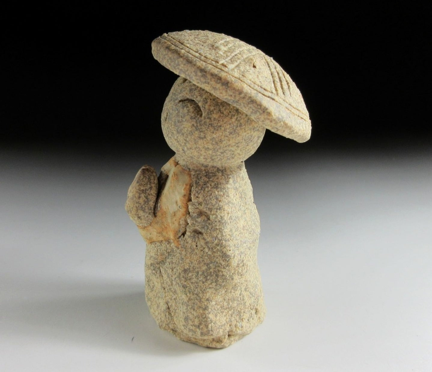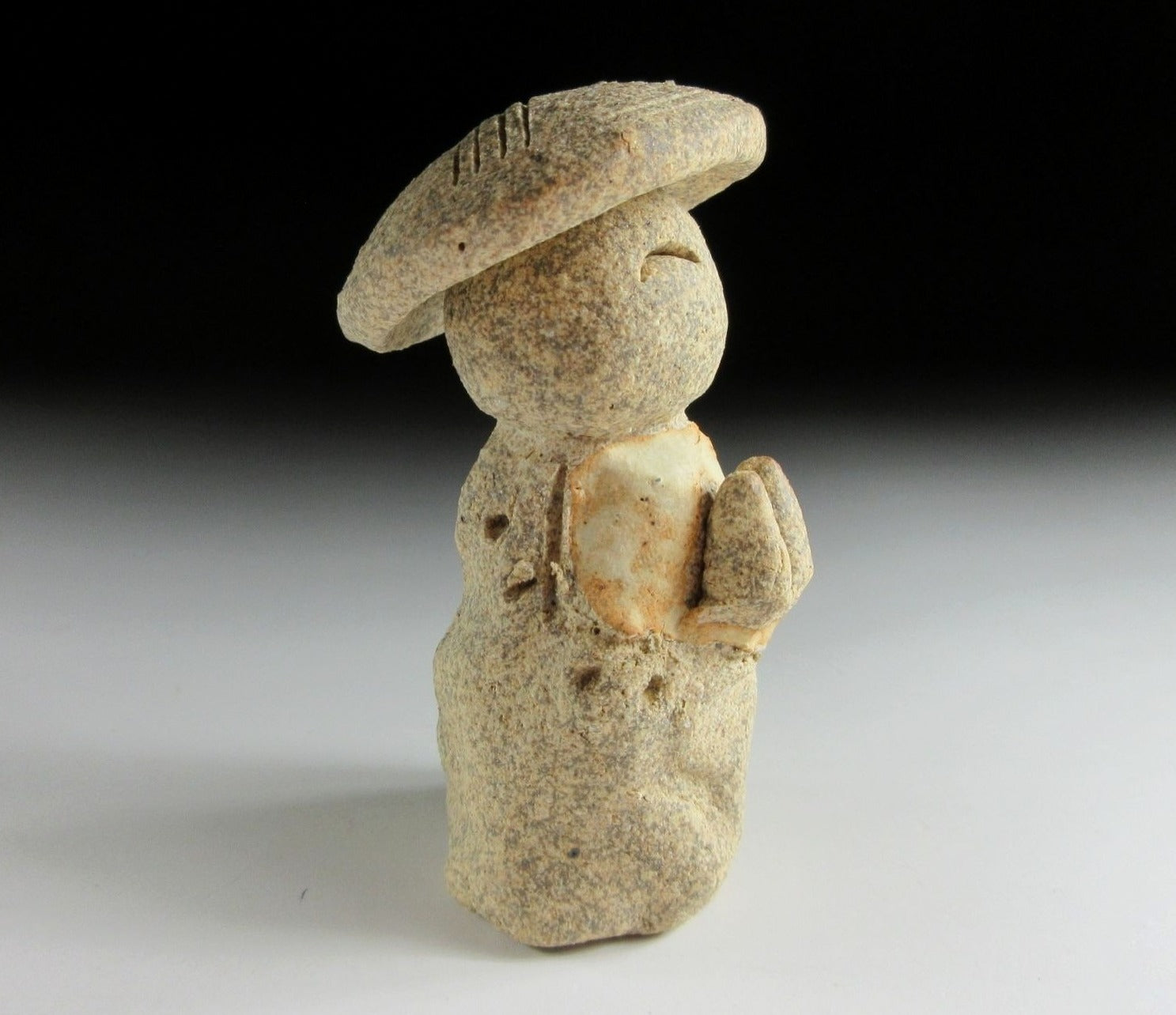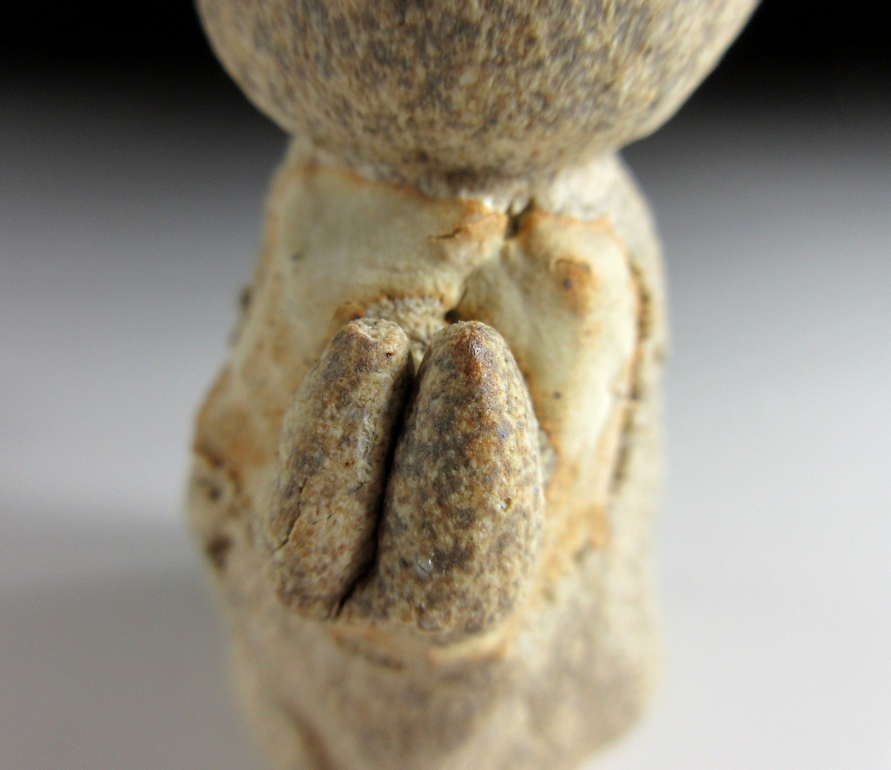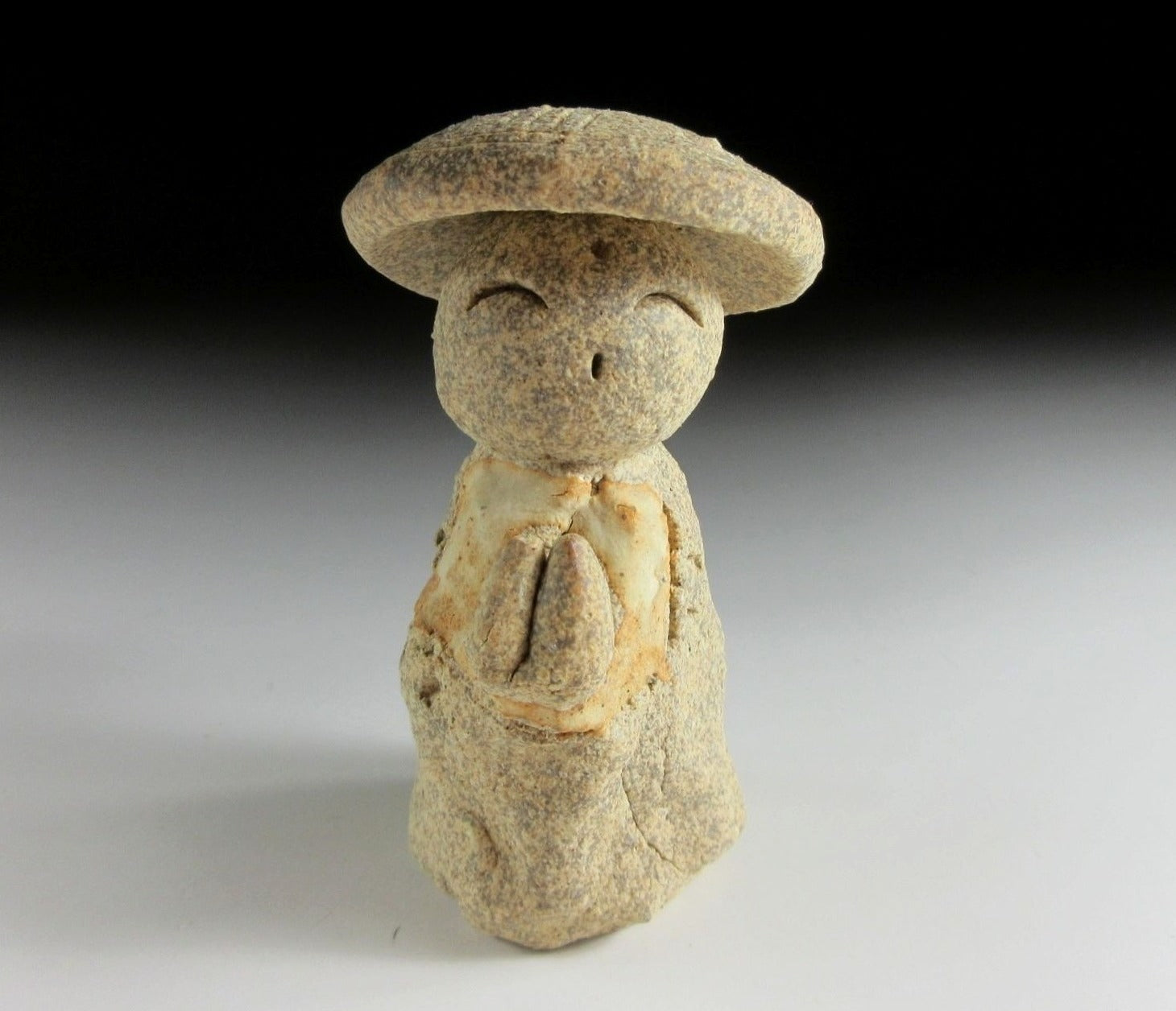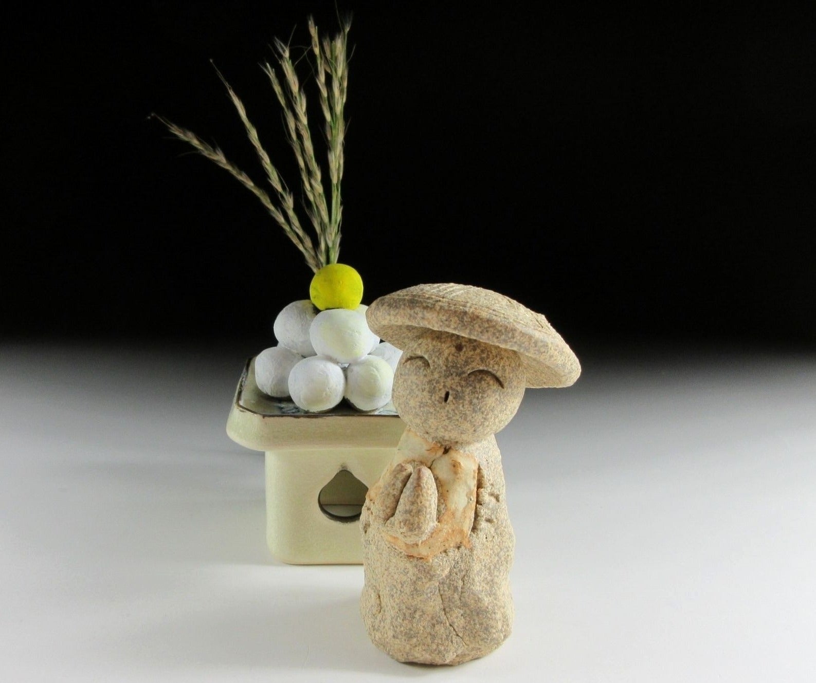 This listing is for a small Shigaraki jizo. It has been hand-shaped and is modelled on the children’s story named Kasajizo. Kasajizo is a story about a poor old hat maker and his wife. It was just before New Year and the old couple were running very low on food. A baby mouse appeared looking for food scraps, so the old man gave the little mouse some of the last rice they had left. To thank the old man the parents of the mouse went out into the snow and gathered some straw so he could make hats. The old couple were so happy for their help, and they all sat down and got to work on making some hats to sell for food. When the hats were finished, the old man set off for town so he could make some money and buy some food for New Year. On the way into town he noticed that the heads of the jizo statues were covered in snow. He felt sorry for them and used his towel to wipe off the snow. After this he continued on into town. The town was busy but nobody wanted to buy a hat from the old man. Night drew near and the people disappeared. Saddened he began to make the journey back home. Just as he was passing the jizo statues he noticed once more that their heads were covered in snow. He felt so sorry for them out in the cold, so he decided to give the straw hats to them for protection. He only had five hats, but there were six jizo. He thought about it and decided to give the other jizo his towel. He wrapped the towel around the jizo’s head and then continued on towards home. The mice were excited to see the empty load, but the old man told them the story. His wife said that he did a good thing by giving the jizo the hats, and prepared some hot water and a few beans for their dinner. Then in the middle of the night they were awoken by voices. The voices were calling out, “New Year’s delivery! New Year’s delivery! Where is the house of the old hat seller!” Everyone was astonished to see the jizo pulling a sleigh laden with food for the New Year. One jizo piped up and said, “Old man, thank you very much for the hats. We leave this food in return for your kindness.” Then off they went. The next day the old man set off with a load of mochi and special New Year food for the jizo. He set down the food and said, “Jizo sama, I can now make an offering to you - Happy New Year!”